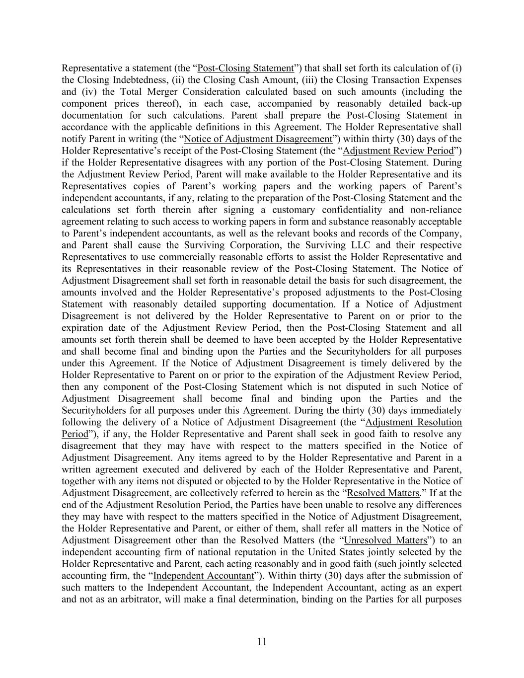 11 Representative a statement (the “Post-Closing Statement”) that shall set forth its calculation of (i) the Closing Indebtedness, (ii) the Closing Cash Amount, (iii) the Closing Transaction Expenses and (iv) the Total Merger Consideration calculated based on such amounts (including the component prices thereof), in each case, accompanied by reasonably detailed back-up documentation for such calculations. Parent shall prepare the Post-Closing Statement in accordance with the applicable definitions in this Agreement. The Holder Representative shall notify Parent in writing (the “Notice of Adjustment Disagreement”) within thirty (30) days of the Holder Representative’s receipt of the Post-Closing Statement (the “Adjustment Review Period”) if the Holder Representative disagrees with any portion of the Post-Closing Statement. During the Adjustment Review Period, Parent will make available to the Holder Representative and its Representatives copies of Parent’s working papers and the working papers of Parent’s independent accountants, if any, relating to the preparation of the Post-Closing Statement and the calculations set forth therein after signing a customary confidentiality and non-reliance agreement relating to such access to working papers in form and substance reasonably acceptable to Parent’s independent accountants, as well as the relevant books and records of the Company, and Parent shall cause the Surviving Corporation, the Surviving LLC and their respective Representatives to use commercially reasonable efforts to assist the Holder Representative and its Representatives in their reasonable review of the Post-Closing Statement. The Notice of Adjustment Disagreement shall set forth in reasonable detail the basis for such disagreement, the amounts involved and the Holder Representative’s proposed adjustments to the Post-Closing Statement with reasonably detailed supporting documentation. If a Notice of Adjustment Disagreement is not delivered by the Holder Representative to Parent on or prior to the expiration date of the Adjustment Review Period, then the Post-Closing Statement and all amounts set forth therein shall be deemed to have been accepted by the Holder Representative and shall become final and binding upon the Parties and the Securityholders for all purposes under this Agreement. If the Notice of Adjustment Disagreement is timely delivered by the Holder Representative to Parent on or prior to the expiration of the Adjustment Review Period, then any component of the Post-Closing Statement which is not disputed in such Notice of Adjustment Disagreement shall become final and binding upon the Parties and the Securityholders for all purposes under this Agreement. During the thirty (30) days immediately following the delivery of a Notice of Adjustment Disagreement (the “Adjustment Resolution Period”), if any, the Holder Representative and Parent shall seek in good faith to resolve any disagreement that they may have with respect to the matters specified in the Notice of Adjustment Disagreement. Any items agreed to by the Holder Representative and Parent in a written agreement executed and delivered by each of the Holder Representative and Parent, together with any items not disputed or objected to by the Holder Representative in the Notice of Adjustment Disagreement, are collectively referred to herein as the “Resolved Matters.” If at the end of the Adjustment Resolution Period, the Parties have been unable to resolve any differences they may have with respect to the matters specified in the Notice of Adjustment Disagreement, the Holder Representative and Parent, or either of them, shall refer all matters in the Notice of Adjustment Disagreement other than the Resolved Matters (the “Unresolved Matters”) to an independent accounting firm of national reputation in the United States jointly selected by the Holder Representative and Parent, each acting reasonably and in good faith (such jointly selected accounting firm, the “Independent Accountant”). Within thirty (30) days after the submission of such matters to the Independent Accountant, the Independent Accountant, acting as an expert and not as an arbitrator, will make a final determination, binding on the Parties for all purposes