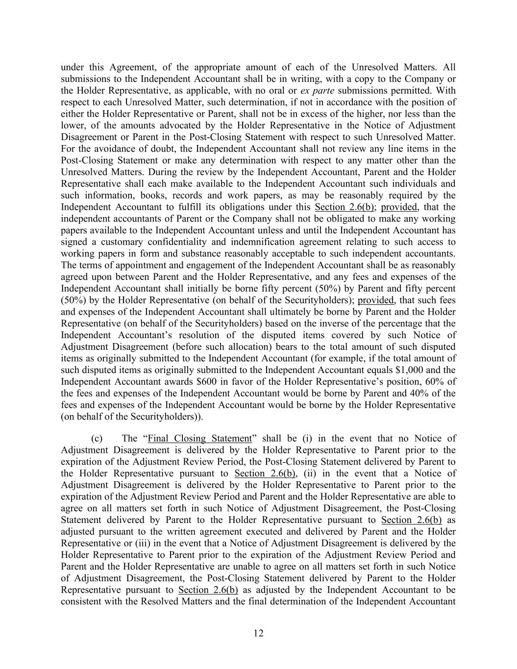 12 under this Agreement, of the appropriate amount of each of the Unresolved Matters. All submissions to the Independent Accountant shall be in writing, with a copy to the Company or the Holder Representative, as applicable, with no oral or ex parte submissions permitted. With respect to each Unresolved Matter, such determination, if not in accordance with the position of either the Holder Representative or Parent, shall not be in excess of the higher, nor less than the lower, of the amounts advocated by the Holder Representative in the Notice of Adjustment Disagreement or Parent in the Post-Closing Statement with respect to such Unresolved Matter. For the avoidance of doubt, the Independent Accountant shall not review any line items in the Post-Closing Statement or make any determination with respect to any matter other than the Unresolved Matters. During the review by the Independent Accountant, Parent and the Holder Representative shall each make available to the Independent Accountant such individuals and such information, books, records and work papers, as may be reasonably required by the Independent Accountant to fulfill its obligations under this Section 2.6(b); provided, that the independent accountants of Parent or the Company shall not be obligated to make any working papers available to the Independent Accountant unless and until the Independent Accountant has signed a customary confidentiality and indemnification agreement relating to such access to working papers in form and substance reasonably acceptable to such independent accountants. The terms of appointment and engagement of the Independent Accountant shall be as reasonably agreed upon between Parent and the Holder Representative, and any fees and expenses of the Independent Accountant shall initially be borne fifty percent (50%) by Parent and fifty percent (50%) by the Holder Representative (on behalf of the Securityholders); provided, that such fees and expenses of the Independent Accountant shall ultimately be borne by Parent and the Holder Representative (on behalf of the Securityholders) based on the inverse of the percentage that the Independent Accountant’s resolution of the disputed items covered by such Notice of Adjustment Disagreement (before such allocation) bears to the total amount of such disputed items as originally submitted to the Independent Accountant (for example, if the total amount of such disputed items as originally submitted to the Independent Accountant equals $1,000 and the Independent Accountant awards $600 in favor of the Holder Representative’s position, 60% of the fees and expenses of the Independent Accountant would be borne by Parent and 40% of the fees and expenses of the Independent Accountant would be borne by the Holder Representative (on behalf of the Securityholders)). (c) The “Final Closing Statement” shall be (i) in the event that no Notice of Adjustment Disagreement is delivered by the Holder Representative to Parent prior to the expiration of the Adjustment Review Period, the Post-Closing Statement delivered by Parent to the Holder Representative pursuant to Section 2.6(b), (ii) in the event that a Notice of Adjustment Disagreement is delivered by the Holder Representative to Parent prior to the expiration of the Adjustment Review Period and Parent and the Holder Representative are able to agree on all matters set forth in such Notice of Adjustment Disagreement, the Post-Closing Statement delivered by Parent to the Holder Representative pursuant to Section 2.6(b) as adjusted pursuant to the written agreement executed and delivered by Parent and the Holder Representative or (iii) in the event that a Notice of Adjustment Disagreement is delivered by the Holder Representative to Parent prior to the expiration of the Adjustment Review Period and Parent and the Holder Representative are unable to agree on all matters set forth in such Notice of Adjustment Disagreement, the Post-Closing Statement delivered by Parent to the Holder Representative pursuant to Section 2.6(b) as adjusted by the Independent Accountant to be consistent with the Resolved Matters and the final determination of the Independent Accountant