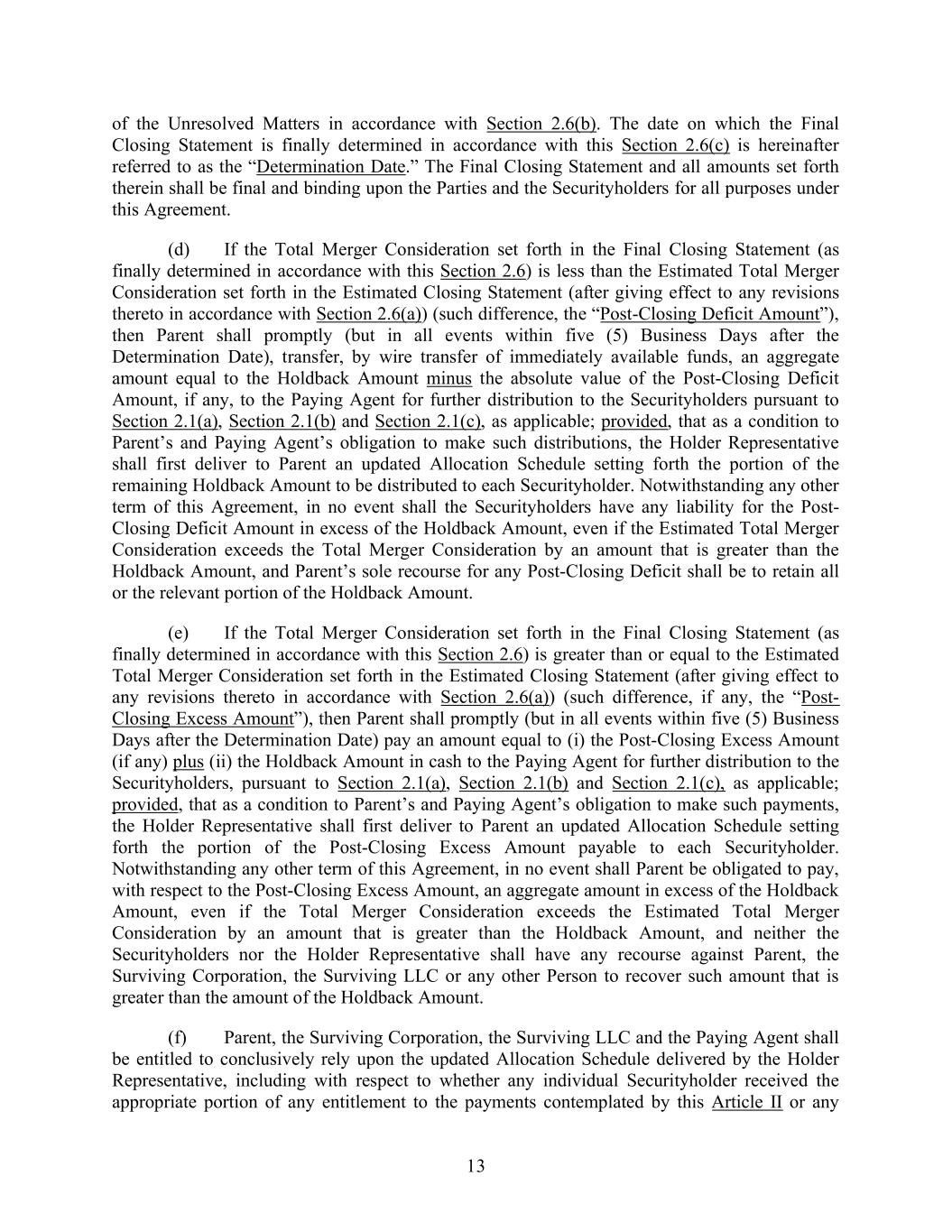 13 of the Unresolved Matters in accordance with Section 2.6(b). The date on which the Final Closing Statement is finally determined in accordance with this Section 2.6(c) is hereinafter referred to as the “Determination Date.” The Final Closing Statement and all amounts set forth therein shall be final and binding upon the Parties and the Securityholders for all purposes under this Agreement. (d) If the Total Merger Consideration set forth in the Final Closing Statement (as finally determined in accordance with this Section 2.6) is less than the Estimated Total Merger Consideration set forth in the Estimated Closing Statement (after giving effect to any revisions thereto in accordance with Section 2.6(a)) (such difference, the “Post-Closing Deficit Amount”), then Parent shall promptly (but in all events within five (5) Business Days after the Determination Date), transfer, by wire transfer of immediately available funds, an aggregate amount equal to the Holdback Amount minus the absolute value of the Post-Closing Deficit Amount, if any, to the Paying Agent for further distribution to the Securityholders pursuant to Section 2.1(a), Section 2.1(b) and Section 2.1(c), as applicable; provided, that as a condition to Parent’s and Paying Agent’s obligation to make such distributions, the Holder Representative shall first deliver to Parent an updated Allocation Schedule setting forth the portion of the remaining Holdback Amount to be distributed to each Securityholder. Notwithstanding any other term of this Agreement, in no event shall the Securityholders have any liability for the Post- Closing Deficit Amount in excess of the Holdback Amount, even if the Estimated Total Merger Consideration exceeds the Total Merger Consideration by an amount that is greater than the Holdback Amount, and Parent’s sole recourse for any Post-Closing Deficit shall be to retain all or the relevant portion of the Holdback Amount. (e) If the Total Merger Consideration set forth in the Final Closing Statement (as finally determined in accordance with this Section 2.6) is greater than or equal to the Estimated Total Merger Consideration set forth in the Estimated Closing Statement (after giving effect to any revisions thereto in accordance with Section 2.6(a)) (such difference, if any, the “Post- Closing Excess Amount”), then Parent shall promptly (but in all events within five (5) Business Days after the Determination Date) pay an amount equal to (i) the Post-Closing Excess Amount (if any) plus (ii) the Holdback Amount in cash to the Paying Agent for further distribution to the Securityholders, pursuant to Section 2.1(a), Section 2.1(b) and Section 2.1(c), as applicable; provided, that as a condition to Parent’s and Paying Agent’s obligation to make such payments, the Holder Representative shall first deliver to Parent an updated Allocation Schedule setting forth the portion of the Post-Closing Excess Amount payable to each Securityholder. Notwithstanding any other term of this Agreement, in no event shall Parent be obligated to pay, with respect to the Post-Closing Excess Amount, an aggregate amount in excess of the Holdback Amount, even if the Total Merger Consideration exceeds the Estimated Total Merger Consideration by an amount that is greater than the Holdback Amount, and neither the Securityholders nor the Holder Representative shall have any recourse against Parent, the Surviving Corporation, the Surviving LLC or any other Person to recover such amount that is greater than the amount of the Holdback Amount. (f) Parent, the Surviving Corporation, the Surviving LLC and the Paying Agent shall be entitled to conclusively rely upon the updated Allocation Schedule delivered by the Holder Representative, including with respect to whether any individual Securityholder received the appropriate portion of any entitlement to the payments contemplated by this Article II or any
