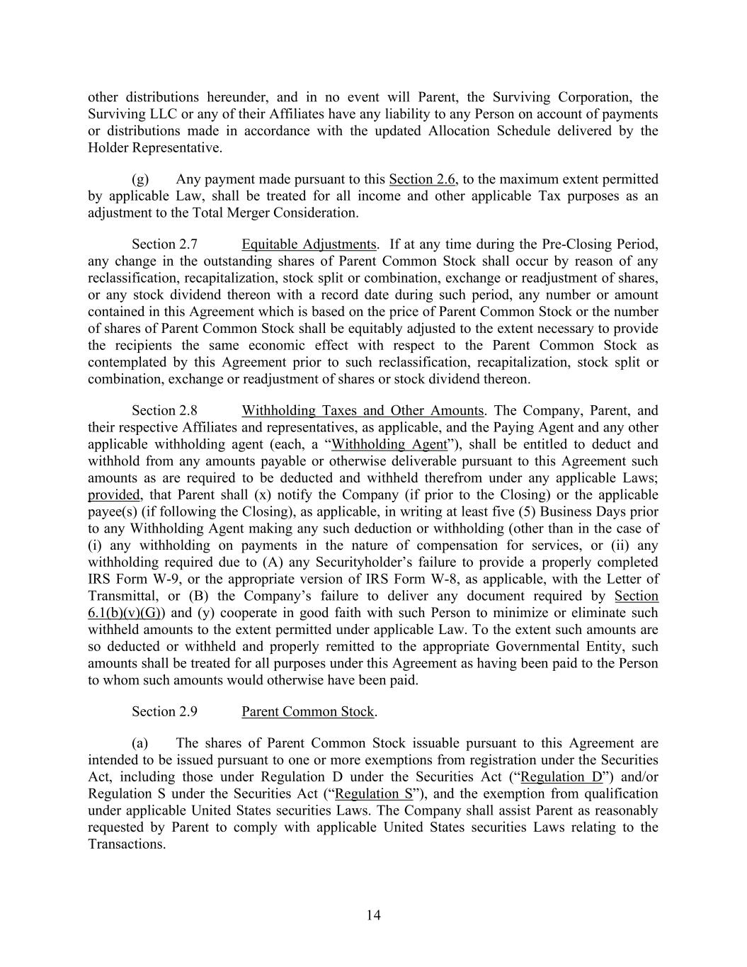14 other distributions hereunder, and in no event will Parent, the Surviving Corporation, the Surviving LLC or any of their Affiliates have any liability to any Person on account of payments or distributions made in accordance with the updated Allocation Schedule delivered by the Holder Representative. (g) Any payment made pursuant to this Section 2.6, to the maximum extent permitted by applicable Law, shall be treated for all income and other applicable Tax purposes as an adjustment to the Total Merger Consideration. Section 2.7 Equitable Adjustments. If at any time during the Pre-Closing Period, any change in the outstanding shares of Parent Common Stock shall occur by reason of any reclassification, recapitalization, stock split or combination, exchange or readjustment of shares, or any stock dividend thereon with a record date during such period, any number or amount contained in this Agreement which is based on the price of Parent Common Stock or the number of shares of Parent Common Stock shall be equitably adjusted to the extent necessary to provide the recipients the same economic effect with respect to the Parent Common Stock as contemplated by this Agreement prior to such reclassification, recapitalization, stock split or combination, exchange or readjustment of shares or stock dividend thereon. Section 2.8 Withholding Taxes and Other Amounts. The Company, Parent, and their respective Affiliates and representatives, as applicable, and the Paying Agent and any other applicable withholding agent (each, a “Withholding Agent”), shall be entitled to deduct and withhold from any amounts payable or otherwise deliverable pursuant to this Agreement such amounts as are required to be deducted and withheld therefrom under any applicable Laws; provided, that Parent shall (x) notify the Company (if prior to the Closing) or the applicable payee(s) (if following the Closing), as applicable, in writing at least five (5) Business Days prior to any Withholding Agent making any such deduction or withholding (other than in the case of (i) any withholding on payments in the nature of compensation for services, or (ii) any withholding required due to (A) any Securityholder’s failure to provide a properly completed IRS Form W-9, or the appropriate version of IRS Form W-8, as applicable, with the Letter of Transmittal, or (B) the Company’s failure to deliver any document required by Section 6.1(b)(v)(G)) and (y) cooperate in good faith with such Person to minimize or eliminate such withheld amounts to the extent permitted under applicable Law. To the extent such amounts are so deducted or withheld and properly remitted to the appropriate Governmental Entity, such amounts shall be treated for all purposes under this Agreement as having been paid to the Person to whom such amounts would otherwise have been paid. Section 2.9 Parent Common Stock. (a) The shares of Parent Common Stock issuable pursuant to this Agreement are intended to be issued pursuant to one or more exemptions from registration under the Securities Act, including those under Regulation D under the Securities Act (“Regulation D”) and/or Regulation S under the Securities Act (“Regulation S”), and the exemption from qualification under applicable United States securities Laws. The Company shall assist Parent as reasonably requested by Parent to comply with applicable United States securities Laws relating to the Transactions.