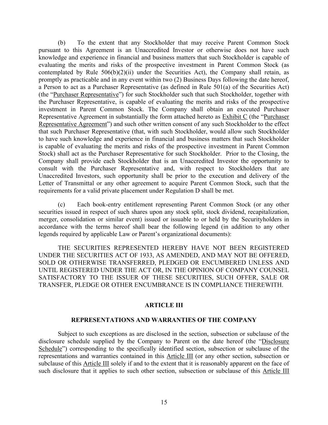 15 (b) To the extent that any Stockholder that may receive Parent Common Stock pursuant to this Agreement is an Unaccredited Investor or otherwise does not have such knowledge and experience in financial and business matters that such Stockholder is capable of evaluating the merits and risks of the prospective investment in Parent Common Stock (as contemplated by Rule 506(b)(2)(ii) under the Securities Act), the Company shall retain, as promptly as practicable and in any event within two (2) Business Days following the date hereof, a Person to act as a Purchaser Representative (as defined in Rule 501(a) of the Securities Act) (the “Purchaser Representative”) for such Stockholder such that such Stockholder, together with the Purchaser Representative, is capable of evaluating the merits and risks of the prospective investment in Parent Common Stock. The Company shall obtain an executed Purchaser Representative Agreement in substantially the form attached hereto as Exhibit C (the “Purchaser Representative Agreement”) and such other written consent of any such Stockholder to the effect that such Purchaser Representative (that, with such Stockholder, would allow such Stockholder to have such knowledge and experience in financial and business matters that such Stockholder is capable of evaluating the merits and risks of the prospective investment in Parent Common Stock) shall act as the Purchaser Representative for such Stockholder. Prior to the Closing, the Company shall provide each Stockholder that is an Unaccredited Investor the opportunity to consult with the Purchaser Representative and, with respect to Stockholders that are Unaccredited Investors, such opportunity shall be prior to the execution and delivery of the Letter of Transmittal or any other agreement to acquire Parent Common Stock, such that the requirements for a valid private placement under Regulation D shall be met. (c) Each book-entry entitlement representing Parent Common Stock (or any other securities issued in respect of such shares upon any stock split, stock dividend, recapitalization, merger, consolidation or similar event) issued or issuable to or held by the Securityholders in accordance with the terms hereof shall bear the following legend (in addition to any other legends required by applicable Law or Parent’s organizational documents): THE SECURITIES REPRESENTED HEREBY HAVE NOT BEEN REGISTERED UNDER THE SECURITIES ACT OF 1933, AS AMENDED, AND MAY NOT BE OFFERED, SOLD OR OTHERWISE TRANSFERRED, PLEDGED OR ENCUMBERED UNLESS AND UNTIL REGISTERED UNDER THE ACT OR, IN THE OPINION OF COMPANY COUNSEL SATISFACTORY TO THE ISSUER OF THESE SECURITIES, SUCH OFFER, SALE OR TRANSFER, PLEDGE OR OTHER ENCUMBRANCE IS IN COMPLIANCE THEREWITH. ARTICLE III REPRESENTATIONS AND WARRANTIES OF THE COMPANY Subject to such exceptions as are disclosed in the section, subsection or subclause of the disclosure schedule supplied by the Company to Parent on the date hereof (the “Disclosure Schedule”) corresponding to the specifically identified section, subsection or subclause of the representations and warranties contained in this Article III (or any other section, subsection or subclause of this Article III solely if and to the extent that it is reasonably apparent on the face of such disclosure that it applies to such other section, subsection or subclause of this Article III