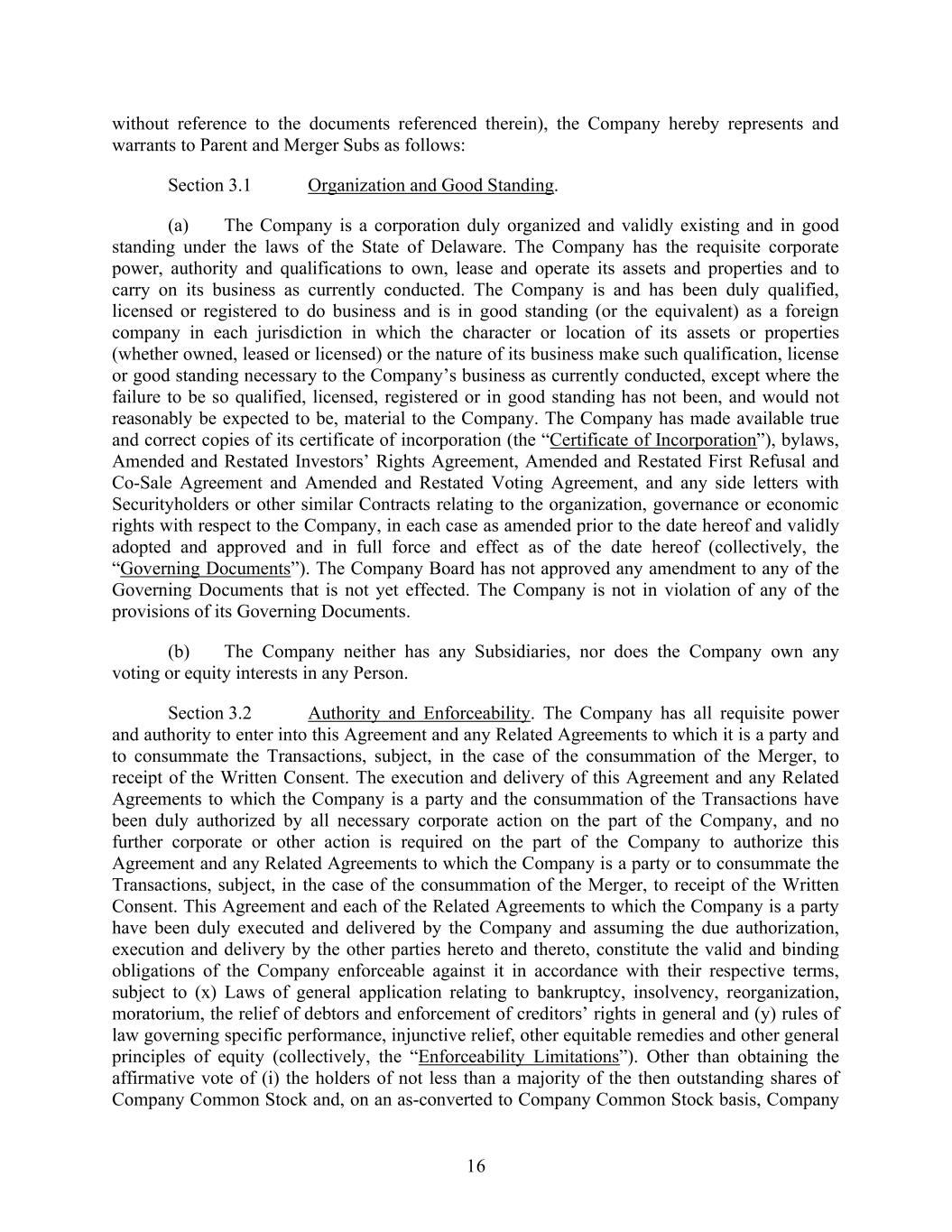 16 without reference to the documents referenced therein), the Company hereby represents and warrants to Parent and Merger Subs as follows: Section 3.1 Organization and Good Standing. (a) The Company is a corporation duly organized and validly existing and in good standing under the laws of the State of Delaware. The Company has the requisite corporate power, authority and qualifications to own, lease and operate its assets and properties and to carry on its business as currently conducted. The Company is and has been duly qualified, licensed or registered to do business and is in good standing (or the equivalent) as a foreign company in each jurisdiction in which the character or location of its assets or properties (whether owned, leased or licensed) or the nature of its business make such qualification, license or good standing necessary to the Company’s business as currently conducted, except where the failure to be so qualified, licensed, registered or in good standing has not been, and would not reasonably be expected to be, material to the Company. The Company has made available true and correct copies of its certificate of incorporation (the “Certificate of Incorporation”), bylaws, Amended and Restated Investors’ Rights Agreement, Amended and Restated First Refusal and Co-Sale Agreement and Amended and Restated Voting Agreement, and any side letters with Securityholders or other similar Contracts relating to the organization, governance or economic rights with respect to the Company, in each case as amended prior to the date hereof and validly adopted and approved and in full force and effect as of the date hereof (collectively, the “Governing Documents”). The Company Board has not approved any amendment to any of the Governing Documents that is not yet effected. The Company is not in violation of any of the provisions of its Governing Documents. (b) The Company neither has any Subsidiaries, nor does the Company own any voting or equity interests in any Person. Section 3.2 Authority and Enforceability. The Company has all requisite power and authority to enter into this Agreement and any Related Agreements to which it is a party and to consummate the Transactions, subject, in the case of the consummation of the Merger, to receipt of the Written Consent. The execution and delivery of this Agreement and any Related Agreements to which the Company is a party and the consummation of the Transactions have been duly authorized by all necessary corporate action on the part of the Company, and no further corporate or other action is required on the part of the Company to authorize this Agreement and any Related Agreements to which the Company is a party or to consummate the Transactions, subject, in the case of the consummation of the Merger, to receipt of the Written Consent. This Agreement and each of the Related Agreements to which the Company is a party have been duly executed and delivered by the Company and assuming the due authorization, execution and delivery by the other parties hereto and thereto, constitute the valid and binding obligations of the Company enforceable against it in accordance with their respective terms, subject to (x) Laws of general application relating to bankruptcy, insolvency, reorganization, moratorium, the relief of debtors and enforcement of creditors’ rights in general and (y) rules of law governing specific performance, injunctive relief, other equitable remedies and other general principles of equity (collectively, the “Enforceability Limitations”). Other than obtaining the affirmative vote of (i) the holders of not less than a majority of the then outstanding shares of Company Common Stock and, on an as-converted to Company Common Stock basis, Company