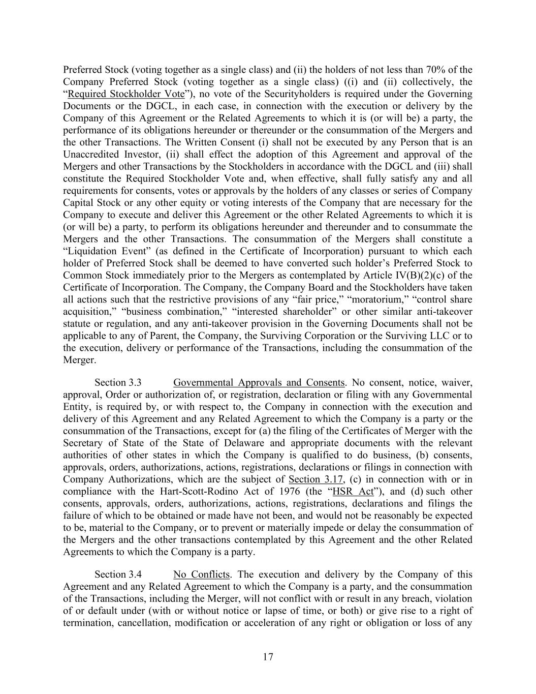 17 Preferred Stock (voting together as a single class) and (ii) the holders of not less than 70% of the Company Preferred Stock (voting together as a single class) ((i) and (ii) collectively, the “Required Stockholder Vote”), no vote of the Securityholders is required under the Governing Documents or the DGCL, in each case, in connection with the execution or delivery by the Company of this Agreement or the Related Agreements to which it is (or will be) a party, the performance of its obligations hereunder or thereunder or the consummation of the Mergers and the other Transactions. The Written Consent (i) shall not be executed by any Person that is an Unaccredited Investor, (ii) shall effect the adoption of this Agreement and approval of the Mergers and other Transactions by the Stockholders in accordance with the DGCL and (iii) shall constitute the Required Stockholder Vote and, when effective, shall fully satisfy any and all requirements for consents, votes or approvals by the holders of any classes or series of Company Capital Stock or any other equity or voting interests of the Company that are necessary for the Company to execute and deliver this Agreement or the other Related Agreements to which it is (or will be) a party, to perform its obligations hereunder and thereunder and to consummate the Mergers and the other Transactions. The consummation of the Mergers shall constitute a “Liquidation Event” (as defined in the Certificate of Incorporation) pursuant to which each holder of Preferred Stock shall be deemed to have converted such holder’s Preferred Stock to Common Stock immediately prior to the Mergers as contemplated by Article IV(B)(2)(c) of the Certificate of Incorporation. The Company, the Company Board and the Stockholders have taken all actions such that the restrictive provisions of any “fair price,” “moratorium,” “control share acquisition,” “business combination,” “interested shareholder” or other similar anti-takeover statute or regulation, and any anti-takeover provision in the Governing Documents shall not be applicable to any of Parent, the Company, the Surviving Corporation or the Surviving LLC or to the execution, delivery or performance of the Transactions, including the consummation of the Merger. Section 3.3 Governmental Approvals and Consents. No consent, notice, waiver, approval, Order or authorization of, or registration, declaration or filing with any Governmental Entity, is required by, or with respect to, the Company in connection with the execution and delivery of this Agreement and any Related Agreement to which the Company is a party or the consummation of the Transactions, except for (a) the filing of the Certificates of Merger with the Secretary of State of the State of Delaware and appropriate documents with the relevant authorities of other states in which the Company is qualified to do business, (b) consents, approvals, orders, authorizations, actions, registrations, declarations or filings in connection with Company Authorizations, which are the subject of Section 3.17, (c) in connection with or in compliance with the Hart-Scott-Rodino Act of 1976 (the “HSR Act”), and (d) such other consents, approvals, orders, authorizations, actions, registrations, declarations and filings the failure of which to be obtained or made have not been, and would not be reasonably be expected to be, material to the Company, or to prevent or materially impede or delay the consummation of the Mergers and the other transactions contemplated by this Agreement and the other Related Agreements to which the Company is a party. Section 3.4 No Conflicts. The execution and delivery by the Company of this Agreement and any Related Agreement to which the Company is a party, and the consummation of the Transactions, including the Merger, will not conflict with or result in any breach, violation of or default under (with or without notice or lapse of time, or both) or give rise to a right of termination, cancellation, modification or acceleration of any right or obligation or loss of any