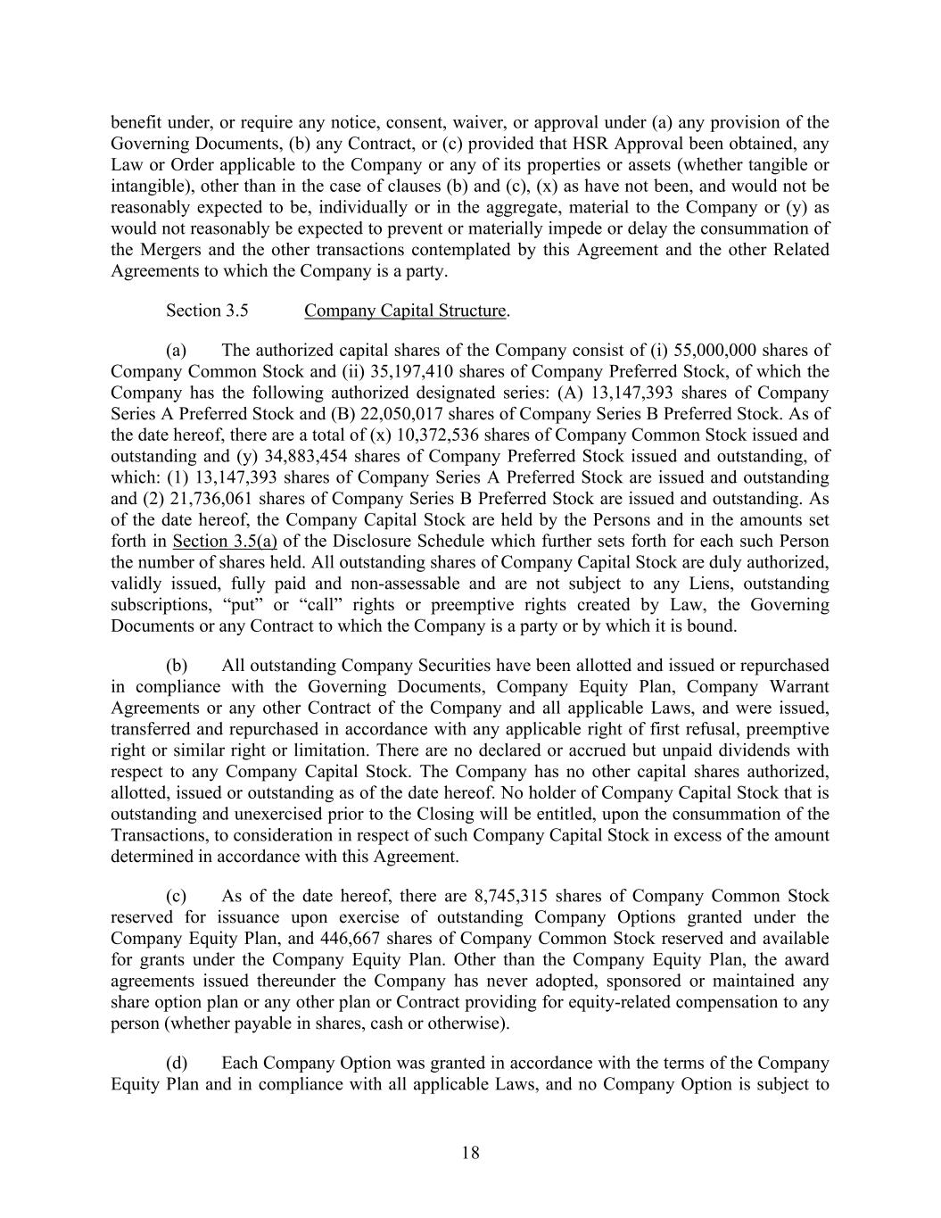18 benefit under, or require any notice, consent, waiver, or approval under (a) any provision of the Governing Documents, (b) any Contract, or (c) provided that HSR Approval been obtained, any Law or Order applicable to the Company or any of its properties or assets (whether tangible or intangible), other than in the case of clauses (b) and (c), (x) as have not been, and would not be reasonably expected to be, individually or in the aggregate, material to the Company or (y) as would not reasonably be expected to prevent or materially impede or delay the consummation of the Mergers and the other transactions contemplated by this Agreement and the other Related Agreements to which the Company is a party. Section 3.5 Company Capital Structure. (a) The authorized capital shares of the Company consist of (i) 55,000,000 shares of Company Common Stock and (ii) 35,197,410 shares of Company Preferred Stock, of which the Company has the following authorized designated series: (A) 13,147,393 shares of Company Series A Preferred Stock and (B) 22,050,017 shares of Company Series B Preferred Stock. As of the date hereof, there are a total of (x) 10,372,536 shares of Company Common Stock issued and outstanding and (y) 34,883,454 shares of Company Preferred Stock issued and outstanding, of which: (1) 13,147,393 shares of Company Series A Preferred Stock are issued and outstanding and (2) 21,736,061 shares of Company Series B Preferred Stock are issued and outstanding. As of the date hereof, the Company Capital Stock are held by the Persons and in the amounts set forth in Section 3.5(a) of the Disclosure Schedule which further sets forth for each such Person the number of shares held. All outstanding shares of Company Capital Stock are duly authorized, validly issued, fully paid and non-assessable and are not subject to any Liens, outstanding subscriptions, “put” or “call” rights or preemptive rights created by Law, the Governing Documents or any Contract to which the Company is a party or by which it is bound. (b) All outstanding Company Securities have been allotted and issued or repurchased in compliance with the Governing Documents, Company Equity Plan, Company Warrant Agreements or any other Contract of the Company and all applicable Laws, and were issued, transferred and repurchased in accordance with any applicable right of first refusal, preemptive right or similar right or limitation. There are no declared or accrued but unpaid dividends with respect to any Company Capital Stock. The Company has no other capital shares authorized, allotted, issued or outstanding as of the date hereof. No holder of Company Capital Stock that is outstanding and unexercised prior to the Closing will be entitled, upon the consummation of the Transactions, to consideration in respect of such Company Capital Stock in excess of the amount determined in accordance with this Agreement. (c) As of the date hereof, there are 8,745,315 shares of Company Common Stock reserved for issuance upon exercise of outstanding Company Options granted under the Company Equity Plan, and 446,667 shares of Company Common Stock reserved and available for grants under the Company Equity Plan. Other than the Company Equity Plan, the award agreements issued thereunder the Company has never adopted, sponsored or maintained any share option plan or any other plan or Contract providing for equity-related compensation to any person (whether payable in shares, cash or otherwise). (d) Each Company Option was granted in accordance with the terms of the Company Equity Plan and in compliance with all applicable Laws, and no Company Option is subject to