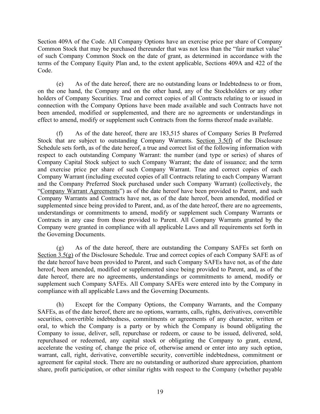 19 Section 409A of the Code. All Company Options have an exercise price per share of Company Common Stock that may be purchased thereunder that was not less than the “fair market value” of such Company Common Stock on the date of grant, as determined in accordance with the terms of the Company Equity Plan and, to the extent applicable, Sections 409A and 422 of the Code. (e) As of the date hereof, there are no outstanding loans or Indebtedness to or from, on the one hand, the Company and on the other hand, any of the Stockholders or any other holders of Company Securities. True and correct copies of all Contracts relating to or issued in connection with the Company Options have been made available and such Contracts have not been amended, modified or supplemented, and there are no agreements or understandings in effect to amend, modify or supplement such Contracts from the forms thereof made available. (f) As of the date hereof, there are 183,515 shares of Company Series B Preferred Stock that are subject to outstanding Company Warrants. Section 3.5(f) of the Disclosure Schedule sets forth, as of the date hereof, a true and correct list of the following information with respect to each outstanding Company Warrant: the number (and type or series) of shares of Company Capital Stock subject to such Company Warrant; the date of issuance; and the term and exercise price per share of such Company Warrant. True and correct copies of each Company Warrant (including executed copies of all Contracts relating to each Company Warrant and the Company Preferred Stock purchased under such Company Warrant) (collectively, the “Company Warrant Agreements”) as of the date hereof have been provided to Parent, and such Company Warrants and Contracts have not, as of the date hereof, been amended, modified or supplemented since being provided to Parent, and, as of the date hereof, there are no agreements, understandings or commitments to amend, modify or supplement such Company Warrants or Contracts in any case from those provided to Parent. All Company Warrants granted by the Company were granted in compliance with all applicable Laws and all requirements set forth in the Governing Documents. (g) As of the date hereof, there are outstanding the Company SAFEs set forth on Section 3.5(g) of the Disclosure Schedule. True and correct copies of each Company SAFE as of the date hereof have been provided to Parent, and such Company SAFEs have not, as of the date hereof, been amended, modified or supplemented since being provided to Parent, and, as of the date hereof, there are no agreements, understandings or commitments to amend, modify or supplement such Company SAFEs. All Company SAFEs were entered into by the Company in compliance with all applicable Laws and the Governing Documents. (h) Except for the Company Options, the Company Warrants, and the Company SAFEs, as of the date hereof, there are no options, warrants, calls, rights, derivatives, convertible securities, convertible indebtedness, commitments or agreements of any character, written or oral, to which the Company is a party or by which the Company is bound obligating the Company to issue, deliver, sell, repurchase or redeem, or cause to be issued, delivered, sold, repurchased or redeemed, any capital stock or obligating the Company to grant, extend, accelerate the vesting of, change the price of, otherwise amend or enter into any such option, warrant, call, right, derivative, convertible security, convertible indebtedness, commitment or agreement for capital stock. There are no outstanding or authorized share appreciation, phantom share, profit participation, or other similar rights with respect to the Company (whether payable