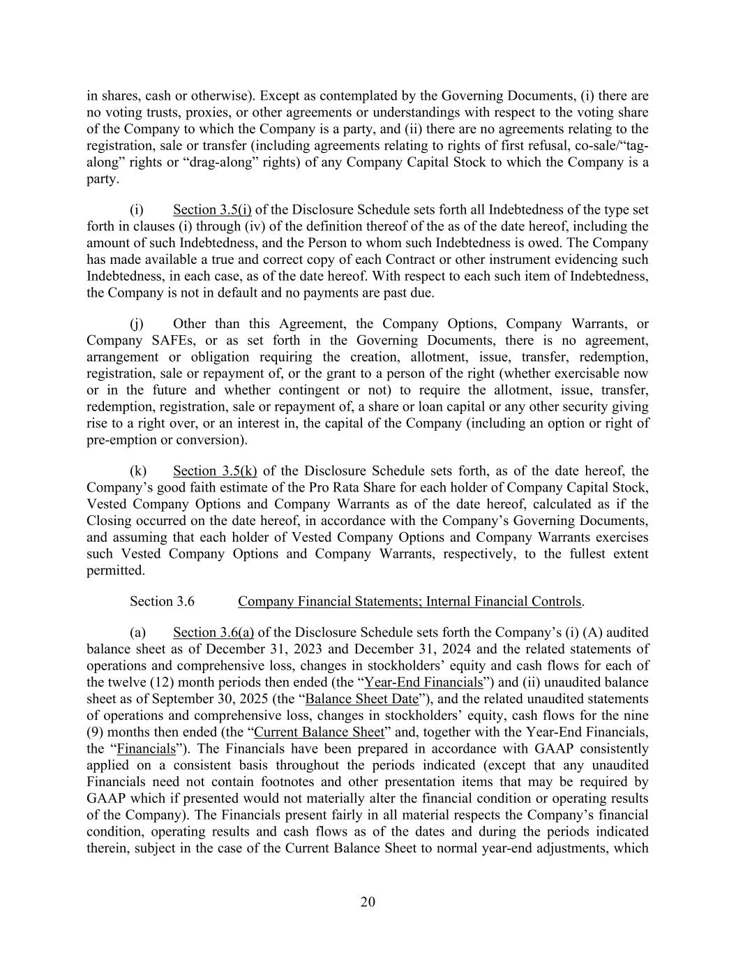 20 in shares, cash or otherwise). Except as contemplated by the Governing Documents, (i) there are no voting trusts, proxies, or other agreements or understandings with respect to the voting share of the Company to which the Company is a party, and (ii) there are no agreements relating to the registration, sale or transfer (including agreements relating to rights of first refusal, co-sale/“tag- along” rights or “drag-along” rights) of any Company Capital Stock to which the Company is a party. (i) Section 3.5(i) of the Disclosure Schedule sets forth all Indebtedness of the type set forth in clauses (i) through (iv) of the definition thereof of the as of the date hereof, including the amount of such Indebtedness, and the Person to whom such Indebtedness is owed. The Company has made available a true and correct copy of each Contract or other instrument evidencing such Indebtedness, in each case, as of the date hereof. With respect to each such item of Indebtedness, the Company is not in default and no payments are past due. (j) Other than this Agreement, the Company Options, Company Warrants, or Company SAFEs, or as set forth in the Governing Documents, there is no agreement, arrangement or obligation requiring the creation, allotment, issue, transfer, redemption, registration, sale or repayment of, or the grant to a person of the right (whether exercisable now or in the future and whether contingent or not) to require the allotment, issue, transfer, redemption, registration, sale or repayment of, a share or loan capital or any other security giving rise to a right over, or an interest in, the capital of the Company (including an option or right of pre-emption or conversion). (k) Section 3.5(k) of the Disclosure Schedule sets forth, as of the date hereof, the Company’s good faith estimate of the Pro Rata Share for each holder of Company Capital Stock, Vested Company Options and Company Warrants as of the date hereof, calculated as if the Closing occurred on the date hereof, in accordance with the Company’s Governing Documents, and assuming that each holder of Vested Company Options and Company Warrants exercises such Vested Company Options and Company Warrants, respectively, to the fullest extent permitted. Section 3.6 Company Financial Statements; Internal Financial Controls. (a) Section 3.6(a) of the Disclosure Schedule sets forth the Company’s (i) (A) audited balance sheet as of December 31, 2023 and December 31, 2024 and the related statements of operations and comprehensive loss, changes in stockholders’ equity and cash flows for each of the twelve (12) month periods then ended (the “Year-End Financials”) and (ii) unaudited balance sheet as of September 30, 2025 (the “Balance Sheet Date”), and the related unaudited statements of operations and comprehensive loss, changes in stockholders’ equity, cash flows for the nine (9) months then ended (the “Current Balance Sheet” and, together with the Year-End Financials, the “Financials”). The Financials have been prepared in accordance with GAAP consistently applied on a consistent basis throughout the periods indicated (except that any unaudited Financials need not contain footnotes and other presentation items that may be required by GAAP which if presented would not materially alter the financial condition or operating results of the Company). The Financials present fairly in all material respects the Company’s financial condition, operating results and cash flows as of the dates and during the periods indicated therein, subject in the case of the Current Balance Sheet to normal year-end adjustments, which