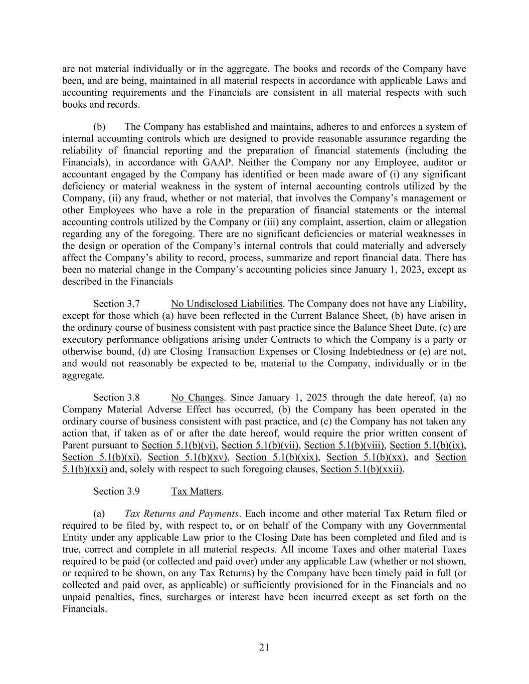 21 are not material individually or in the aggregate. The books and records of the Company have been, and are being, maintained in all material respects in accordance with applicable Laws and accounting requirements and the Financials are consistent in all material respects with such books and records. (b) The Company has established and maintains, adheres to and enforces a system of internal accounting controls which are designed to provide reasonable assurance regarding the reliability of financial reporting and the preparation of financial statements (including the Financials), in accordance with GAAP. Neither the Company nor any Employee, auditor or accountant engaged by the Company has identified or been made aware of (i) any significant deficiency or material weakness in the system of internal accounting controls utilized by the Company, (ii) any fraud, whether or not material, that involves the Company’s management or other Employees who have a role in the preparation of financial statements or the internal accounting controls utilized by the Company or (iii) any complaint, assertion, claim or allegation regarding any of the foregoing. There are no significant deficiencies or material weaknesses in the design or operation of the Company’s internal controls that could materially and adversely affect the Company’s ability to record, process, summarize and report financial data. There has been no material change in the Company’s accounting policies since January 1, 2023, except as described in the Financials Section 3.7 No Undisclosed Liabilities. The Company does not have any Liability, except for those which (a) have been reflected in the Current Balance Sheet, (b) have arisen in the ordinary course of business consistent with past practice since the Balance Sheet Date, (c) are executory performance obligations arising under Contracts to which the Company is a party or otherwise bound, (d) are Closing Transaction Expenses or Closing Indebtedness or (e) are not, and would not reasonably be expected to be, material to the Company, individually or in the aggregate. Section 3.8 No Changes. Since January 1, 2025 through the date hereof, (a) no Company Material Adverse Effect has occurred, (b) the Company has been operated in the ordinary course of business consistent with past practice, and (c) the Company has not taken any action that, if taken as of or after the date hereof, would require the prior written consent of Parent pursuant to Section 5.1(b)(vi), Section 5.1(b)(vii), Section 5.1(b)(viii), Section 5.1(b)(ix), Section 5.1(b)(xi), Section 5.1(b)(xv), Section 5.1(b)(xix), Section 5.1(b)(xx), and Section 5.1(b)(xxi) and, solely with respect to such foregoing clauses, Section 5.1(b)(xxii). Section 3.9 Tax Matters. (a) Tax Returns and Payments. Each income and other material Tax Return filed or required to be filed by, with respect to, or on behalf of the Company with any Governmental Entity under any applicable Law prior to the Closing Date has been completed and filed and is true, correct and complete in all material respects. All income Taxes and other material Taxes required to be paid (or collected and paid over) under any applicable Law (whether or not shown, or required to be shown, on any Tax Returns) by the Company have been timely paid in full (or collected and paid over, as applicable) or sufficiently provisioned for in the Financials and no unpaid penalties, fines, surcharges or interest have been incurred except as set forth on the Financials.