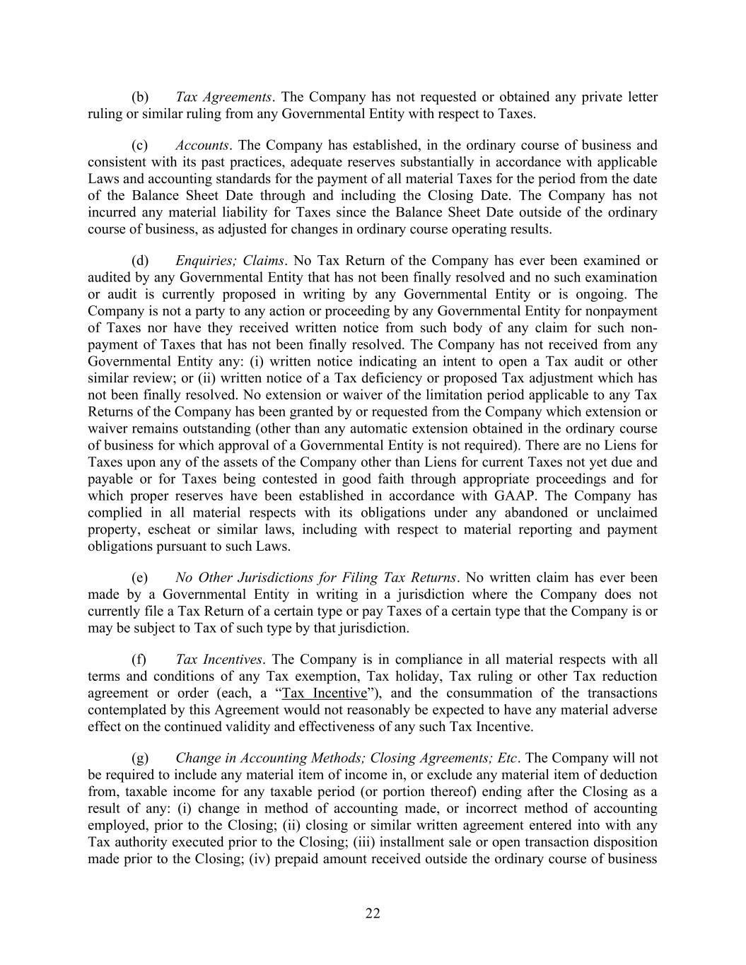 22 (b) Tax Agreements. The Company has not requested or obtained any private letter ruling or similar ruling from any Governmental Entity with respect to Taxes. (c) Accounts. The Company has established, in the ordinary course of business and consistent with its past practices, adequate reserves substantially in accordance with applicable Laws and accounting standards for the payment of all material Taxes for the period from the date of the Balance Sheet Date through and including the Closing Date. The Company has not incurred any material liability for Taxes since the Balance Sheet Date outside of the ordinary course of business, as adjusted for changes in ordinary course operating results. (d) Enquiries; Claims. No Tax Return of the Company has ever been examined or audited by any Governmental Entity that has not been finally resolved and no such examination or audit is currently proposed in writing by any Governmental Entity or is ongoing. The Company is not a party to any action or proceeding by any Governmental Entity for nonpayment of Taxes nor have they received written notice from such body of any claim for such non- payment of Taxes that has not been finally resolved. The Company has not received from any Governmental Entity any: (i) written notice indicating an intent to open a Tax audit or other similar review; or (ii) written notice of a Tax deficiency or proposed Tax adjustment which has not been finally resolved. No extension or waiver of the limitation period applicable to any Tax Returns of the Company has been granted by or requested from the Company which extension or waiver remains outstanding (other than any automatic extension obtained in the ordinary course of business for which approval of a Governmental Entity is not required). There are no Liens for Taxes upon any of the assets of the Company other than Liens for current Taxes not yet due and payable or for Taxes being contested in good faith through appropriate proceedings and for which proper reserves have been established in accordance with GAAP. The Company has complied in all material respects with its obligations under any abandoned or unclaimed property, escheat or similar laws, including with respect to material reporting and payment obligations pursuant to such Laws. (e) No Other Jurisdictions for Filing Tax Returns. No written claim has ever been made by a Governmental Entity in writing in a jurisdiction where the Company does not currently file a Tax Return of a certain type or pay Taxes of a certain type that the Company is or may be subject to Tax of such type by that jurisdiction. (f) Tax Incentives. The Company is in compliance in all material respects with all terms and conditions of any Tax exemption, Tax holiday, Tax ruling or other Tax reduction agreement or order (each, a “Tax Incentive”), and the consummation of the transactions contemplated by this Agreement would not reasonably be expected to have any material adverse effect on the continued validity and effectiveness of any such Tax Incentive. (g) Change in Accounting Methods; Closing Agreements; Etc. The Company will not be required to include any material item of income in, or exclude any material item of deduction from, taxable income for any taxable period (or portion thereof) ending after the Closing as a result of any: (i) change in method of accounting made, or incorrect method of accounting employed, prior to the Closing; (ii) closing or similar written agreement entered into with any Tax authority executed prior to the Closing; (iii) installment sale or open transaction disposition made prior to the Closing; (iv) prepaid amount received outside the ordinary course of business