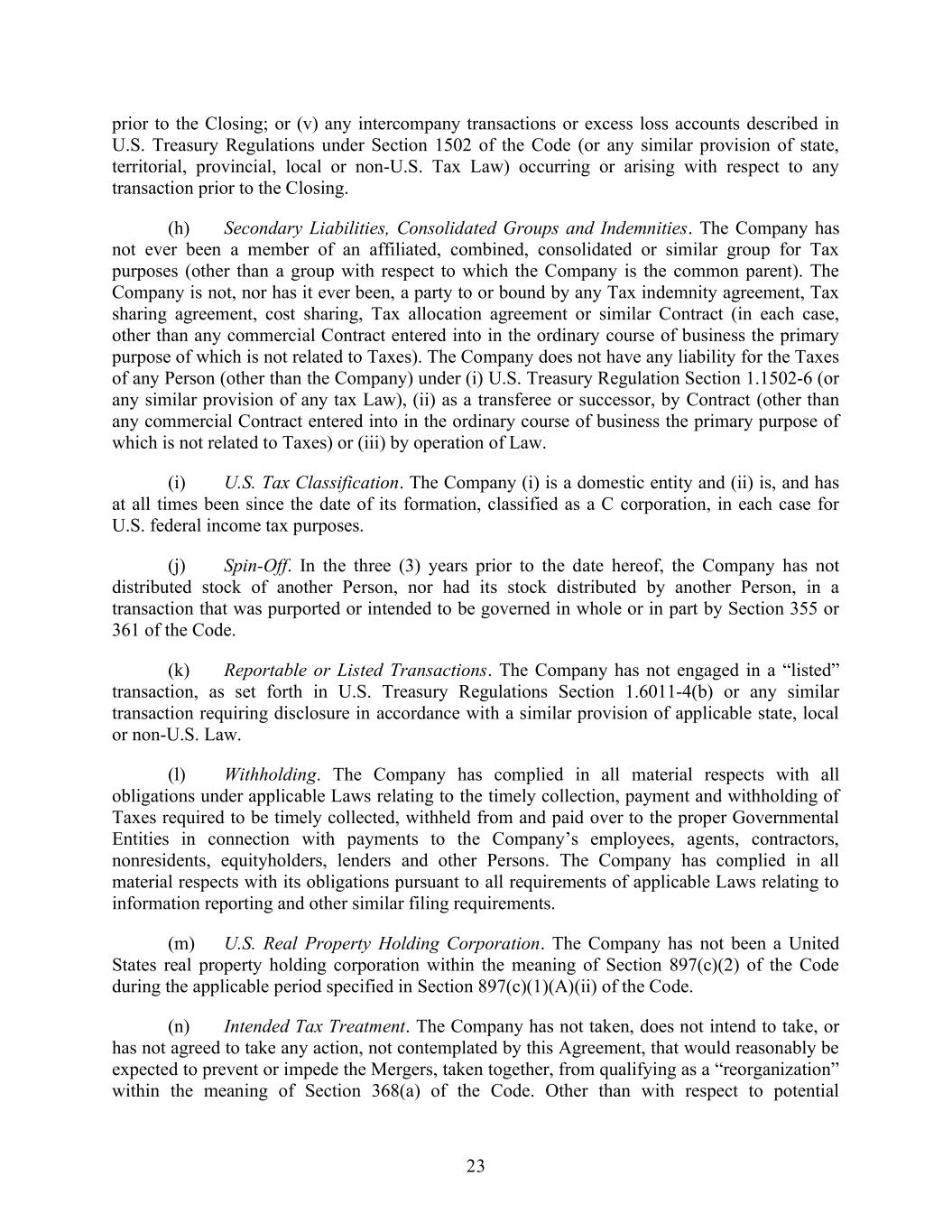 23 prior to the Closing; or (v) any intercompany transactions or excess loss accounts described in U.S. Treasury Regulations under Section 1502 of the Code (or any similar provision of state, territorial, provincial, local or non-U.S. Tax Law) occurring or arising with respect to any transaction prior to the Closing. (h) Secondary Liabilities, Consolidated Groups and Indemnities. The Company has not ever been a member of an affiliated, combined, consolidated or similar group for Tax purposes (other than a group with respect to which the Company is the common parent). The Company is not, nor has it ever been, a party to or bound by any Tax indemnity agreement, Tax sharing agreement, cost sharing, Tax allocation agreement or similar Contract (in each case, other than any commercial Contract entered into in the ordinary course of business the primary purpose of which is not related to Taxes). The Company does not have any liability for the Taxes of any Person (other than the Company) under (i) U.S. Treasury Regulation Section 1.1502-6 (or any similar provision of any tax Law), (ii) as a transferee or successor, by Contract (other than any commercial Contract entered into in the ordinary course of business the primary purpose of which is not related to Taxes) or (iii) by operation of Law. (i) U.S. Tax Classification. The Company (i) is a domestic entity and (ii) is, and has at all times been since the date of its formation, classified as a C corporation, in each case for U.S. federal income tax purposes. (j) Spin-Off. In the three (3) years prior to the date hereof, the Company has not distributed stock of another Person, nor had its stock distributed by another Person, in a transaction that was purported or intended to be governed in whole or in part by Section 355 or 361 of the Code. (k) Reportable or Listed Transactions. The Company has not engaged in a “listed” transaction, as set forth in U.S. Treasury Regulations Section 1.6011-4(b) or any similar transaction requiring disclosure in accordance with a similar provision of applicable state, local or non-U.S. Law. (l) Withholding. The Company has complied in all material respects with all obligations under applicable Laws relating to the timely collection, payment and withholding of Taxes required to be timely collected, withheld from and paid over to the proper Governmental Entities in connection with payments to the Company’s employees, agents, contractors, nonresidents, equityholders, lenders and other Persons. The Company has complied in all material respects with its obligations pursuant to all requirements of applicable Laws relating to information reporting and other similar filing requirements. (m) U.S. Real Property Holding Corporation. The Company has not been a United States real property holding corporation within the meaning of Section 897(c)(2) of the Code during the applicable period specified in Section 897(c)(1)(A)(ii) of the Code. (n) Intended Tax Treatment. The Company has not taken, does not intend to take, or has not agreed to take any action, not contemplated by this Agreement, that would reasonably be expected to prevent or impede the Mergers, taken together, from qualifying as a “reorganization” within the meaning of Section 368(a) of the Code. Other than with respect to potential