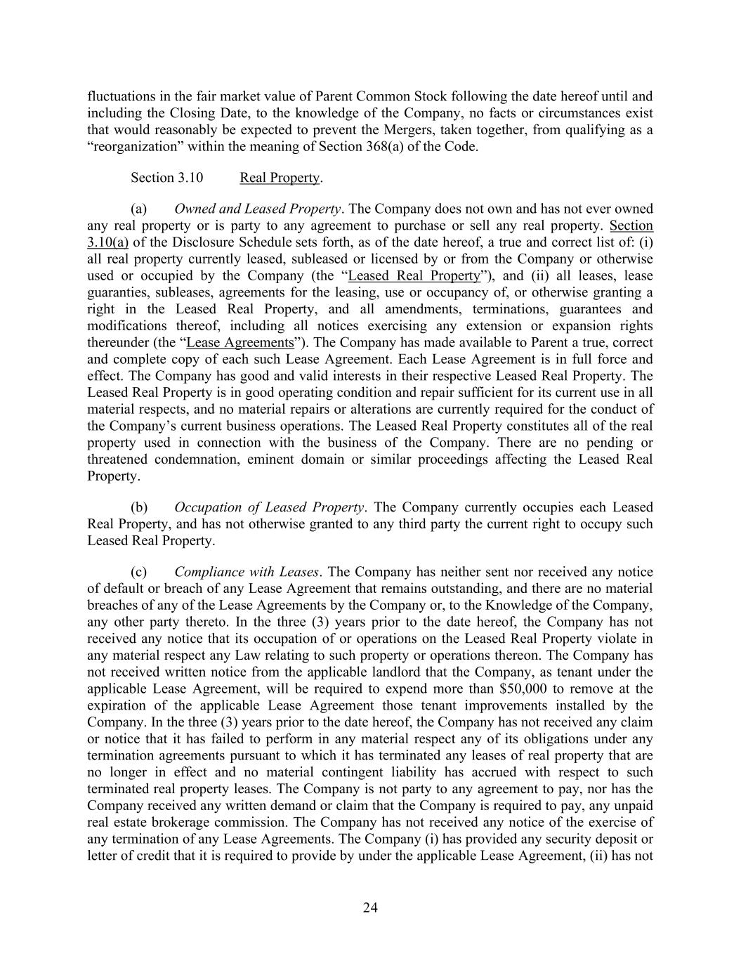 24 fluctuations in the fair market value of Parent Common Stock following the date hereof until and including the Closing Date, to the knowledge of the Company, no facts or circumstances exist that would reasonably be expected to prevent the Mergers, taken together, from qualifying as a “reorganization” within the meaning of Section 368(a) of the Code. Section 3.10 Real Property. (a) Owned and Leased Property. The Company does not own and has not ever owned any real property or is party to any agreement to purchase or sell any real property. Section 3.10(a) of the Disclosure Schedule sets forth, as of the date hereof, a true and correct list of: (i) all real property currently leased, subleased or licensed by or from the Company or otherwise used or occupied by the Company (the “Leased Real Property”), and (ii) all leases, lease guaranties, subleases, agreements for the leasing, use or occupancy of, or otherwise granting a right in the Leased Real Property, and all amendments, terminations, guarantees and modifications thereof, including all notices exercising any extension or expansion rights thereunder (the “Lease Agreements”). The Company has made available to Parent a true, correct and complete copy of each such Lease Agreement. Each Lease Agreement is in full force and effect. The Company has good and valid interests in their respective Leased Real Property. The Leased Real Property is in good operating condition and repair sufficient for its current use in all material respects, and no material repairs or alterations are currently required for the conduct of the Company’s current business operations. The Leased Real Property constitutes all of the real property used in connection with the business of the Company. There are no pending or threatened condemnation, eminent domain or similar proceedings affecting the Leased Real Property. (b) Occupation of Leased Property. The Company currently occupies each Leased Real Property, and has not otherwise granted to any third party the current right to occupy such Leased Real Property. (c) Compliance with Leases. The Company has neither sent nor received any notice of default or breach of any Lease Agreement that remains outstanding, and there are no material breaches of any of the Lease Agreements by the Company or, to the Knowledge of the Company, any other party thereto. In the three (3) years prior to the date hereof, the Company has not received any notice that its occupation of or operations on the Leased Real Property violate in any material respect any Law relating to such property or operations thereon. The Company has not received written notice from the applicable landlord that the Company, as tenant under the applicable Lease Agreement, will be required to expend more than $50,000 to remove at the expiration of the applicable Lease Agreement those tenant improvements installed by the Company. In the three (3) years prior to the date hereof, the Company has not received any claim or notice that it has failed to perform in any material respect any of its obligations under any termination agreements pursuant to which it has terminated any leases of real property that are no longer in effect and no material contingent liability has accrued with respect to such terminated real property leases. The Company is not party to any agreement to pay, nor has the Company received any written demand or claim that the Company is required to pay, any unpaid real estate brokerage commission. The Company has not received any notice of the exercise of any termination of any Lease Agreements. The Company (i) has provided any security deposit or letter of credit that it is required to provide by under the applicable Lease Agreement, (ii) has not