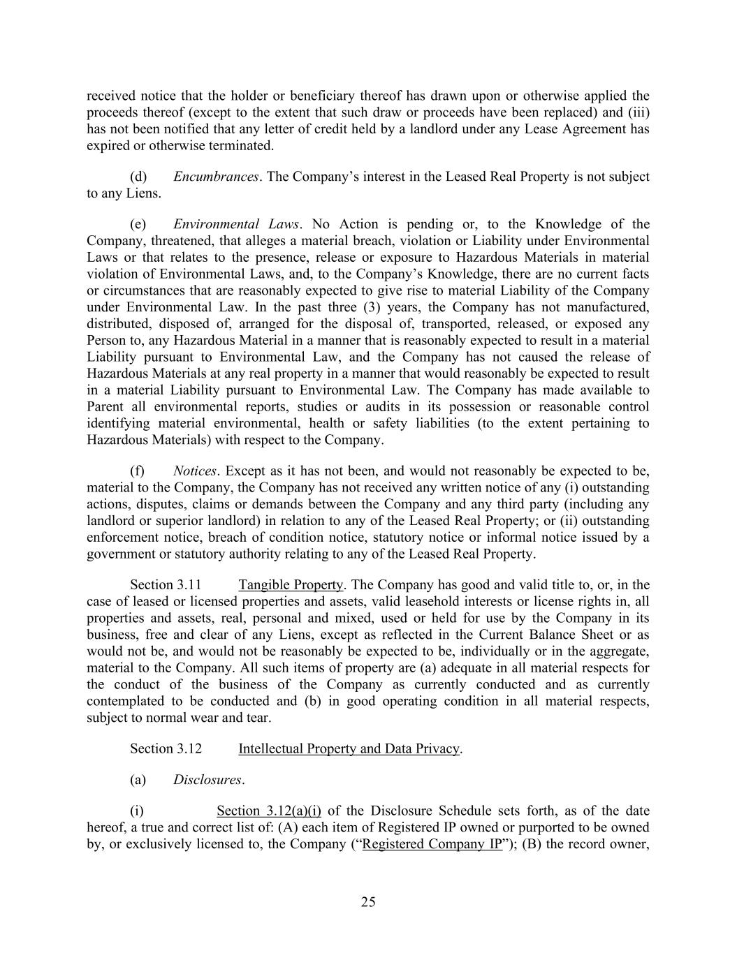 25 received notice that the holder or beneficiary thereof has drawn upon or otherwise applied the proceeds thereof (except to the extent that such draw or proceeds have been replaced) and (iii) has not been notified that any letter of credit held by a landlord under any Lease Agreement has expired or otherwise terminated. (d) Encumbrances. The Company’s interest in the Leased Real Property is not subject to any Liens. (e) Environmental Laws. No Action is pending or, to the Knowledge of the Company, threatened, that alleges a material breach, violation or Liability under Environmental Laws or that relates to the presence, release or exposure to Hazardous Materials in material violation of Environmental Laws, and, to the Company’s Knowledge, there are no current facts or circumstances that are reasonably expected to give rise to material Liability of the Company under Environmental Law. In the past three (3) years, the Company has not manufactured, distributed, disposed of, arranged for the disposal of, transported, released, or exposed any Person to, any Hazardous Material in a manner that is reasonably expected to result in a material Liability pursuant to Environmental Law, and the Company has not caused the release of Hazardous Materials at any real property in a manner that would reasonably be expected to result in a material Liability pursuant to Environmental Law. The Company has made available to Parent all environmental reports, studies or audits in its possession or reasonable control identifying material environmental, health or safety liabilities (to the extent pertaining to Hazardous Materials) with respect to the Company. (f) Notices. Except as it has not been, and would not reasonably be expected to be, material to the Company, the Company has not received any written notice of any (i) outstanding actions, disputes, claims or demands between the Company and any third party (including any landlord or superior landlord) in relation to any of the Leased Real Property; or (ii) outstanding enforcement notice, breach of condition notice, statutory notice or informal notice issued by a government or statutory authority relating to any of the Leased Real Property. Section 3.11 Tangible Property. The Company has good and valid title to, or, in the case of leased or licensed properties and assets, valid leasehold interests or license rights in, all properties and assets, real, personal and mixed, used or held for use by the Company in its business, free and clear of any Liens, except as reflected in the Current Balance Sheet or as would not be, and would not be reasonably be expected to be, individually or in the aggregate, material to the Company. All such items of property are (a) adequate in all material respects for the conduct of the business of the Company as currently conducted and as currently contemplated to be conducted and (b) in good operating condition in all material respects, subject to normal wear and tear. Section 3.12 Intellectual Property and Data Privacy. (a) Disclosures. (i) Section 3.12(a)(i) of the Disclosure Schedule sets forth, as of the date hereof, a true and correct list of: (A) each item of Registered IP owned or purported to be owned by, or exclusively licensed to, the Company (“Registered Company IP”); (B) the record owner,