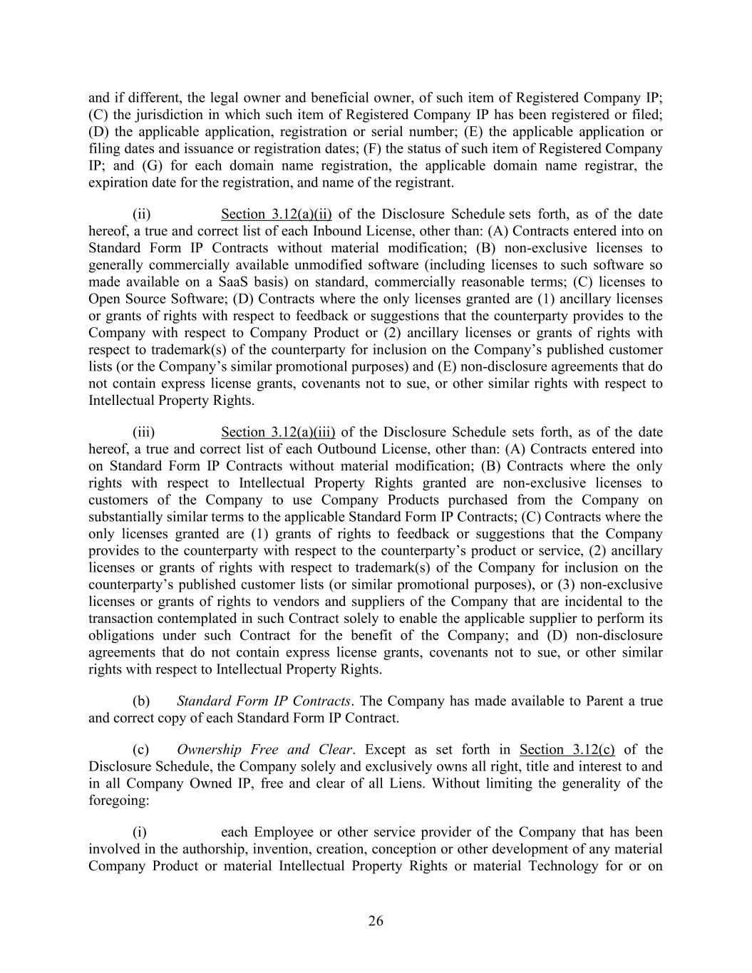 26 and if different, the legal owner and beneficial owner, of such item of Registered Company IP; (C) the jurisdiction in which such item of Registered Company IP has been registered or filed; (D) the applicable application, registration or serial number; (E) the applicable application or filing dates and issuance or registration dates; (F) the status of such item of Registered Company IP; and (G) for each domain name registration, the applicable domain name registrar, the expiration date for the registration, and name of the registrant. (ii) Section 3.12(a)(ii) of the Disclosure Schedule sets forth, as of the date hereof, a true and correct list of each Inbound License, other than: (A) Contracts entered into on Standard Form IP Contracts without material modification; (B) non-exclusive licenses to generally commercially available unmodified software (including licenses to such software so made available on a SaaS basis) on standard, commercially reasonable terms; (C) licenses to Open Source Software; (D) Contracts where the only licenses granted are (1) ancillary licenses or grants of rights with respect to feedback or suggestions that the counterparty provides to the Company with respect to Company Product or (2) ancillary licenses or grants of rights with respect to trademark(s) of the counterparty for inclusion on the Company’s published customer lists (or the Company’s similar promotional purposes) and (E) non-disclosure agreements that do not contain express license grants, covenants not to sue, or other similar rights with respect to Intellectual Property Rights. (iii) Section 3.12(a)(iii) of the Disclosure Schedule sets forth, as of the date hereof, a true and correct list of each Outbound License, other than: (A) Contracts entered into on Standard Form IP Contracts without material modification; (B) Contracts where the only rights with respect to Intellectual Property Rights granted are non-exclusive licenses to customers of the Company to use Company Products purchased from the Company on substantially similar terms to the applicable Standard Form IP Contracts; (C) Contracts where the only licenses granted are (1) grants of rights to feedback or suggestions that the Company provides to the counterparty with respect to the counterparty’s product or service, (2) ancillary licenses or grants of rights with respect to trademark(s) of the Company for inclusion on the counterparty’s published customer lists (or similar promotional purposes), or (3) non-exclusive licenses or grants of rights to vendors and suppliers of the Company that are incidental to the transaction contemplated in such Contract solely to enable the applicable supplier to perform its obligations under such Contract for the benefit of the Company; and (D) non-disclosure agreements that do not contain express license grants, covenants not to sue, or other similar rights with respect to Intellectual Property Rights. (b) Standard Form IP Contracts. The Company has made available to Parent a true and correct copy of each Standard Form IP Contract. (c) Ownership Free and Clear. Except as set forth in Section 3.12(c) of the Disclosure Schedule, the Company solely and exclusively owns all right, title and interest to and in all Company Owned IP, free and clear of all Liens. Without limiting the generality of the foregoing: (i) each Employee or other service provider of the Company that has been involved in the authorship, invention, creation, conception or other development of any material Company Product or material Intellectual Property Rights or material Technology for or on