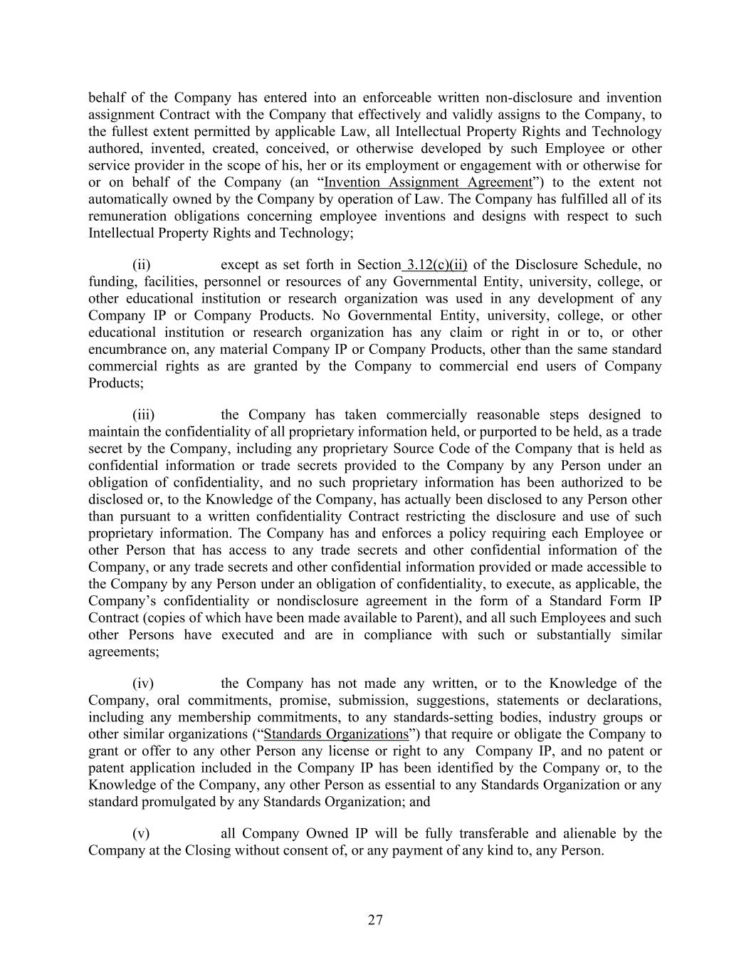 27 behalf of the Company has entered into an enforceable written non-disclosure and invention assignment Contract with the Company that effectively and validly assigns to the Company, to the fullest extent permitted by applicable Law, all Intellectual Property Rights and Technology authored, invented, created, conceived, or otherwise developed by such Employee or other service provider in the scope of his, her or its employment or engagement with or otherwise for or on behalf of the Company (an “Invention Assignment Agreement”) to the extent not automatically owned by the Company by operation of Law. The Company has fulfilled all of its remuneration obligations concerning employee inventions and designs with respect to such Intellectual Property Rights and Technology; (ii) except as set forth in Section 3.12(c)(ii) of the Disclosure Schedule, no funding, facilities, personnel or resources of any Governmental Entity, university, college, or other educational institution or research organization was used in any development of any Company IP or Company Products. No Governmental Entity, university, college, or other educational institution or research organization has any claim or right in or to, or other encumbrance on, any material Company IP or Company Products, other than the same standard commercial rights as are granted by the Company to commercial end users of Company Products; (iii) the Company has taken commercially reasonable steps designed to maintain the confidentiality of all proprietary information held, or purported to be held, as a trade secret by the Company, including any proprietary Source Code of the Company that is held as confidential information or trade secrets provided to the Company by any Person under an obligation of confidentiality, and no such proprietary information has been authorized to be disclosed or, to the Knowledge of the Company, has actually been disclosed to any Person other than pursuant to a written confidentiality Contract restricting the disclosure and use of such proprietary information. The Company has and enforces a policy requiring each Employee or other Person that has access to any trade secrets and other confidential information of the Company, or any trade secrets and other confidential information provided or made accessible to the Company by any Person under an obligation of confidentiality, to execute, as applicable, the Company’s confidentiality or nondisclosure agreement in the form of a Standard Form IP Contract (copies of which have been made available to Parent), and all such Employees and such other Persons have executed and are in compliance with such or substantially similar agreements; (iv) the Company has not made any written, or to the Knowledge of the Company, oral commitments, promise, submission, suggestions, statements or declarations, including any membership commitments, to any standards-setting bodies, industry groups or other similar organizations (“Standards Organizations”) that require or obligate the Company to grant or offer to any other Person any license or right to any Company IP, and no patent or patent application included in the Company IP has been identified by the Company or, to the Knowledge of the Company, any other Person as essential to any Standards Organization or any standard promulgated by any Standards Organization; and (v) all Company Owned IP will be fully transferable and alienable by the Company at the Closing without consent of, or any payment of any kind to, any Person.