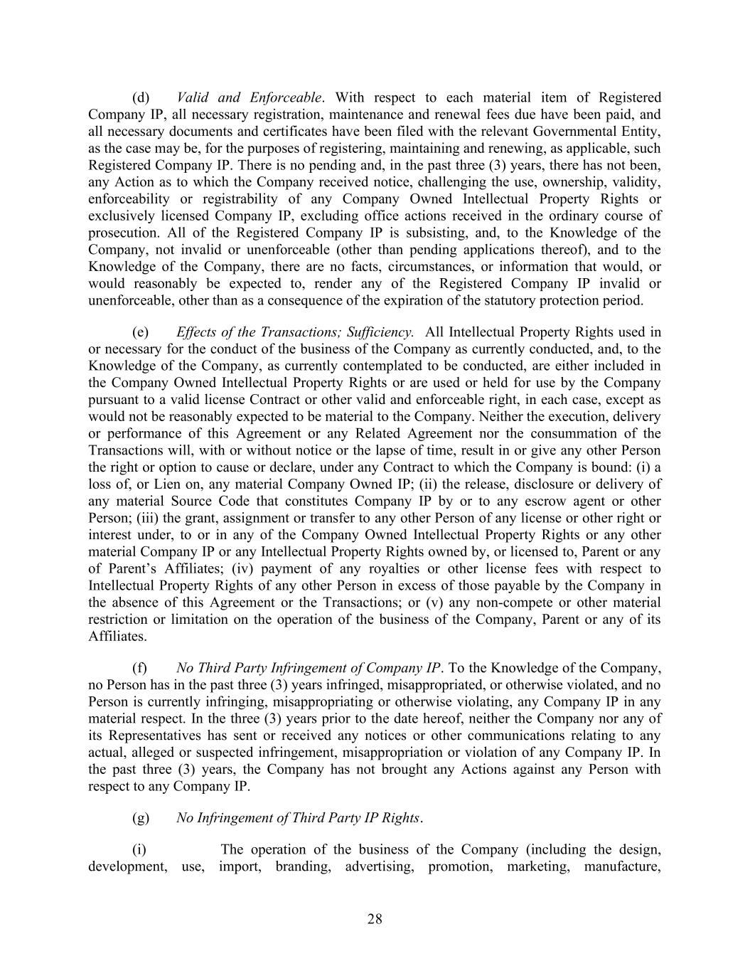 28 (d) Valid and Enforceable. With respect to each material item of Registered Company IP, all necessary registration, maintenance and renewal fees due have been paid, and all necessary documents and certificates have been filed with the relevant Governmental Entity, as the case may be, for the purposes of registering, maintaining and renewing, as applicable, such Registered Company IP. There is no pending and, in the past three (3) years, there has not been, any Action as to which the Company received notice, challenging the use, ownership, validity, enforceability or registrability of any Company Owned Intellectual Property Rights or exclusively licensed Company IP, excluding office actions received in the ordinary course of prosecution. All of the Registered Company IP is subsisting, and, to the Knowledge of the Company, not invalid or unenforceable (other than pending applications thereof), and to the Knowledge of the Company, there are no facts, circumstances, or information that would, or would reasonably be expected to, render any of the Registered Company IP invalid or unenforceable, other than as a consequence of the expiration of the statutory protection period. (e) Effects of the Transactions; Sufficiency. All Intellectual Property Rights used in or necessary for the conduct of the business of the Company as currently conducted, and, to the Knowledge of the Company, as currently contemplated to be conducted, are either included in the Company Owned Intellectual Property Rights or are used or held for use by the Company pursuant to a valid license Contract or other valid and enforceable right, in each case, except as would not be reasonably expected to be material to the Company. Neither the execution, delivery or performance of this Agreement or any Related Agreement nor the consummation of the Transactions will, with or without notice or the lapse of time, result in or give any other Person the right or option to cause or declare, under any Contract to which the Company is bound: (i) a loss of, or Lien on, any material Company Owned IP; (ii) the release, disclosure or delivery of any material Source Code that constitutes Company IP by or to any escrow agent or other Person; (iii) the grant, assignment or transfer to any other Person of any license or other right or interest under, to or in any of the Company Owned Intellectual Property Rights or any other material Company IP or any Intellectual Property Rights owned by, or licensed to, Parent or any of Parent’s Affiliates; (iv) payment of any royalties or other license fees with respect to Intellectual Property Rights of any other Person in excess of those payable by the Company in the absence of this Agreement or the Transactions; or (v) any non-compete or other material restriction or limitation on the operation of the business of the Company, Parent or any of its Affiliates. (f) No Third Party Infringement of Company IP. To the Knowledge of the Company, no Person has in the past three (3) years infringed, misappropriated, or otherwise violated, and no Person is currently infringing, misappropriating or otherwise violating, any Company IP in any material respect. In the three (3) years prior to the date hereof, neither the Company nor any of its Representatives has sent or received any notices or other communications relating to any actual, alleged or suspected infringement, misappropriation or violation of any Company IP. In the past three (3) years, the Company has not brought any Actions against any Person with respect to any Company IP. (g) No Infringement of Third Party IP Rights. (i) The operation of the business of the Company (including the design, development, use, import, branding, advertising, promotion, marketing, manufacture,