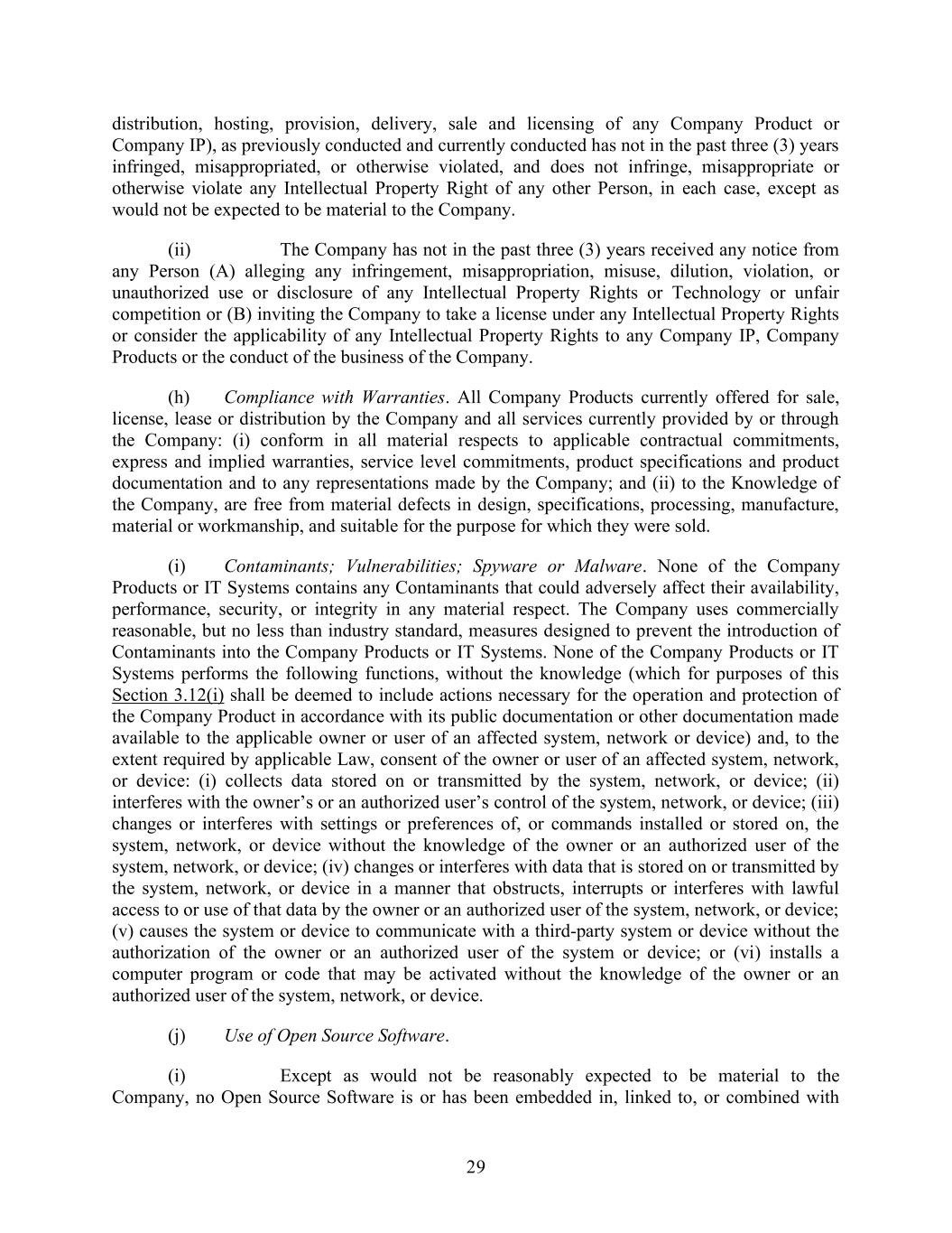 29 distribution, hosting, provision, delivery, sale and licensing of any Company Product or Company IP), as previously conducted and currently conducted has not in the past three (3) years infringed, misappropriated, or otherwise violated, and does not infringe, misappropriate or otherwise violate any Intellectual Property Right of any other Person, in each case, except as would not be expected to be material to the Company. (ii) The Company has not in the past three (3) years received any notice from any Person (A) alleging any infringement, misappropriation, misuse, dilution, violation, or unauthorized use or disclosure of any Intellectual Property Rights or Technology or unfair competition or (B) inviting the Company to take a license under any Intellectual Property Rights or consider the applicability of any Intellectual Property Rights to any Company IP, Company Products or the conduct of the business of the Company. (h) Compliance with Warranties. All Company Products currently offered for sale, license, lease or distribution by the Company and all services currently provided by or through the Company: (i) conform in all material respects to applicable contractual commitments, express and implied warranties, service level commitments, product specifications and product documentation and to any representations made by the Company; and (ii) to the Knowledge of the Company, are free from material defects in design, specifications, processing, manufacture, material or workmanship, and suitable for the purpose for which they were sold. (i) Contaminants; Vulnerabilities; Spyware or Malware. None of the Company Products or IT Systems contains any Contaminants that could adversely affect their availability, performance, security, or integrity in any material respect. The Company uses commercially reasonable, but no less than industry standard, measures designed to prevent the introduction of Contaminants into the Company Products or IT Systems. None of the Company Products or IT Systems performs the following functions, without the knowledge (which for purposes of this Section 3.12(i) shall be deemed to include actions necessary for the operation and protection of the Company Product in accordance with its public documentation or other documentation made available to the applicable owner or user of an affected system, network or device) and, to the extent required by applicable Law, consent of the owner or user of an affected system, network, or device: (i) collects data stored on or transmitted by the system, network, or device; (ii) interferes with the owner’s or an authorized user’s control of the system, network, or device; (iii) changes or interferes with settings or preferences of, or commands installed or stored on, the system, network, or device without the knowledge of the owner or an authorized user of the system, network, or device; (iv) changes or interferes with data that is stored on or transmitted by the system, network, or device in a manner that obstructs, interrupts or interferes with lawful access to or use of that data by the owner or an authorized user of the system, network, or device; (v) causes the system or device to communicate with a third-party system or device without the authorization of the owner or an authorized user of the system or device; or (vi) installs a computer program or code that may be activated without the knowledge of the owner or an authorized user of the system, network, or device. (j) Use of Open Source Software. (i) Except as would not be reasonably expected to be material to the Company, no Open Source Software is or has been embedded in, linked to, or combined with