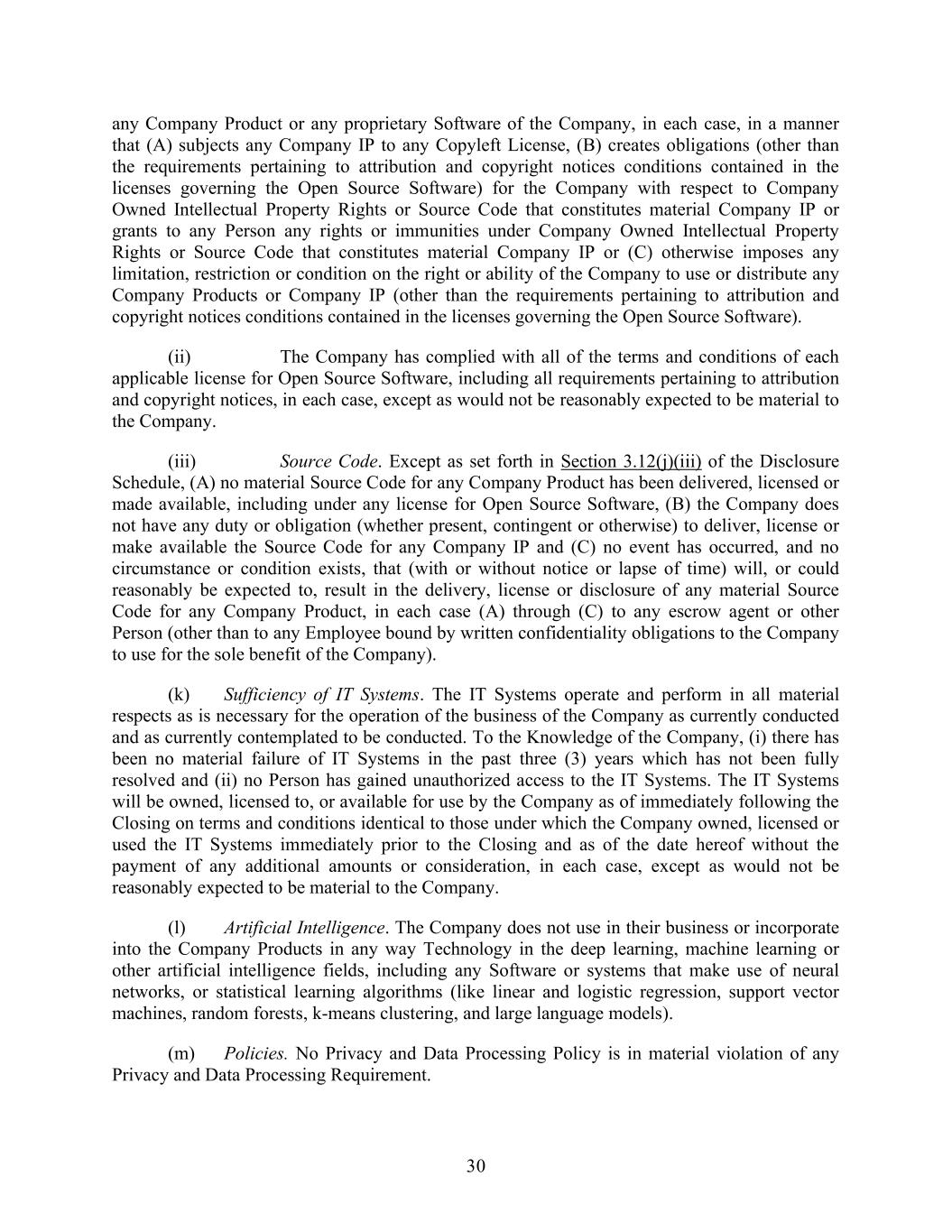 30 any Company Product or any proprietary Software of the Company, in each case, in a manner that (A) subjects any Company IP to any Copyleft License, (B) creates obligations (other than the requirements pertaining to attribution and copyright notices conditions contained in the licenses governing the Open Source Software) for the Company with respect to Company Owned Intellectual Property Rights or Source Code that constitutes material Company IP or grants to any Person any rights or immunities under Company Owned Intellectual Property Rights or Source Code that constitutes material Company IP or (C) otherwise imposes any limitation, restriction or condition on the right or ability of the Company to use or distribute any Company Products or Company IP (other than the requirements pertaining to attribution and copyright notices conditions contained in the licenses governing the Open Source Software). (ii) The Company has complied with all of the terms and conditions of each applicable license for Open Source Software, including all requirements pertaining to attribution and copyright notices, in each case, except as would not be reasonably expected to be material to the Company. (iii) Source Code. Except as set forth in Section 3.12(j)(iii) of the Disclosure Schedule, (A) no material Source Code for any Company Product has been delivered, licensed or made available, including under any license for Open Source Software, (B) the Company does not have any duty or obligation (whether present, contingent or otherwise) to deliver, license or make available the Source Code for any Company IP and (C) no event has occurred, and no circumstance or condition exists, that (with or without notice or lapse of time) will, or could reasonably be expected to, result in the delivery, license or disclosure of any material Source Code for any Company Product, in each case (A) through (C) to any escrow agent or other Person (other than to any Employee bound by written confidentiality obligations to the Company to use for the sole benefit of the Company). (k) Sufficiency of IT Systems. The IT Systems operate and perform in all material respects as is necessary for the operation of the business of the Company as currently conducted and as currently contemplated to be conducted. To the Knowledge of the Company, (i) there has been no material failure of IT Systems in the past three (3) years which has not been fully resolved and (ii) no Person has gained unauthorized access to the IT Systems. The IT Systems will be owned, licensed to, or available for use by the Company as of immediately following the Closing on terms and conditions identical to those under which the Company owned, licensed or used the IT Systems immediately prior to the Closing and as of the date hereof without the payment of any additional amounts or consideration, in each case, except as would not be reasonably expected to be material to the Company. (l) Artificial Intelligence. The Company does not use in their business or incorporate into the Company Products in any way Technology in the deep learning, machine learning or other artificial intelligence fields, including any Software or systems that make use of neural networks, or statistical learning algorithms (like linear and logistic regression, support vector machines, random forests, k-means clustering, and large language models). (m) Policies. No Privacy and Data Processing Policy is in material violation of any Privacy and Data Processing Requirement.