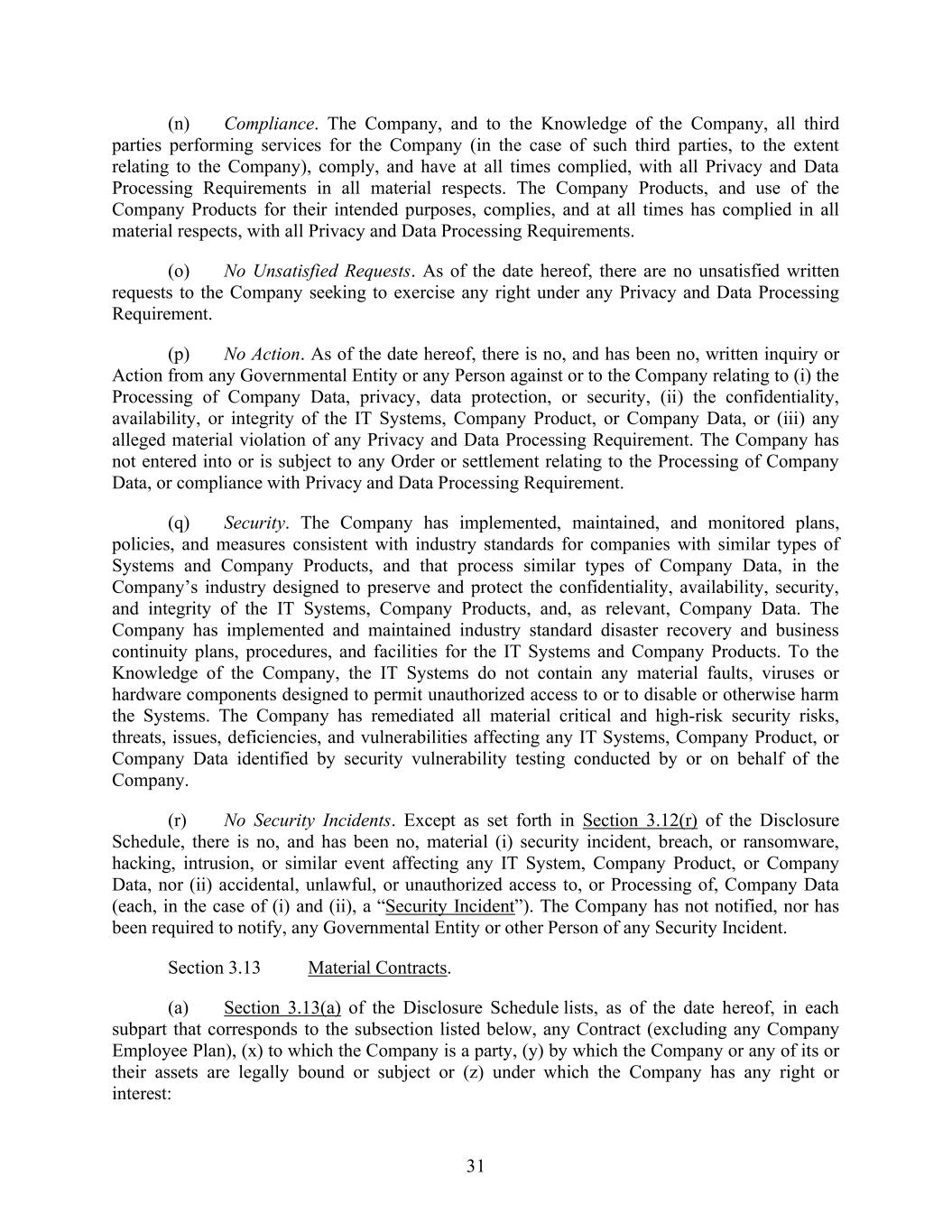 31 (n) Compliance. The Company, and to the Knowledge of the Company, all third parties performing services for the Company (in the case of such third parties, to the extent relating to the Company), comply, and have at all times complied, with all Privacy and Data Processing Requirements in all material respects. The Company Products, and use of the Company Products for their intended purposes, complies, and at all times has complied in all material respects, with all Privacy and Data Processing Requirements. (o) No Unsatisfied Requests. As of the date hereof, there are no unsatisfied written requests to the Company seeking to exercise any right under any Privacy and Data Processing Requirement. (p) No Action. As of the date hereof, there is no, and has been no, written inquiry or Action from any Governmental Entity or any Person against or to the Company relating to (i) the Processing of Company Data, privacy, data protection, or security, (ii) the confidentiality, availability, or integrity of the IT Systems, Company Product, or Company Data, or (iii) any alleged material violation of any Privacy and Data Processing Requirement. The Company has not entered into or is subject to any Order or settlement relating to the Processing of Company Data, or compliance with Privacy and Data Processing Requirement. (q) Security. The Company has implemented, maintained, and monitored plans, policies, and measures consistent with industry standards for companies with similar types of Systems and Company Products, and that process similar types of Company Data, in the Company’s industry designed to preserve and protect the confidentiality, availability, security, and integrity of the IT Systems, Company Products, and, as relevant, Company Data. The Company has implemented and maintained industry standard disaster recovery and business continuity plans, procedures, and facilities for the IT Systems and Company Products. To the Knowledge of the Company, the IT Systems do not contain any material faults, viruses or hardware components designed to permit unauthorized access to or to disable or otherwise harm the Systems. The Company has remediated all material critical and high-risk security risks, threats, issues, deficiencies, and vulnerabilities affecting any IT Systems, Company Product, or Company Data identified by security vulnerability testing conducted by or on behalf of the Company. (r) No Security Incidents. Except as set forth in Section 3.12(r) of the Disclosure Schedule, there is no, and has been no, material (i) security incident, breach, or ransomware, hacking, intrusion, or similar event affecting any IT System, Company Product, or Company Data, nor (ii) accidental, unlawful, or unauthorized access to, or Processing of, Company Data (each, in the case of (i) and (ii), a “Security Incident”). The Company has not notified, nor has been required to notify, any Governmental Entity or other Person of any Security Incident. Section 3.13 Material Contracts. (a) Section 3.13(a) of the Disclosure Schedule lists, as of the date hereof, in each subpart that corresponds to the subsection listed below, any Contract (excluding any Company Employee Plan), (x) to which the Company is a party, (y) by which the Company or any of its or their assets are legally bound or subject or (z) under which the Company has any right or interest: