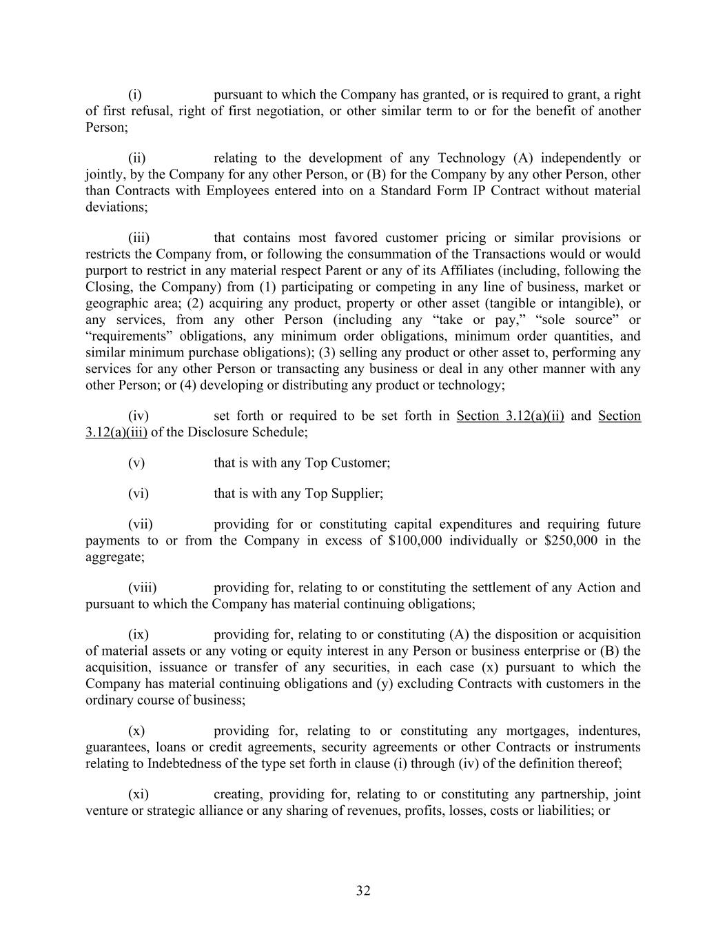 32 (i) pursuant to which the Company has granted, or is required to grant, a right of first refusal, right of first negotiation, or other similar term to or for the benefit of another Person; (ii) relating to the development of any Technology (A) independently or jointly, by the Company for any other Person, or (B) for the Company by any other Person, other than Contracts with Employees entered into on a Standard Form IP Contract without material deviations; (iii) that contains most favored customer pricing or similar provisions or restricts the Company from, or following the consummation of the Transactions would or would purport to restrict in any material respect Parent or any of its Affiliates (including, following the Closing, the Company) from (1) participating or competing in any line of business, market or geographic area; (2) acquiring any product, property or other asset (tangible or intangible), or any services, from any other Person (including any “take or pay,” “sole source” or “requirements” obligations, any minimum order obligations, minimum order quantities, and similar minimum purchase obligations); (3) selling any product or other asset to, performing any services for any other Person or transacting any business or deal in any other manner with any other Person; or (4) developing or distributing any product or technology; (iv) set forth or required to be set forth in Section 3.12(a)(ii) and Section 3.12(a)(iii) of the Disclosure Schedule; (v) that is with any Top Customer; (vi) that is with any Top Supplier; (vii) providing for or constituting capital expenditures and requiring future payments to or from the Company in excess of $100,000 individually or $250,000 in the aggregate; (viii) providing for, relating to or constituting the settlement of any Action and pursuant to which the Company has material continuing obligations; (ix) providing for, relating to or constituting (A) the disposition or acquisition of material assets or any voting or equity interest in any Person or business enterprise or (B) the acquisition, issuance or transfer of any securities, in each case (x) pursuant to which the Company has material continuing obligations and (y) excluding Contracts with customers in the ordinary course of business; (x) providing for, relating to or constituting any mortgages, indentures, guarantees, loans or credit agreements, security agreements or other Contracts or instruments relating to Indebtedness of the type set forth in clause (i) through (iv) of the definition thereof; (xi) creating, providing for, relating to or constituting any partnership, joint venture or strategic alliance or any sharing of revenues, profits, losses, costs or liabilities; or