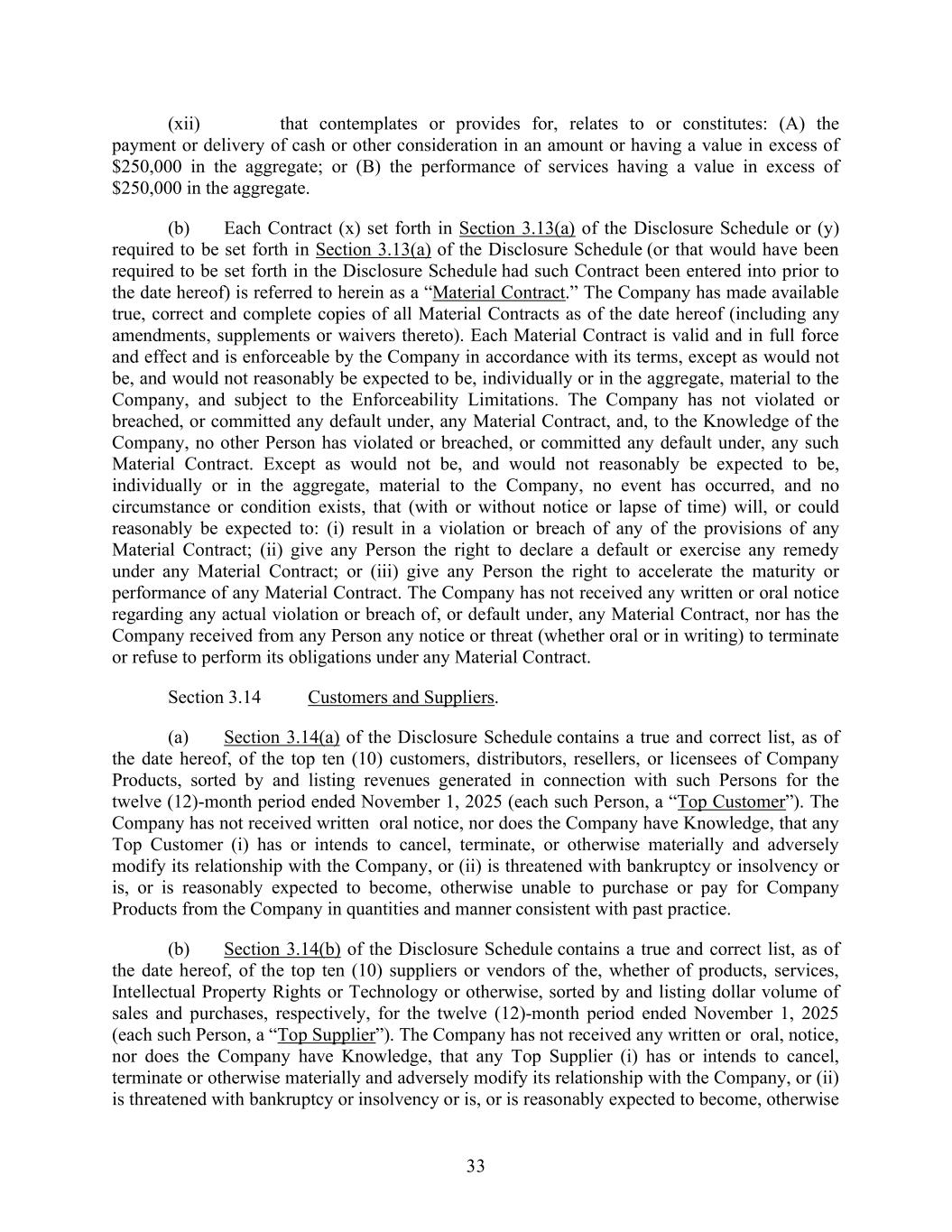 33 (xii) that contemplates or provides for, relates to or constitutes: (A) the payment or delivery of cash or other consideration in an amount or having a value in excess of $250,000 in the aggregate; or (B) the performance of services having a value in excess of $250,000 in the aggregate. (b) Each Contract (x) set forth in Section 3.13(a) of the Disclosure Schedule or (y) required to be set forth in Section 3.13(a) of the Disclosure Schedule (or that would have been required to be set forth in the Disclosure Schedule had such Contract been entered into prior to the date hereof) is referred to herein as a “Material Contract.” The Company has made available true, correct and complete copies of all Material Contracts as of the date hereof (including any amendments, supplements or waivers thereto). Each Material Contract is valid and in full force and effect and is enforceable by the Company in accordance with its terms, except as would not be, and would not reasonably be expected to be, individually or in the aggregate, material to the Company, and subject to the Enforceability Limitations. The Company has not violated or breached, or committed any default under, any Material Contract, and, to the Knowledge of the Company, no other Person has violated or breached, or committed any default under, any such Material Contract. Except as would not be, and would not reasonably be expected to be, individually or in the aggregate, material to the Company, no event has occurred, and no circumstance or condition exists, that (with or without notice or lapse of time) will, or could reasonably be expected to: (i) result in a violation or breach of any of the provisions of any Material Contract; (ii) give any Person the right to declare a default or exercise any remedy under any Material Contract; or (iii) give any Person the right to accelerate the maturity or performance of any Material Contract. The Company has not received any written or oral notice regarding any actual violation or breach of, or default under, any Material Contract, nor has the Company received from any Person any notice or threat (whether oral or in writing) to terminate or refuse to perform its obligations under any Material Contract. Section 3.14 Customers and Suppliers. (a) Section 3.14(a) of the Disclosure Schedule contains a true and correct list, as of the date hereof, of the top ten (10) customers, distributors, resellers, or licensees of Company Products, sorted by and listing revenues generated in connection with such Persons for the twelve (12)-month period ended November 1, 2025 (each such Person, a “Top Customer”). The Company has not received written oral notice, nor does the Company have Knowledge, that any Top Customer (i) has or intends to cancel, terminate, or otherwise materially and adversely modify its relationship with the Company, or (ii) is threatened with bankruptcy or insolvency or is, or is reasonably expected to become, otherwise unable to purchase or pay for Company Products from the Company in quantities and manner consistent with past practice. (b) Section 3.14(b) of the Disclosure Schedule contains a true and correct list, as of the date hereof, of the top ten (10) suppliers or vendors of the, whether of products, services, Intellectual Property Rights or Technology or otherwise, sorted by and listing dollar volume of sales and purchases, respectively, for the twelve (12)-month period ended November 1, 2025 (each such Person, a “Top Supplier”). The Company has not received any written or oral, notice, nor does the Company have Knowledge, that any Top Supplier (i) has or intends to cancel, terminate or otherwise materially and adversely modify its relationship with the Company, or (ii) is threatened with bankruptcy or insolvency or is, or is reasonably expected to become, otherwise
