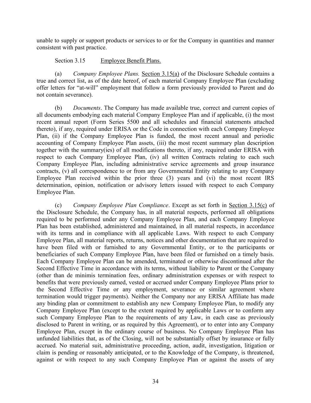 34 unable to supply or support products or services to or for the Company in quantities and manner consistent with past practice. Section 3.15 Employee Benefit Plans. (a) Company Employee Plans. Section 3.15(a) of the Disclosure Schedule contains a true and correct list, as of the date hereof, of each material Company Employee Plan (excluding offer letters for “at-will” employment that follow a form previously provided to Parent and do not contain severance). (b) Documents. The Company has made available true, correct and current copies of all documents embodying each material Company Employee Plan and if applicable, (i) the most recent annual report (Form Series 5500 and all schedules and financial statements attached thereto), if any, required under ERISA or the Code in connection with each Company Employee Plan, (ii) if the Company Employee Plan is funded, the most recent annual and periodic accounting of Company Employee Plan assets, (iii) the most recent summary plan description together with the summary(ies) of all modifications thereto, if any, required under ERISA with respect to each Company Employee Plan, (iv) all written Contracts relating to each such Company Employee Plan, including administrative service agreements and group insurance contracts, (v) all correspondence to or from any Governmental Entity relating to any Company Employee Plan received within the prior three (3) years and (vi) the most recent IRS determination, opinion, notification or advisory letters issued with respect to each Company Employee Plan. (c) Company Employee Plan Compliance. Except as set forth in Section 3.15(c) of the Disclosure Schedule, the Company has, in all material respects, performed all obligations required to be performed under any Company Employee Plan, and each Company Employee Plan has been established, administered and maintained, in all material respects, in accordance with its terms and in compliance with all applicable Laws. With respect to each Company Employee Plan, all material reports, returns, notices and other documentation that are required to have been filed with or furnished to any Governmental Entity, or to the participants or beneficiaries of such Company Employee Plan, have been filed or furnished on a timely basis. Each Company Employee Plan can be amended, terminated or otherwise discontinued after the Second Effective Time in accordance with its terms, without liability to Parent or the Company (other than de minimis termination fees, ordinary administration expenses or with respect to benefits that were previously earned, vested or accrued under Company Employee Plans prior to the Second Effective Time or any employment, severance or similar agreement where termination would trigger payments). Neither the Company nor any ERISA Affiliate has made any binding plan or commitment to establish any new Company Employee Plan, to modify any Company Employee Plan (except to the extent required by applicable Laws or to conform any such Company Employee Plan to the requirements of any Law, in each case as previously disclosed to Parent in writing, or as required by this Agreement), or to enter into any Company Employee Plan, except in the ordinary course of business. No Company Employee Plan has unfunded liabilities that, as of the Closing, will not be substantially offset by insurance or fully accrued. No material suit, administrative proceeding, action, audit, investigation, litigation or claim is pending or reasonably anticipated, or to the Knowledge of the Company, is threatened, against or with respect to any such Company Employee Plan or against the assets of any
