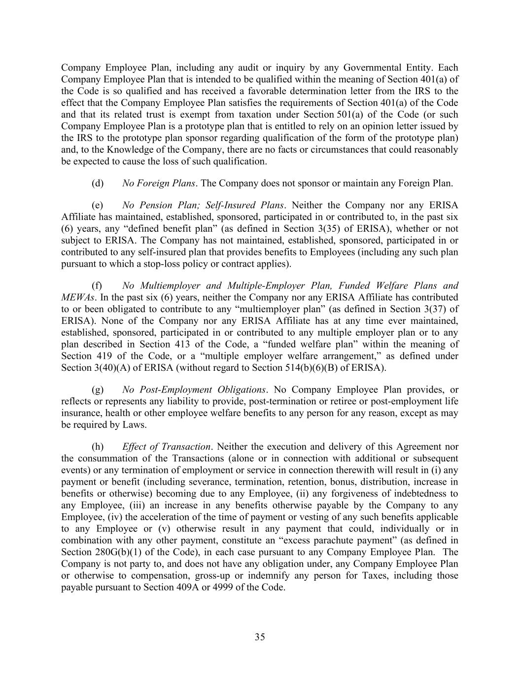 35 Company Employee Plan, including any audit or inquiry by any Governmental Entity. Each Company Employee Plan that is intended to be qualified within the meaning of Section 401(a) of the Code is so qualified and has received a favorable determination letter from the IRS to the effect that the Company Employee Plan satisfies the requirements of Section 401(a) of the Code and that its related trust is exempt from taxation under Section 501(a) of the Code (or such Company Employee Plan is a prototype plan that is entitled to rely on an opinion letter issued by the IRS to the prototype plan sponsor regarding qualification of the form of the prototype plan) and, to the Knowledge of the Company, there are no facts or circumstances that could reasonably be expected to cause the loss of such qualification. (d) No Foreign Plans. The Company does not sponsor or maintain any Foreign Plan. (e) No Pension Plan; Self-Insured Plans. Neither the Company nor any ERISA Affiliate has maintained, established, sponsored, participated in or contributed to, in the past six (6) years, any “defined benefit plan” (as defined in Section 3(35) of ERISA), whether or not subject to ERISA. The Company has not maintained, established, sponsored, participated in or contributed to any self-insured plan that provides benefits to Employees (including any such plan pursuant to which a stop-loss policy or contract applies). (f) No Multiemployer and Multiple-Employer Plan, Funded Welfare Plans and MEWAs. In the past six (6) years, neither the Company nor any ERISA Affiliate has contributed to or been obligated to contribute to any “multiemployer plan” (as defined in Section 3(37) of ERISA). None of the Company nor any ERISA Affiliate has at any time ever maintained, established, sponsored, participated in or contributed to any multiple employer plan or to any plan described in Section 413 of the Code, a “funded welfare plan” within the meaning of Section 419 of the Code, or a “multiple employer welfare arrangement,” as defined under Section 3(40)(A) of ERISA (without regard to Section 514(b)(6)(B) of ERISA). (g) No Post-Employment Obligations. No Company Employee Plan provides, or reflects or represents any liability to provide, post-termination or retiree or post-employment life insurance, health or other employee welfare benefits to any person for any reason, except as may be required by Laws. (h) Effect of Transaction. Neither the execution and delivery of this Agreement nor the consummation of the Transactions (alone or in connection with additional or subsequent events) or any termination of employment or service in connection therewith will result in (i) any payment or benefit (including severance, termination, retention, bonus, distribution, increase in benefits or otherwise) becoming due to any Employee, (ii) any forgiveness of indebtedness to any Employee, (iii) an increase in any benefits otherwise payable by the Company to any Employee, (iv) the acceleration of the time of payment or vesting of any such benefits applicable to any Employee or (v) otherwise result in any payment that could, individually or in combination with any other payment, constitute an “excess parachute payment” (as defined in Section 280G(b)(1) of the Code), in each case pursuant to any Company Employee Plan. The Company is not party to, and does not have any obligation under, any Company Employee Plan or otherwise to compensation, gross-up or indemnify any person for Taxes, including those payable pursuant to Section 409A or 4999 of the Code.