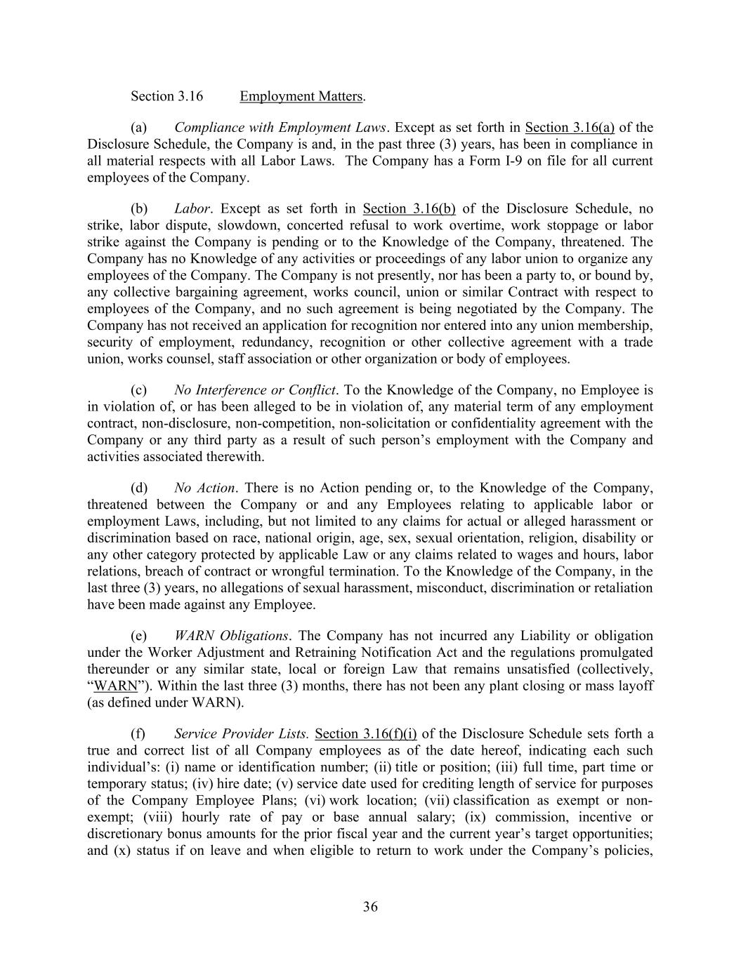 36 Section 3.16 Employment Matters. (a) Compliance with Employment Laws. Except as set forth in Section 3.16(a) of the Disclosure Schedule, the Company is and, in the past three (3) years, has been in compliance in all material respects with all Labor Laws. The Company has a Form I-9 on file for all current employees of the Company. (b) Labor. Except as set forth in Section 3.16(b) of the Disclosure Schedule, no strike, labor dispute, slowdown, concerted refusal to work overtime, work stoppage or labor strike against the Company is pending or to the Knowledge of the Company, threatened. The Company has no Knowledge of any activities or proceedings of any labor union to organize any employees of the Company. The Company is not presently, nor has been a party to, or bound by, any collective bargaining agreement, works council, union or similar Contract with respect to employees of the Company, and no such agreement is being negotiated by the Company. The Company has not received an application for recognition nor entered into any union membership, security of employment, redundancy, recognition or other collective agreement with a trade union, works counsel, staff association or other organization or body of employees. (c) No Interference or Conflict. To the Knowledge of the Company, no Employee is in violation of, or has been alleged to be in violation of, any material term of any employment contract, non-disclosure, non-competition, non-solicitation or confidentiality agreement with the Company or any third party as a result of such person’s employment with the Company and activities associated therewith. (d) No Action. There is no Action pending or, to the Knowledge of the Company, threatened between the Company or and any Employees relating to applicable labor or employment Laws, including, but not limited to any claims for actual or alleged harassment or discrimination based on race, national origin, age, sex, sexual orientation, religion, disability or any other category protected by applicable Law or any claims related to wages and hours, labor relations, breach of contract or wrongful termination. To the Knowledge of the Company, in the last three (3) years, no allegations of sexual harassment, misconduct, discrimination or retaliation have been made against any Employee. (e) WARN Obligations. The Company has not incurred any Liability or obligation under the Worker Adjustment and Retraining Notification Act and the regulations promulgated thereunder or any similar state, local or foreign Law that remains unsatisfied (collectively, “WARN”). Within the last three (3) months, there has not been any plant closing or mass layoff (as defined under WARN). (f) Service Provider Lists. Section 3.16(f)(i) of the Disclosure Schedule sets forth a true and correct list of all Company employees as of the date hereof, indicating each such individual’s: (i) name or identification number; (ii) title or position; (iii) full time, part time or temporary status; (iv) hire date; (v) service date used for crediting length of service for purposes of the Company Employee Plans; (vi) work location; (vii) classification as exempt or non- exempt; (viii) hourly rate of pay or base annual salary; (ix) commission, incentive or discretionary bonus amounts for the prior fiscal year and the current year’s target opportunities; and (x) status if on leave and when eligible to return to work under the Company’s policies,