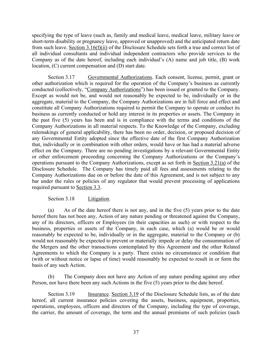 37 specifying the type of leave (such as, family and medical leave, medical leave, military leave or short-term disability or pregnancy leave, approved or unapproved) and the anticipated return date from such leave. Section 3.16(f)(ii) of the Disclosure Schedule sets forth a true and correct list of all individual consultants and individual independent contractors who provide services to the Company as of the date hereof, including each individual’s (A) name and job title, (B) work location, (C) current compensation and (D) start date. Section 3.17 Governmental Authorizations. Each consent, license, permit, grant or other authorization which is required for the operation of the Company’s business as currently conducted (collectively, “Company Authorizations”) has been issued or granted to the Company. Except as would not be, and would not reasonably be expected to be, individually or in the aggregate, material to the Company, the Company Authorizations are in full force and effect and constitute all Company Authorizations required to permit the Company to operate or conduct its business as currently conducted or hold any interest in its properties or assets. The Company in the past five (5) years has been and is in compliance with the terms and conditions of the Company Authorizations in all material respects. To the Knowledge of the Company, excluding rulemakings of general applicability, there has been no order, decision, or proposed decision of any Governmental Entity adopted since the effective date of the first Company Authorization that, individually or in combination with other orders, would have or has had a material adverse effect on the Company. There are no pending investigations by a relevant Governmental Entity or other enforcement proceeding concerning the Company Authorizations or the Company’s operations pursuant to the Company Authorizations, except as set forth in Section 3.21(a) of the Disclosure Schedule. The Company has timely paid all fees and assessments relating to the Company Authorizations due on or before the date of this Agreement, and is not subject to any bar under the rules or policies of any regulator that would prevent processing of applications required pursuant to Section 3.3. Section 3.18 Litigation. (a) As of the date hereof there is not any, and in the five (5) years prior to the date hereof there has not been any, Action of any nature pending or threatened against the Company, any of its directors, officers or Employees (in their capacities as such) or with respect to the business, properties or assets of the Company, in each case, which (a) would be or would reasonably be expected to be, individually or in the aggregate, material to the Company or (b) would not reasonably be expected to prevent or materially impede or delay the consummation of the Mergers and the other transactions contemplated by this Agreement and the other Related Agreements to which the Company is a party. There exists no circumstance or condition that (with or without notice or lapse of time) would reasonably be expected to result in or form the basis of any such Action. (b) The Company does not have any Action of any nature pending against any other Person, nor have there been any such Actions in the five (5) years prior to the date hereof. Section 3.19 Insurance. Section 3.19 of the Disclosure Schedule lists, as of the date hereof, all current insurance policies covering the assets, business, equipment, properties, operations, employees, officers and directors of the Company, including the type of coverage, the carrier, the amount of coverage, the term and the annual premiums of such policies (such