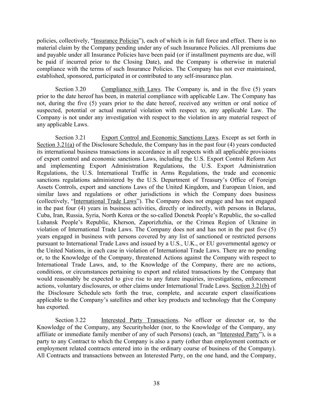 38 policies, collectively, “Insurance Policies”), each of which is in full force and effect. There is no material claim by the Company pending under any of such Insurance Policies. All premiums due and payable under all Insurance Policies have been paid (or if installment payments are due, will be paid if incurred prior to the Closing Date), and the Company is otherwise in material compliance with the terms of such Insurance Policies. The Company has not ever maintained, established, sponsored, participated in or contributed to any self-insurance plan. Section 3.20 Compliance with Laws. The Company is, and in the five (5) years prior to the date hereof has been, in material compliance with applicable Law. The Company has not, during the five (5) years prior to the date hereof, received any written or oral notice of suspected, potential or actual material violation with respect to, any applicable Law. The Company is not under any investigation with respect to the violation in any material respect of any applicable Laws. Section 3.21 Export Control and Economic Sanctions Laws. Except as set forth in Section 3.21(a) of the Disclosure Schedule, the Company has in the past four (4) years conducted its international business transactions in accordance in all respects with all applicable provisions of export control and economic sanctions Laws, including the U.S. Export Control Reform Act and implementing Export Administration Regulations, the U.S. Export Administration Regulations, the U.S. International Traffic in Arms Regulations, the trade and economic sanctions regulations administered by the U.S. Department of Treasury’s Office of Foreign Assets Controls, export and sanctions Laws of the United Kingdom, and European Union, and similar laws and regulations or other jurisdictions in which the Company does business (collectively, “International Trade Laws”). The Company does not engage and has not engaged in the past four (4) years in business activities, directly or indirectly, with persons in Belarus, Cuba, Iran, Russia, Syria, North Korea or the so-called Donetsk People’s Republic, the so-called Luhansk People’s Republic, Kherson, Zaporizhzhia, or the Crimea Region of Ukraine in violation of International Trade Laws. The Company does not and has not in the past five (5) years engaged in business with persons covered by any list of sanctioned or restricted persons pursuant to International Trade Laws and issued by a U.S., U.K., or EU governmental agency or the United Nations, in each case in violation of International Trade Laws. There are no pending or, to the Knowledge of the Company, threatened Actions against the Company with respect to International Trade Laws, and, to the Knowledge of the Company, there are no actions, conditions, or circumstances pertaining to export and related transactions by the Company that would reasonably be expected to give rise to any future inquiries, investigations, enforcement actions, voluntary disclosures, or other claims under International Trade Laws. Section 3.21(b) of the Disclosure Schedule sets forth the true, complete, and accurate export classifications applicable to the Company’s satellites and other key products and technology that the Company has exported. Section 3.22 Interested Party Transactions. No officer or director or, to the Knowledge of the Company, any Securityholder (nor, to the Knowledge of the Company, any affiliate or immediate family member of any of such Persons) (each, an “Interested Party”), is a party to any Contract to which the Company is also a party (other than employment contracts or employment related contracts entered into in the ordinary course of business of the Company). All Contracts and transactions between an Interested Party, on the one hand, and the Company,