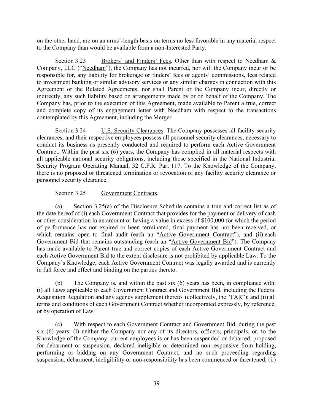 39 on the other hand, are on an arms’-length basis on terms no less favorable in any material respect to the Company than would be available from a non-Interested Party. Section 3.23 Brokers’ and Finders’ Fees. Other than with respect to Needham & Company, LLC (“Needham”), the Company has not incurred, nor will the Company incur or be responsible for, any liability for brokerage or finders’ fees or agents’ commissions, fees related to investment banking or similar advisory services or any similar charges in connection with this Agreement or the Related Agreements, nor shall Parent or the Company incur, directly or indirectly, any such liability based on arrangements made by or on behalf of the Company. The Company has, prior to the execution of this Agreement, made available to Parent a true, correct and complete copy of its engagement letter with Needham with respect to the transactions contemplated by this Agreement, including the Merger. Section 3.24 U.S. Security Clearances. The Company possesses all facility security clearances, and their respective employees possess all personnel security clearances, necessary to conduct its business as presently conducted and required to perform each Active Government Contract. Within the past six (6) years, the Company has complied in all material respects with all applicable national security obligations, including those specified in the National Industrial Security Program Operating Manual, 32 C.F.R. Part 117. To the Knowledge of the Company, there is no proposed or threatened termination or revocation of any facility security clearance or personnel security clearance. Section 3.25 Government Contracts. (a) Section 3.25(a) of the Disclosure Schedule contains a true and correct list as of the date hereof of (i) each Government Contract that provides for the payment or delivery of cash or other consideration in an amount or having a value in excess of $100,000 for which the period of performance has not expired or been terminated, final payment has not been received, or which remains open to final audit (each an “Active Government Contract”), and (ii) each Government Bid that remains outstanding (each an “Active Government Bid”). The Company has made available to Parent true and correct copies of each Active Government Contract and each Active Government Bid to the extent disclosure is not prohibited by applicable Law. To the Company’s Knowledge, each Active Government Contract was legally awarded and is currently in full force and effect and binding on the parties thereto. (b) The Company is, and within the past six (6) years has been, in compliance with: (i) all Laws applicable to each Government Contract and Government Bid, including the Federal Acquisition Regulation and any agency supplement thereto (collectively, the “FAR”); and (ii) all terms and conditions of each Government Contract whether incorporated expressly, by reference, or by operation of Law. (c) With respect to each Government Contract and Government Bid, during the past six (6) years: (i) neither the Company nor any of its directors, officers, principals, or, to the Knowledge of the Company, current employees is or has been suspended or debarred, proposed for debarment or suspension, declared ineligible or determined non-responsive from holding, performing or bidding on any Government Contract, and no such proceeding regarding suspension, debarment, ineligibility or non-responsibility has been commenced or threatened; (ii)