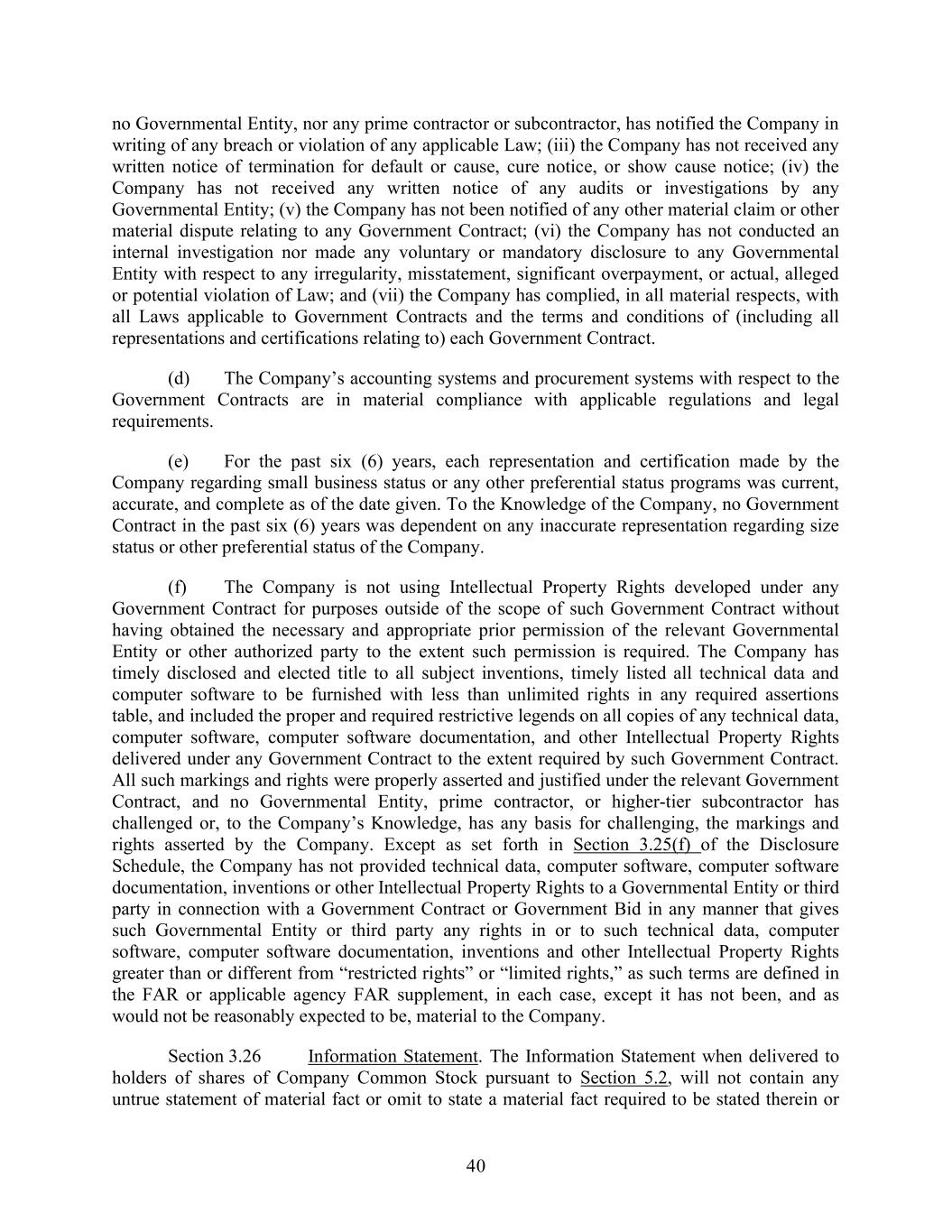 40 no Governmental Entity, nor any prime contractor or subcontractor, has notified the Company in writing of any breach or violation of any applicable Law; (iii) the Company has not received any written notice of termination for default or cause, cure notice, or show cause notice; (iv) the Company has not received any written notice of any audits or investigations by any Governmental Entity; (v) the Company has not been notified of any other material claim or other material dispute relating to any Government Contract; (vi) the Company has not conducted an internal investigation nor made any voluntary or mandatory disclosure to any Governmental Entity with respect to any irregularity, misstatement, significant overpayment, or actual, alleged or potential violation of Law; and (vii) the Company has complied, in all material respects, with all Laws applicable to Government Contracts and the terms and conditions of (including all representations and certifications relating to) each Government Contract. (d) The Company’s accounting systems and procurement systems with respect to the Government Contracts are in material compliance with applicable regulations and legal requirements. (e) For the past six (6) years, each representation and certification made by the Company regarding small business status or any other preferential status programs was current, accurate, and complete as of the date given. To the Knowledge of the Company, no Government Contract in the past six (6) years was dependent on any inaccurate representation regarding size status or other preferential status of the Company. (f) The Company is not using Intellectual Property Rights developed under any Government Contract for purposes outside of the scope of such Government Contract without having obtained the necessary and appropriate prior permission of the relevant Governmental Entity or other authorized party to the extent such permission is required. The Company has timely disclosed and elected title to all subject inventions, timely listed all technical data and computer software to be furnished with less than unlimited rights in any required assertions table, and included the proper and required restrictive legends on all copies of any technical data, computer software, computer software documentation, and other Intellectual Property Rights delivered under any Government Contract to the extent required by such Government Contract. All such markings and rights were properly asserted and justified under the relevant Government Contract, and no Governmental Entity, prime contractor, or higher-tier subcontractor has challenged or, to the Company’s Knowledge, has any basis for challenging, the markings and rights asserted by the Company. Except as set forth in Section 3.25(f) of the Disclosure Schedule, the Company has not provided technical data, computer software, computer software documentation, inventions or other Intellectual Property Rights to a Governmental Entity or third party in connection with a Government Contract or Government Bid in any manner that gives such Governmental Entity or third party any rights in or to such technical data, computer software, computer software documentation, inventions and other Intellectual Property Rights greater than or different from “restricted rights” or “limited rights,” as such terms are defined in the FAR or applicable agency FAR supplement, in each case, except it has not been, and as would not be reasonably expected to be, material to the Company. Section 3.26 Information Statement. The Information Statement when delivered to holders of shares of Company Common Stock pursuant to Section 5.2, will not contain any untrue statement of material fact or omit to state a material fact required to be stated therein or