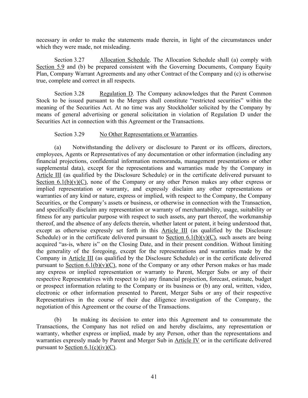 41 necessary in order to make the statements made therein, in light of the circumstances under which they were made, not misleading. Section 3.27 Allocation Schedule. The Allocation Schedule shall (a) comply with Section 5.9 and (b) be prepared consistent with the Governing Documents, Company Equity Plan, Company Warrant Agreements and any other Contract of the Company and (c) is otherwise true, complete and correct in all respects. Section 3.28 Regulation D. The Company acknowledges that the Parent Common Stock to be issued pursuant to the Mergers shall constitute “restricted securities” within the meaning of the Securities Act. At no time was any Stockholder solicited by the Company by means of general advertising or general solicitation in violation of Regulation D under the Securities Act in connection with this Agreement or the Transactions. Section 3.29 No Other Representations or Warranties. (a) Notwithstanding the delivery or disclosure to Parent or its officers, directors, employees, Agents or Representatives of any documentation or other information (including any financial projections, confidential information memoranda, management presentations or other supplemental data), except for the representations and warranties made by the Company in Article III (as qualified by the Disclosure Schedule) or in the certificate delivered pursuant to Section 6.1(b)(v)(C), none of the Company or any other Person makes any other express or implied representation or warranty, and expressly disclaim any other representations or warranties of any kind or nature, express or implied, with respect to the Company, the Company Securities, or the Company’s assets or business, or otherwise in connection with the Transaction, and specifically disclaim any representation or warranty of merchantability, usage, suitability or fitness for any particular purpose with respect to such assets, any part thereof, the workmanship thereof, and the absence of any defects therein, whether latent or patent, it being understood that, except as otherwise expressly set forth in this Article III (as qualified by the Disclosure Schedule) or in the certificate delivered pursuant to Section 6.1(b)(v)(C), such assets are being acquired “as-is, where is” on the Closing Date, and in their present condition. Without limiting the generality of the foregoing, except for the representations and warranties made by the Company in Article III (as qualified by the Disclosure Schedule) or in the certificate delivered pursuant to Section 6.1(b)(v)(C), none of the Company or any other Person makes or has made any express or implied representation or warranty to Parent, Merger Subs or any of their respective Representatives with respect to (a) any financial projection, forecast, estimate, budget or prospect information relating to the Company or its business or (b) any oral, written, video, electronic or other information presented to Parent, Merger Subs or any of their respective Representatives in the course of their due diligence investigation of the Company, the negotiation of this Agreement or the course of the Transactions. (b) In making its decision to enter into this Agreement and to consummate the Transactions, the Company has not relied on and hereby disclaims, any representation or warranty, whether express or implied, made by any Person, other than the representations and warranties expressly made by Parent and Merger Sub in Article IV or in the certificate delivered pursuant to Section 6.1(c)(iv)(C).