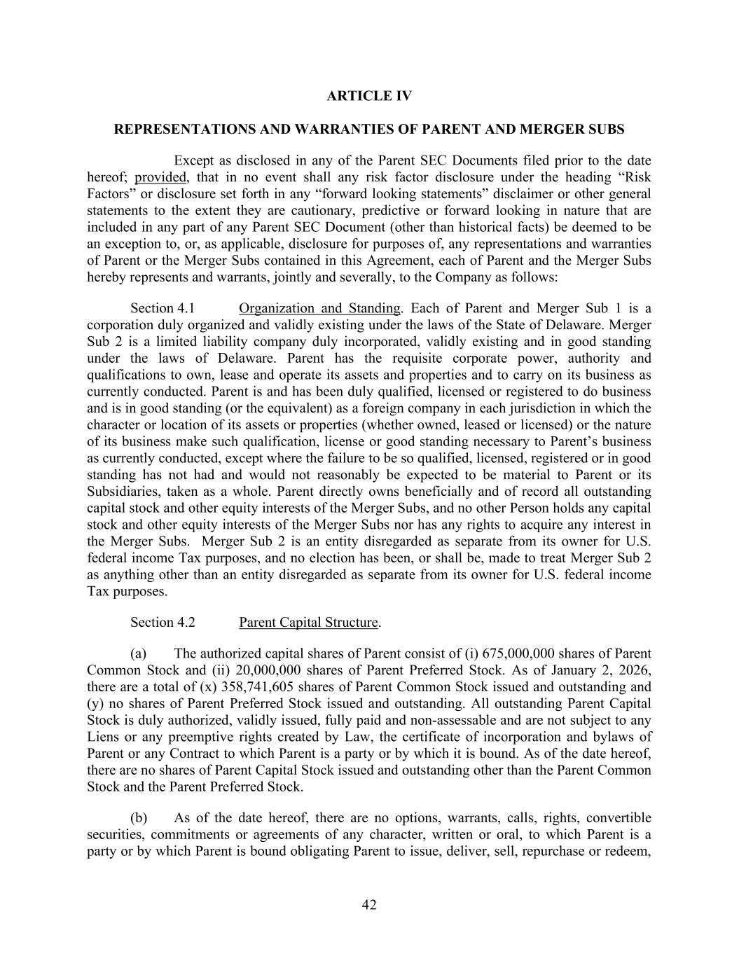 42 ARTICLE IV REPRESENTATIONS AND WARRANTIES OF PARENT AND MERGER SUBS Except as disclosed in any of the Parent SEC Documents filed prior to the date hereof; provided, that in no event shall any risk factor disclosure under the heading “Risk Factors” or disclosure set forth in any “forward looking statements” disclaimer or other general statements to the extent they are cautionary, predictive or forward looking in nature that are included in any part of any Parent SEC Document (other than historical facts) be deemed to be an exception to, or, as applicable, disclosure for purposes of, any representations and warranties of Parent or the Merger Subs contained in this Agreement, each of Parent and the Merger Subs hereby represents and warrants, jointly and severally, to the Company as follows: Section 4.1 Organization and Standing. Each of Parent and Merger Sub 1 is a corporation duly organized and validly existing under the laws of the State of Delaware. Merger Sub 2 is a limited liability company duly incorporated, validly existing and in good standing under the laws of Delaware. Parent has the requisite corporate power, authority and qualifications to own, lease and operate its assets and properties and to carry on its business as currently conducted. Parent is and has been duly qualified, licensed or registered to do business and is in good standing (or the equivalent) as a foreign company in each jurisdiction in which the character or location of its assets or properties (whether owned, leased or licensed) or the nature of its business make such qualification, license or good standing necessary to Parent’s business as currently conducted, except where the failure to be so qualified, licensed, registered or in good standing has not had and would not reasonably be expected to be material to Parent or its Subsidiaries, taken as a whole. Parent directly owns beneficially and of record all outstanding capital stock and other equity interests of the Merger Subs, and no other Person holds any capital stock and other equity interests of the Merger Subs nor has any rights to acquire any interest in the Merger Subs. Merger Sub 2 is an entity disregarded as separate from its owner for U.S. federal income Tax purposes, and no election has been, or shall be, made to treat Merger Sub 2 as anything other than an entity disregarded as separate from its owner for U.S. federal income Tax purposes. Section 4.2 Parent Capital Structure. (a) The authorized capital shares of Parent consist of (i) 675,000,000 shares of Parent Common Stock and (ii) 20,000,000 shares of Parent Preferred Stock. As of January 2, 2026, there are a total of (x) 358,741,605 shares of Parent Common Stock issued and outstanding and (y) no shares of Parent Preferred Stock issued and outstanding. All outstanding Parent Capital Stock is duly authorized, validly issued, fully paid and non-assessable and are not subject to any Liens or any preemptive rights created by Law, the certificate of incorporation and bylaws of Parent or any Contract to which Parent is a party or by which it is bound. As of the date hereof, there are no shares of Parent Capital Stock issued and outstanding other than the Parent Common Stock and the Parent Preferred Stock. (b) As of the date hereof, there are no options, warrants, calls, rights, convertible securities, commitments or agreements of any character, written or oral, to which Parent is a party or by which Parent is bound obligating Parent to issue, deliver, sell, repurchase or redeem,