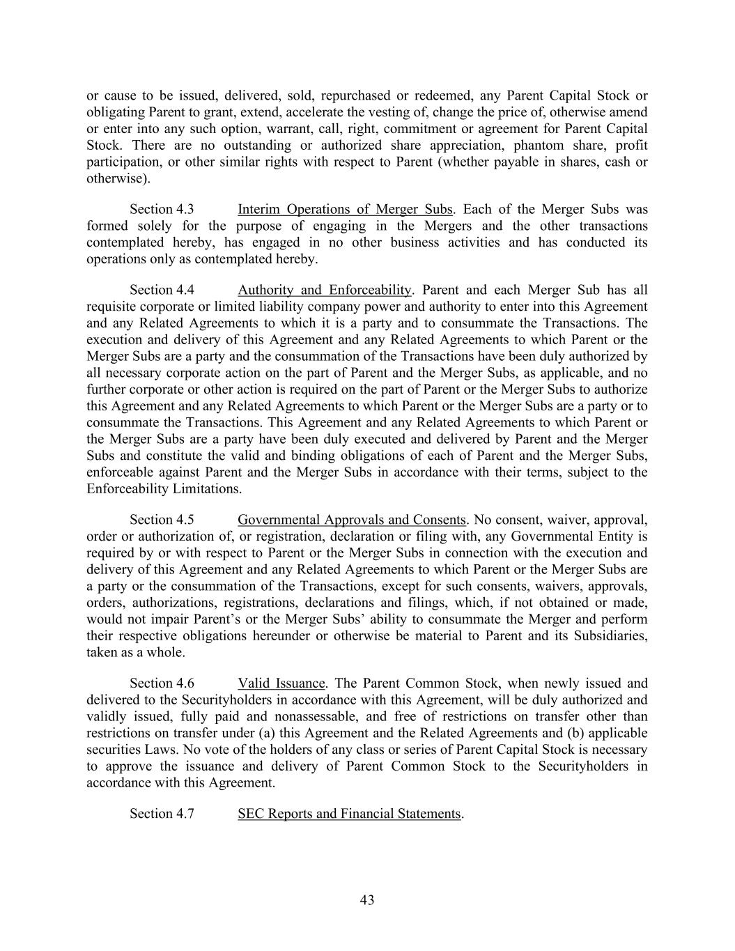 43 or cause to be issued, delivered, sold, repurchased or redeemed, any Parent Capital Stock or obligating Parent to grant, extend, accelerate the vesting of, change the price of, otherwise amend or enter into any such option, warrant, call, right, commitment or agreement for Parent Capital Stock. There are no outstanding or authorized share appreciation, phantom share, profit participation, or other similar rights with respect to Parent (whether payable in shares, cash or otherwise). Section 4.3 Interim Operations of Merger Subs. Each of the Merger Subs was formed solely for the purpose of engaging in the Mergers and the other transactions contemplated hereby, has engaged in no other business activities and has conducted its operations only as contemplated hereby. Section 4.4 Authority and Enforceability. Parent and each Merger Sub has all requisite corporate or limited liability company power and authority to enter into this Agreement and any Related Agreements to which it is a party and to consummate the Transactions. The execution and delivery of this Agreement and any Related Agreements to which Parent or the Merger Subs are a party and the consummation of the Transactions have been duly authorized by all necessary corporate action on the part of Parent and the Merger Subs, as applicable, and no further corporate or other action is required on the part of Parent or the Merger Subs to authorize this Agreement and any Related Agreements to which Parent or the Merger Subs are a party or to consummate the Transactions. This Agreement and any Related Agreements to which Parent or the Merger Subs are a party have been duly executed and delivered by Parent and the Merger Subs and constitute the valid and binding obligations of each of Parent and the Merger Subs, enforceable against Parent and the Merger Subs in accordance with their terms, subject to the Enforceability Limitations. Section 4.5 Governmental Approvals and Consents. No consent, waiver, approval, order or authorization of, or registration, declaration or filing with, any Governmental Entity is required by or with respect to Parent or the Merger Subs in connection with the execution and delivery of this Agreement and any Related Agreements to which Parent or the Merger Subs are a party or the consummation of the Transactions, except for such consents, waivers, approvals, orders, authorizations, registrations, declarations and filings, which, if not obtained or made, would not impair Parent’s or the Merger Subs’ ability to consummate the Merger and perform their respective obligations hereunder or otherwise be material to Parent and its Subsidiaries, taken as a whole. Section 4.6 Valid Issuance. The Parent Common Stock, when newly issued and delivered to the Securityholders in accordance with this Agreement, will be duly authorized and validly issued, fully paid and nonassessable, and free of restrictions on transfer other than restrictions on transfer under (a) this Agreement and the Related Agreements and (b) applicable securities Laws. No vote of the holders of any class or series of Parent Capital Stock is necessary to approve the issuance and delivery of Parent Common Stock to the Securityholders in accordance with this Agreement. Section 4.7 SEC Reports and Financial Statements.