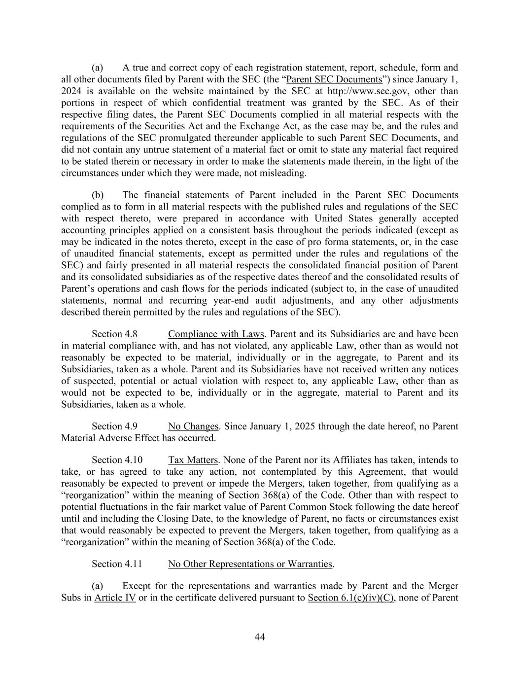 44 (a) A true and correct copy of each registration statement, report, schedule, form and all other documents filed by Parent with the SEC (the “Parent SEC Documents”) since January 1, 2024 is available on the website maintained by the SEC at http://www.sec.gov, other than portions in respect of which confidential treatment was granted by the SEC. As of their respective filing dates, the Parent SEC Documents complied in all material respects with the requirements of the Securities Act and the Exchange Act, as the case may be, and the rules and regulations of the SEC promulgated thereunder applicable to such Parent SEC Documents, and did not contain any untrue statement of a material fact or omit to state any material fact required to be stated therein or necessary in order to make the statements made therein, in the light of the circumstances under which they were made, not misleading. (b) The financial statements of Parent included in the Parent SEC Documents complied as to form in all material respects with the published rules and regulations of the SEC with respect thereto, were prepared in accordance with United States generally accepted accounting principles applied on a consistent basis throughout the periods indicated (except as may be indicated in the notes thereto, except in the case of pro forma statements, or, in the case of unaudited financial statements, except as permitted under the rules and regulations of the SEC) and fairly presented in all material respects the consolidated financial position of Parent and its consolidated subsidiaries as of the respective dates thereof and the consolidated results of Parent’s operations and cash flows for the periods indicated (subject to, in the case of unaudited statements, normal and recurring year-end audit adjustments, and any other adjustments described therein permitted by the rules and regulations of the SEC). Section 4.8 Compliance with Laws. Parent and its Subsidiaries are and have been in material compliance with, and has not violated, any applicable Law, other than as would not reasonably be expected to be material, individually or in the aggregate, to Parent and its Subsidiaries, taken as a whole. Parent and its Subsidiaries have not received written any notices of suspected, potential or actual violation with respect to, any applicable Law, other than as would not be expected to be, individually or in the aggregate, material to Parent and its Subsidiaries, taken as a whole. Section 4.9 No Changes. Since January 1, 2025 through the date hereof, no Parent Material Adverse Effect has occurred. Section 4.10 Tax Matters. None of the Parent nor its Affiliates has taken, intends to take, or has agreed to take any action, not contemplated by this Agreement, that would reasonably be expected to prevent or impede the Mergers, taken together, from qualifying as a “reorganization” within the meaning of Section 368(a) of the Code. Other than with respect to potential fluctuations in the fair market value of Parent Common Stock following the date hereof until and including the Closing Date, to the knowledge of Parent, no facts or circumstances exist that would reasonably be expected to prevent the Mergers, taken together, from qualifying as a “reorganization” within the meaning of Section 368(a) of the Code. Section 4.11 No Other Representations or Warranties. (a) Except for the representations and warranties made by Parent and the Merger Subs in Article IV or in the certificate delivered pursuant to Section 6.1(c)(iv)(C), none of Parent