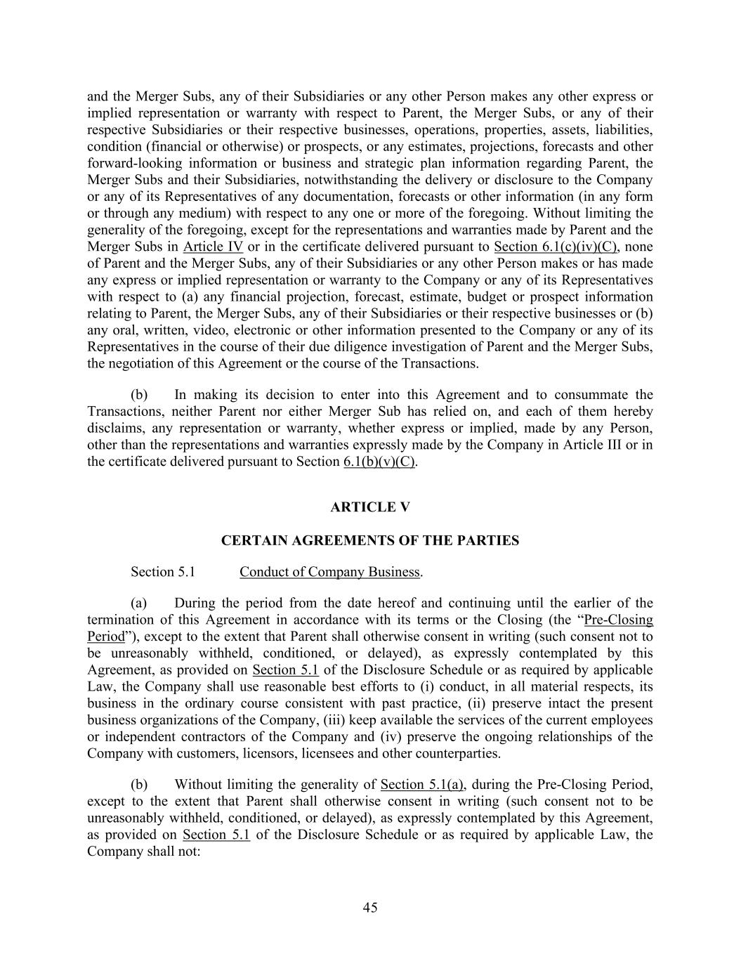 45 and the Merger Subs, any of their Subsidiaries or any other Person makes any other express or implied representation or warranty with respect to Parent, the Merger Subs, or any of their respective Subsidiaries or their respective businesses, operations, properties, assets, liabilities, condition (financial or otherwise) or prospects, or any estimates, projections, forecasts and other forward-looking information or business and strategic plan information regarding Parent, the Merger Subs and their Subsidiaries, notwithstanding the delivery or disclosure to the Company or any of its Representatives of any documentation, forecasts or other information (in any form or through any medium) with respect to any one or more of the foregoing. Without limiting the generality of the foregoing, except for the representations and warranties made by Parent and the Merger Subs in Article IV or in the certificate delivered pursuant to Section 6.1(c)(iv)(C), none of Parent and the Merger Subs, any of their Subsidiaries or any other Person makes or has made any express or implied representation or warranty to the Company or any of its Representatives with respect to (a) any financial projection, forecast, estimate, budget or prospect information relating to Parent, the Merger Subs, any of their Subsidiaries or their respective businesses or (b) any oral, written, video, electronic or other information presented to the Company or any of its Representatives in the course of their due diligence investigation of Parent and the Merger Subs, the negotiation of this Agreement or the course of the Transactions. (b) In making its decision to enter into this Agreement and to consummate the Transactions, neither Parent nor either Merger Sub has relied on, and each of them hereby disclaims, any representation or warranty, whether express or implied, made by any Person, other than the representations and warranties expressly made by the Company in Article III or in the certificate delivered pursuant to Section 6.1(b)(v)(C). ARTICLE V CERTAIN AGREEMENTS OF THE PARTIES Section 5.1 Conduct of Company Business. (a) During the period from the date hereof and continuing until the earlier of the termination of this Agreement in accordance with its terms or the Closing (the “Pre-Closing Period”), except to the extent that Parent shall otherwise consent in writing (such consent not to be unreasonably withheld, conditioned, or delayed), as expressly contemplated by this Agreement, as provided on Section 5.1 of the Disclosure Schedule or as required by applicable Law, the Company shall use reasonable best efforts to (i) conduct, in all material respects, its business in the ordinary course consistent with past practice, (ii) preserve intact the present business organizations of the Company, (iii) keep available the services of the current employees or independent contractors of the Company and (iv) preserve the ongoing relationships of the Company with customers, licensors, licensees and other counterparties. (b) Without limiting the generality of Section 5.1(a), during the Pre-Closing Period, except to the extent that Parent shall otherwise consent in writing (such consent not to be unreasonably withheld, conditioned, or delayed), as expressly contemplated by this Agreement, as provided on Section 5.1 of the Disclosure Schedule or as required by applicable Law, the Company shall not: