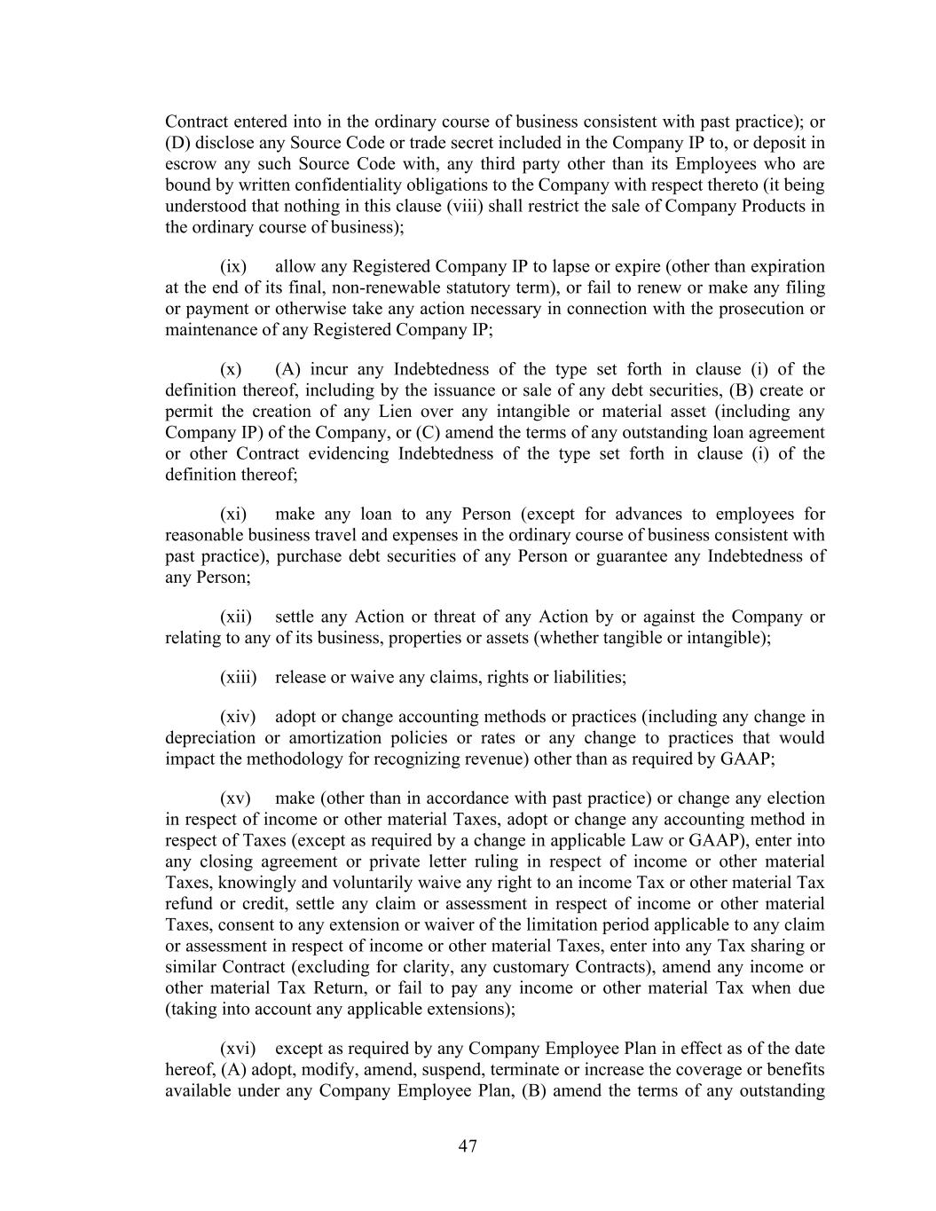 47 Contract entered into in the ordinary course of business consistent with past practice); or (D) disclose any Source Code or trade secret included in the Company IP to, or deposit in escrow any such Source Code with, any third party other than its Employees who are bound by written confidentiality obligations to the Company with respect thereto (it being understood that nothing in this clause (viii) shall restrict the sale of Company Products in the ordinary course of business); (ix) allow any Registered Company IP to lapse or expire (other than expiration at the end of its final, non-renewable statutory term), or fail to renew or make any filing or payment or otherwise take any action necessary in connection with the prosecution or maintenance of any Registered Company IP; (x) (A) incur any Indebtedness of the type set forth in clause (i) of the definition thereof, including by the issuance or sale of any debt securities, (B) create or permit the creation of any Lien over any intangible or material asset (including any Company IP) of the Company, or (C) amend the terms of any outstanding loan agreement or other Contract evidencing Indebtedness of the type set forth in clause (i) of the definition thereof; (xi) make any loan to any Person (except for advances to employees for reasonable business travel and expenses in the ordinary course of business consistent with past practice), purchase debt securities of any Person or guarantee any Indebtedness of any Person; (xii) settle any Action or threat of any Action by or against the Company or relating to any of its business, properties or assets (whether tangible or intangible); (xiii) release or waive any claims, rights or liabilities; (xiv) adopt or change accounting methods or practices (including any change in depreciation or amortization policies or rates or any change to practices that would impact the methodology for recognizing revenue) other than as required by GAAP; (xv) make (other than in accordance with past practice) or change any election in respect of income or other material Taxes, adopt or change any accounting method in respect of Taxes (except as required by a change in applicable Law or GAAP), enter into any closing agreement or private letter ruling in respect of income or other material Taxes, knowingly and voluntarily waive any right to an income Tax or other material Tax refund or credit, settle any claim or assessment in respect of income or other material Taxes, consent to any extension or waiver of the limitation period applicable to any claim or assessment in respect of income or other material Taxes, enter into any Tax sharing or similar Contract (excluding for clarity, any customary Contracts), amend any income or other material Tax Return, or fail to pay any income or other material Tax when due (taking into account any applicable extensions); (xvi) except as required by any Company Employee Plan in effect as of the date hereof, (A) adopt, modify, amend, suspend, terminate or increase the coverage or benefits available under any Company Employee Plan, (B) amend the terms of any outstanding