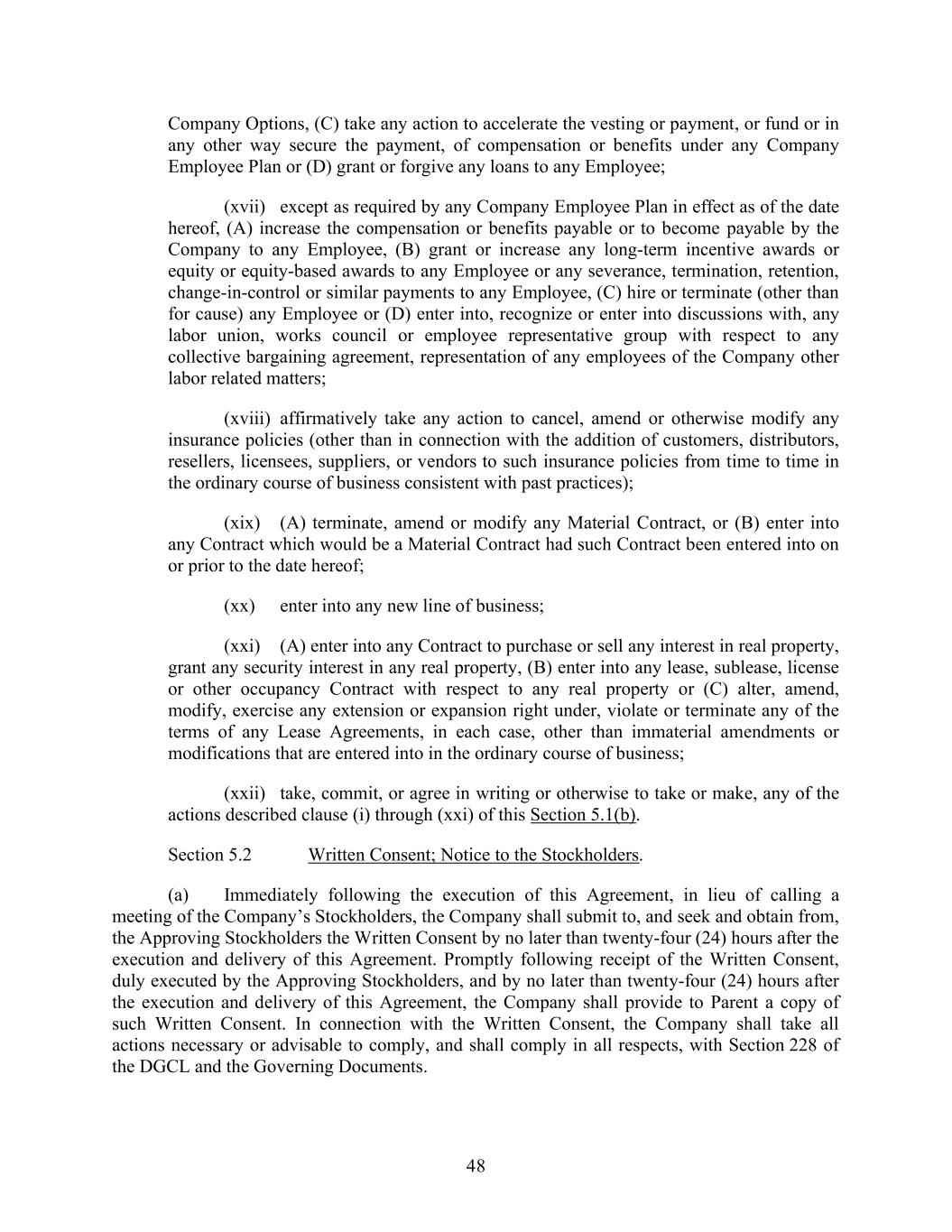 48 Company Options, (C) take any action to accelerate the vesting or payment, or fund or in any other way secure the payment, of compensation or benefits under any Company Employee Plan or (D) grant or forgive any loans to any Employee; (xvii) except as required by any Company Employee Plan in effect as of the date hereof, (A) increase the compensation or benefits payable or to become payable by the Company to any Employee, (B) grant or increase any long-term incentive awards or equity or equity-based awards to any Employee or any severance, termination, retention, change-in-control or similar payments to any Employee, (C) hire or terminate (other than for cause) any Employee or (D) enter into, recognize or enter into discussions with, any labor union, works council or employee representative group with respect to any collective bargaining agreement, representation of any employees of the Company other labor related matters; (xviii) affirmatively take any action to cancel, amend or otherwise modify any insurance policies (other than in connection with the addition of customers, distributors, resellers, licensees, suppliers, or vendors to such insurance policies from time to time in the ordinary course of business consistent with past practices); (xix) (A) terminate, amend or modify any Material Contract, or (B) enter into any Contract which would be a Material Contract had such Contract been entered into on or prior to the date hereof; (xx) enter into any new line of business; (xxi) (A) enter into any Contract to purchase or sell any interest in real property, grant any security interest in any real property, (B) enter into any lease, sublease, license or other occupancy Contract with respect to any real property or (C) alter, amend, modify, exercise any extension or expansion right under, violate or terminate any of the terms of any Lease Agreements, in each case, other than immaterial amendments or modifications that are entered into in the ordinary course of business; (xxii) take, commit, or agree in writing or otherwise to take or make, any of the actions described clause (i) through (xxi) of this Section 5.1(b). Section 5.2 Written Consent; Notice to the Stockholders. (a) Immediately following the execution of this Agreement, in lieu of calling a meeting of the Company’s Stockholders, the Company shall submit to, and seek and obtain from, the Approving Stockholders the Written Consent by no later than twenty-four (24) hours after the execution and delivery of this Agreement. Promptly following receipt of the Written Consent, duly executed by the Approving Stockholders, and by no later than twenty-four (24) hours after the execution and delivery of this Agreement, the Company shall provide to Parent a copy of such Written Consent. In connection with the Written Consent, the Company shall take all actions necessary or advisable to comply, and shall comply in all respects, with Section 228 of the DGCL and the Governing Documents.