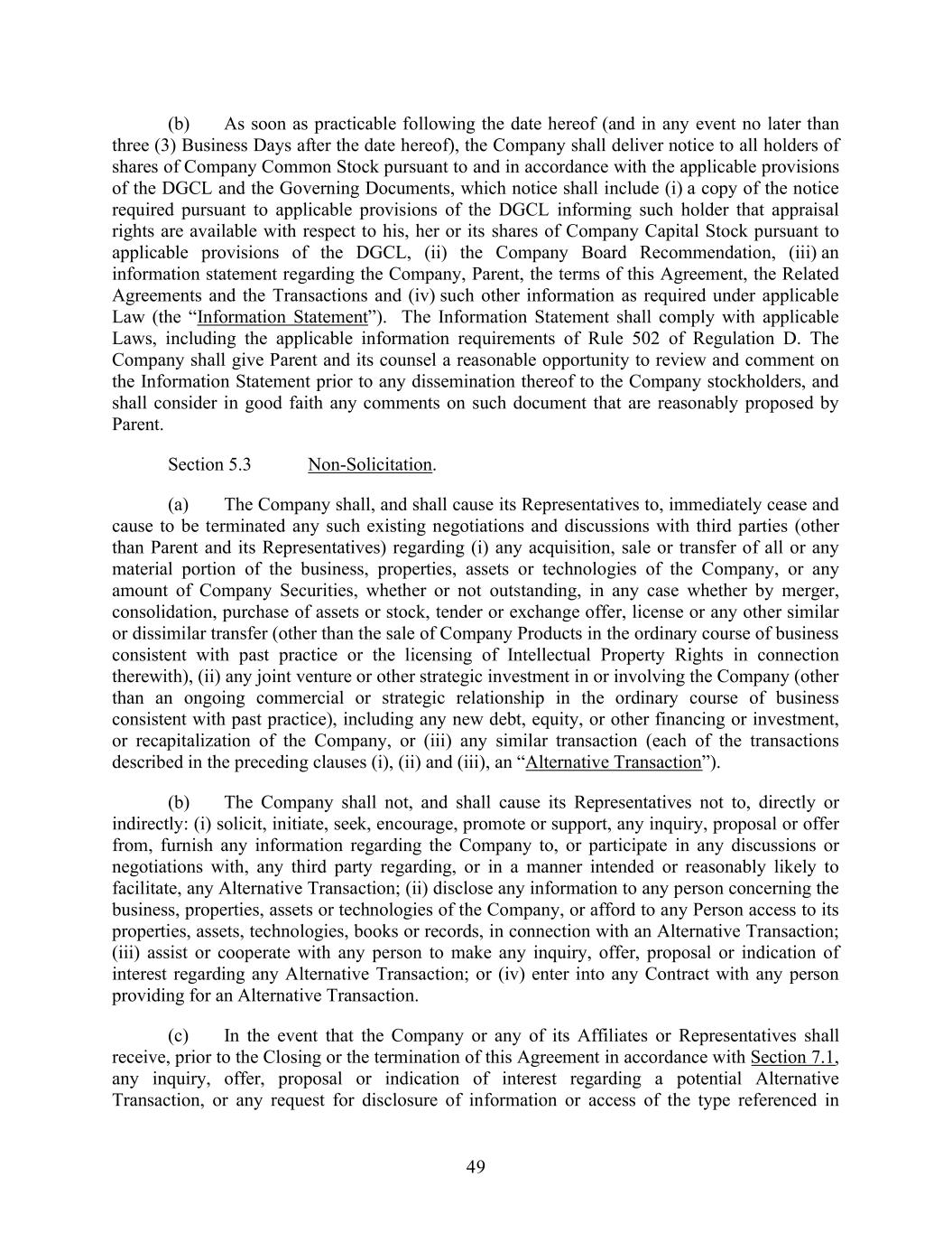 49 (b) As soon as practicable following the date hereof (and in any event no later than three (3) Business Days after the date hereof), the Company shall deliver notice to all holders of shares of Company Common Stock pursuant to and in accordance with the applicable provisions of the DGCL and the Governing Documents, which notice shall include (i) a copy of the notice required pursuant to applicable provisions of the DGCL informing such holder that appraisal rights are available with respect to his, her or its shares of Company Capital Stock pursuant to applicable provisions of the DGCL, (ii) the Company Board Recommendation, (iii) an information statement regarding the Company, Parent, the terms of this Agreement, the Related Agreements and the Transactions and (iv) such other information as required under applicable Law (the “Information Statement”). The Information Statement shall comply with applicable Laws, including the applicable information requirements of Rule 502 of Regulation D. The Company shall give Parent and its counsel a reasonable opportunity to review and comment on the Information Statement prior to any dissemination thereof to the Company stockholders, and shall consider in good faith any comments on such document that are reasonably proposed by Parent. Section 5.3 Non-Solicitation. (a) The Company shall, and shall cause its Representatives to, immediately cease and cause to be terminated any such existing negotiations and discussions with third parties (other than Parent and its Representatives) regarding (i) any acquisition, sale or transfer of all or any material portion of the business, properties, assets or technologies of the Company, or any amount of Company Securities, whether or not outstanding, in any case whether by merger, consolidation, purchase of assets or stock, tender or exchange offer, license or any other similar or dissimilar transfer (other than the sale of Company Products in the ordinary course of business consistent with past practice or the licensing of Intellectual Property Rights in connection therewith), (ii) any joint venture or other strategic investment in or involving the Company (other than an ongoing commercial or strategic relationship in the ordinary course of business consistent with past practice), including any new debt, equity, or other financing or investment, or recapitalization of the Company, or (iii) any similar transaction (each of the transactions described in the preceding clauses (i), (ii) and (iii), an “Alternative Transaction”). (b) The Company shall not, and shall cause its Representatives not to, directly or indirectly: (i) solicit, initiate, seek, encourage, promote or support, any inquiry, proposal or offer from, furnish any information regarding the Company to, or participate in any discussions or negotiations with, any third party regarding, or in a manner intended or reasonably likely to facilitate, any Alternative Transaction; (ii) disclose any information to any person concerning the business, properties, assets or technologies of the Company, or afford to any Person access to its properties, assets, technologies, books or records, in connection with an Alternative Transaction; (iii) assist or cooperate with any person to make any inquiry, offer, proposal or indication of interest regarding any Alternative Transaction; or (iv) enter into any Contract with any person providing for an Alternative Transaction. (c) In the event that the Company or any of its Affiliates or Representatives shall receive, prior to the Closing or the termination of this Agreement in accordance with Section 7.1, any inquiry, offer, proposal or indication of interest regarding a potential Alternative Transaction, or any request for disclosure of information or access of the type referenced in