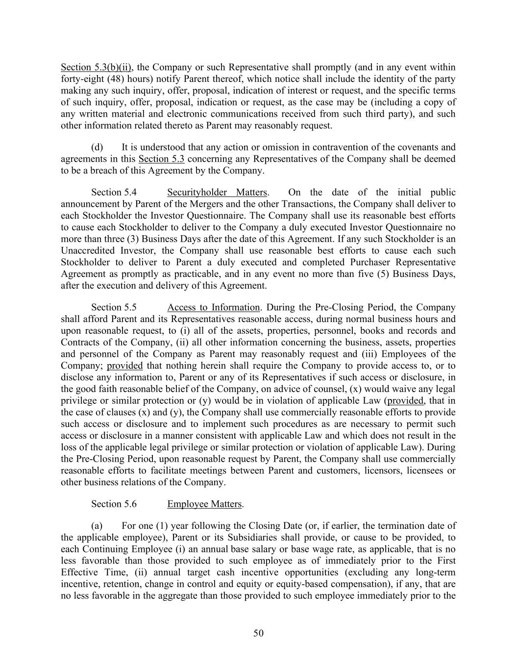 50 Section 5.3(b)(ii), the Company or such Representative shall promptly (and in any event within forty-eight (48) hours) notify Parent thereof, which notice shall include the identity of the party making any such inquiry, offer, proposal, indication of interest or request, and the specific terms of such inquiry, offer, proposal, indication or request, as the case may be (including a copy of any written material and electronic communications received from such third party), and such other information related thereto as Parent may reasonably request. (d) It is understood that any action or omission in contravention of the covenants and agreements in this Section 5.3 concerning any Representatives of the Company shall be deemed to be a breach of this Agreement by the Company. Section 5.4 Securityholder Matters. On the date of the initial public announcement by Parent of the Mergers and the other Transactions, the Company shall deliver to each Stockholder the Investor Questionnaire. The Company shall use its reasonable best efforts to cause each Stockholder to deliver to the Company a duly executed Investor Questionnaire no more than three (3) Business Days after the date of this Agreement. If any such Stockholder is an Unaccredited Investor, the Company shall use reasonable best efforts to cause each such Stockholder to deliver to Parent a duly executed and completed Purchaser Representative Agreement as promptly as practicable, and in any event no more than five (5) Business Days, after the execution and delivery of this Agreement. Section 5.5 Access to Information. During the Pre-Closing Period, the Company shall afford Parent and its Representatives reasonable access, during normal business hours and upon reasonable request, to (i) all of the assets, properties, personnel, books and records and Contracts of the Company, (ii) all other information concerning the business, assets, properties and personnel of the Company as Parent may reasonably request and (iii) Employees of the Company; provided that nothing herein shall require the Company to provide access to, or to disclose any information to, Parent or any of its Representatives if such access or disclosure, in the good faith reasonable belief of the Company, on advice of counsel, (x) would waive any legal privilege or similar protection or (y) would be in violation of applicable Law (provided, that in the case of clauses (x) and (y), the Company shall use commercially reasonable efforts to provide such access or disclosure and to implement such procedures as are necessary to permit such access or disclosure in a manner consistent with applicable Law and which does not result in the loss of the applicable legal privilege or similar protection or violation of applicable Law). During the Pre-Closing Period, upon reasonable request by Parent, the Company shall use commercially reasonable efforts to facilitate meetings between Parent and customers, licensors, licensees or other business relations of the Company. Section 5.6 Employee Matters. (a) For one (1) year following the Closing Date (or, if earlier, the termination date of the applicable employee), Parent or its Subsidiaries shall provide, or cause to be provided, to each Continuing Employee (i) an annual base salary or base wage rate, as applicable, that is no less favorable than those provided to such employee as of immediately prior to the First Effective Time, (ii) annual target cash incentive opportunities (excluding any long-term incentive, retention, change in control and equity or equity-based compensation), if any, that are no less favorable in the aggregate than those provided to such employee immediately prior to the