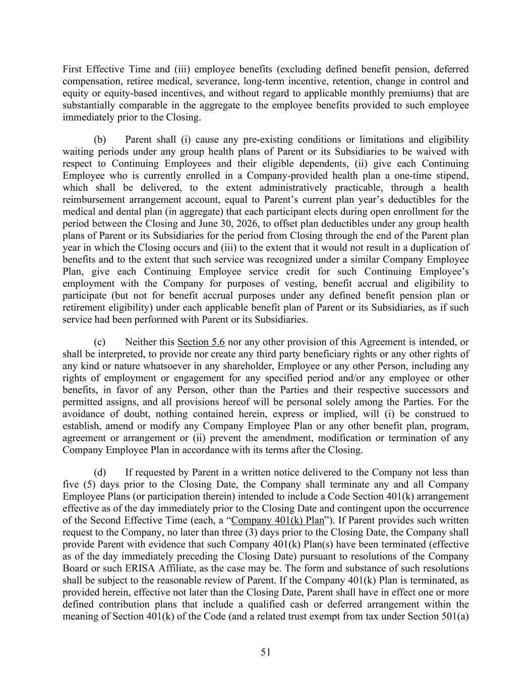 51 First Effective Time and (iii) employee benefits (excluding defined benefit pension, deferred compensation, retiree medical, severance, long-term incentive, retention, change in control and equity or equity-based incentives, and without regard to applicable monthly premiums) that are substantially comparable in the aggregate to the employee benefits provided to such employee immediately prior to the Closing. (b) Parent shall (i) cause any pre-existing conditions or limitations and eligibility waiting periods under any group health plans of Parent or its Subsidiaries to be waived with respect to Continuing Employees and their eligible dependents, (ii) give each Continuing Employee who is currently enrolled in a Company-provided health plan a one-time stipend, which shall be delivered, to the extent administratively practicable, through a health reimbursement arrangement account, equal to Parent’s current plan year’s deductibles for the medical and dental plan (in aggregate) that each participant elects during open enrollment for the period between the Closing and June 30, 2026, to offset plan deductibles under any group health plans of Parent or its Subsidiaries for the period from Closing through the end of the Parent plan year in which the Closing occurs and (iii) to the extent that it would not result in a duplication of benefits and to the extent that such service was recognized under a similar Company Employee Plan, give each Continuing Employee service credit for such Continuing Employee’s employment with the Company for purposes of vesting, benefit accrual and eligibility to participate (but not for benefit accrual purposes under any defined benefit pension plan or retirement eligibility) under each applicable benefit plan of Parent or its Subsidiaries, as if such service had been performed with Parent or its Subsidiaries. (c) Neither this Section 5.6 nor any other provision of this Agreement is intended, or shall be interpreted, to provide nor create any third party beneficiary rights or any other rights of any kind or nature whatsoever in any shareholder, Employee or any other Person, including any rights of employment or engagement for any specified period and/or any employee or other benefits, in favor of any Person, other than the Parties and their respective successors and permitted assigns, and all provisions hereof will be personal solely among the Parties. For the avoidance of doubt, nothing contained herein, express or implied, will (i) be construed to establish, amend or modify any Company Employee Plan or any other benefit plan, program, agreement or arrangement or (ii) prevent the amendment, modification or termination of any Company Employee Plan in accordance with its terms after the Closing. (d) If requested by Parent in a written notice delivered to the Company not less than five (5) days prior to the Closing Date, the Company shall terminate any and all Company Employee Plans (or participation therein) intended to include a Code Section 401(k) arrangement effective as of the day immediately prior to the Closing Date and contingent upon the occurrence of the Second Effective Time (each, a “Company 401(k) Plan”). If Parent provides such written request to the Company, no later than three (3) days prior to the Closing Date, the Company shall provide Parent with evidence that such Company 401(k) Plan(s) have been terminated (effective as of the day immediately preceding the Closing Date) pursuant to resolutions of the Company Board or such ERISA Affiliate, as the case may be. The form and substance of such resolutions shall be subject to the reasonable review of Parent. If the Company 401(k) Plan is terminated, as provided herein, effective not later than the Closing Date, Parent shall have in effect one or more defined contribution plans that include a qualified cash or deferred arrangement within the meaning of Section 401(k) of the Code (and a related trust exempt from tax under Section 501(a)