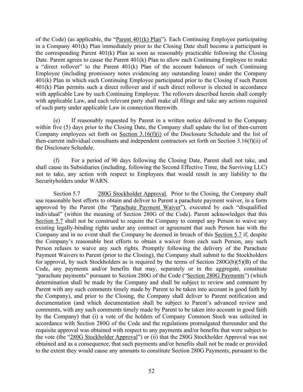 52 of the Code) (as applicable, the “Parent 401(k) Plan”). Each Continuing Employee participating in a Company 401(k) Plan immediately prior to the Closing Date shall become a participant in the corresponding Parent 401(k) Plan as soon as reasonably practicable following the Closing Date. Parent agrees to cause the Parent 401(k) Plan to allow each Continuing Employee to make a “direct rollover” to the Parent 401(k) Plan of the account balances of such Continuing Employee (including promissory notes evidencing any outstanding loans) under the Company 401(k) Plan in which such Continuing Employee participated prior to the Closing if such Parent 401(k) Plan permits such a direct rollover and if such direct rollover is elected in accordance with applicable Law by such Continuing Employee. The rollovers described herein shall comply with applicable Law, and each relevant party shall make all filings and take any actions required of such party under applicable Law in connection therewith. (e) If reasonably requested by Parent in a written notice delivered to the Company within five (5) days prior to the Closing Date, the Company shall update the list of then-current Company employees set forth on Section 3.16(f)(i) of the Disclosure Schedule and the list of then-current individual consultants and independent contractors set forth on Section 3.16(f)(ii) of the Disclosure Schedule. (f) For a period of 90 days following the Closing Date, Parent shall not take, and shall cause its Subsidiaries (including, following the Second Effective Time, the Surviving LLC) not to take, any action with respect to Employees that would result in any liability to the Securityholders under WARN. Section 5.7 280G Stockholder Approval. Prior to the Closing, the Company shall use reasonable best efforts to obtain and deliver to Parent a parachute payment waiver, in a form approved by the Parent (the “Parachute Payment Waiver”), executed by each “disqualified individual” (within the meaning of Section 280G of the Code). Parent acknowledges that this Section 5.7 shall not be construed to require the Company to compel any Person to waive any existing legally-binding rights under any contract or agreement that such Person has with the Company and in no event shall the Company be deemed in breach of this Section 5.7 if, despite the Company’s reasonable best efforts to obtain a waiver from each such Person, any such Person refuses to waive any such rights. Promptly following the delivery of the Parachute Payment Waivers to Parent (prior to the Closing), the Company shall submit to the Stockholders for approval, by such Stockholders as is required by the terms of Section 280G(b)(5)(B) of the Code, any payments and/or benefits that may, separately or in the aggregate, constitute “parachute payments” pursuant to Section 280G of the Code (“Section 280G Payments”) (which determination shall be made by the Company and shall be subject to review and comment by Parent with any such comments timely made by Parent to be taken into account in good faith by the Company), and prior to the Closing, the Company shall deliver to Parent notification and documentation (and which documentation shall be subject to Parent’s advanced review and comments, with any such comments timely made by Parent to be taken into account in good faith by the Company) that (i) a vote of the holders of Company Common Stock was solicited in accordance with Section 280G of the Code and the regulations promulgated thereunder and the requisite approval was obtained with respect to any payments and/or benefits that were subject to the vote (the “280G Stockholder Approval”) or (ii) that the 280G Stockholder Approval was not obtained and as a consequence, that such payments and/or benefits shall not be made or provided to the extent they would cause any amounts to constitute Section 280G Payments, pursuant to the