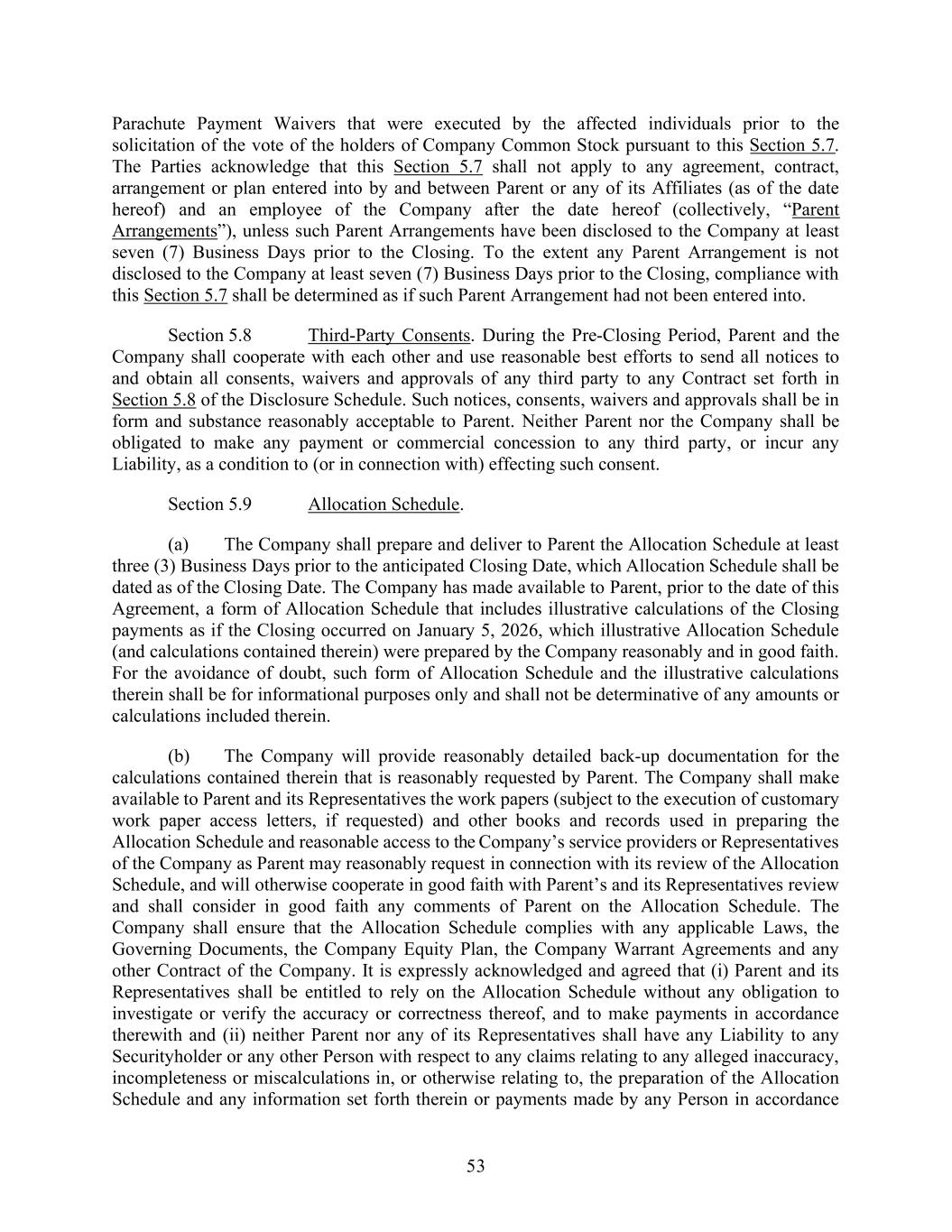 53 Parachute Payment Waivers that were executed by the affected individuals prior to the solicitation of the vote of the holders of Company Common Stock pursuant to this Section 5.7. The Parties acknowledge that this Section 5.7 shall not apply to any agreement, contract, arrangement or plan entered into by and between Parent or any of its Affiliates (as of the date hereof) and an employee of the Company after the date hereof (collectively, “Parent Arrangements”), unless such Parent Arrangements have been disclosed to the Company at least seven (7) Business Days prior to the Closing. To the extent any Parent Arrangement is not disclosed to the Company at least seven (7) Business Days prior to the Closing, compliance with this Section 5.7 shall be determined as if such Parent Arrangement had not been entered into. Section 5.8 Third-Party Consents. During the Pre-Closing Period, Parent and the Company shall cooperate with each other and use reasonable best efforts to send all notices to and obtain all consents, waivers and approvals of any third party to any Contract set forth in Section 5.8 of the Disclosure Schedule. Such notices, consents, waivers and approvals shall be in form and substance reasonably acceptable to Parent. Neither Parent nor the Company shall be obligated to make any payment or commercial concession to any third party, or incur any Liability, as a condition to (or in connection with) effecting such consent. Section 5.9 Allocation Schedule. (a) The Company shall prepare and deliver to Parent the Allocation Schedule at least three (3) Business Days prior to the anticipated Closing Date, which Allocation Schedule shall be dated as of the Closing Date. The Company has made available to Parent, prior to the date of this Agreement, a form of Allocation Schedule that includes illustrative calculations of the Closing payments as if the Closing occurred on January 5, 2026, which illustrative Allocation Schedule (and calculations contained therein) were prepared by the Company reasonably and in good faith. For the avoidance of doubt, such form of Allocation Schedule and the illustrative calculations therein shall be for informational purposes only and shall not be determinative of any amounts or calculations included therein. (b) The Company will provide reasonably detailed back-up documentation for the calculations contained therein that is reasonably requested by Parent. The Company shall make available to Parent and its Representatives the work papers (subject to the execution of customary work paper access letters, if requested) and other books and records used in preparing the Allocation Schedule and reasonable access to the Company’s service providers or Representatives of the Company as Parent may reasonably request in connection with its review of the Allocation Schedule, and will otherwise cooperate in good faith with Parent’s and its Representatives review and shall consider in good faith any comments of Parent on the Allocation Schedule. The Company shall ensure that the Allocation Schedule complies with any applicable Laws, the Governing Documents, the Company Equity Plan, the Company Warrant Agreements and any other Contract of the Company. It is expressly acknowledged and agreed that (i) Parent and its Representatives shall be entitled to rely on the Allocation Schedule without any obligation to investigate or verify the accuracy or correctness thereof, and to make payments in accordance therewith and (ii) neither Parent nor any of its Representatives shall have any Liability to any Securityholder or any other Person with respect to any claims relating to any alleged inaccuracy, incompleteness or miscalculations in, or otherwise relating to, the preparation of the Allocation Schedule and any information set forth therein or payments made by any Person in accordance