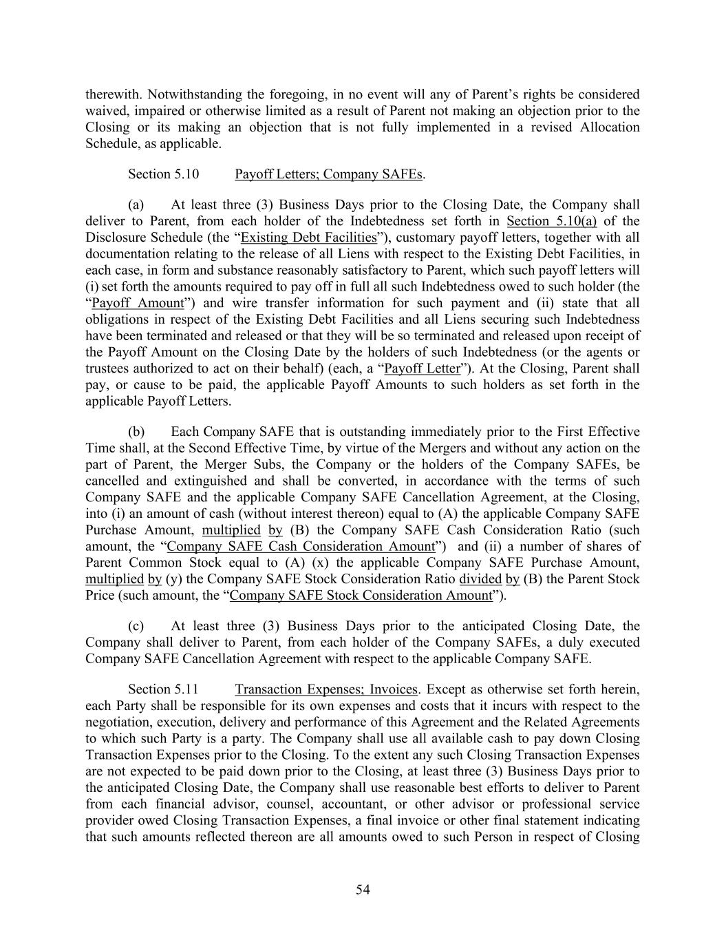 54 therewith. Notwithstanding the foregoing, in no event will any of Parent’s rights be considered waived, impaired or otherwise limited as a result of Parent not making an objection prior to the Closing or its making an objection that is not fully implemented in a revised Allocation Schedule, as applicable. Section 5.10 Payoff Letters; Company SAFEs. (a) At least three (3) Business Days prior to the Closing Date, the Company shall deliver to Parent, from each holder of the Indebtedness set forth in Section 5.10(a) of the Disclosure Schedule (the “Existing Debt Facilities”), customary payoff letters, together with all documentation relating to the release of all Liens with respect to the Existing Debt Facilities, in each case, in form and substance reasonably satisfactory to Parent, which such payoff letters will (i) set forth the amounts required to pay off in full all such Indebtedness owed to such holder (the “Payoff Amount”) and wire transfer information for such payment and (ii) state that all obligations in respect of the Existing Debt Facilities and all Liens securing such Indebtedness have been terminated and released or that they will be so terminated and released upon receipt of the Payoff Amount on the Closing Date by the holders of such Indebtedness (or the agents or trustees authorized to act on their behalf) (each, a “Payoff Letter”). At the Closing, Parent shall pay, or cause to be paid, the applicable Payoff Amounts to such holders as set forth in the applicable Payoff Letters. (b) Each Company SAFE that is outstanding immediately prior to the First Effective Time shall, at the Second Effective Time, by virtue of the Mergers and without any action on the part of Parent, the Merger Subs, the Company or the holders of the Company SAFEs, be cancelled and extinguished and shall be converted, in accordance with the terms of such Company SAFE and the applicable Company SAFE Cancellation Agreement, at the Closing, into (i) an amount of cash (without interest thereon) equal to (A) the applicable Company SAFE Purchase Amount, multiplied by (B) the Company SAFE Cash Consideration Ratio (such amount, the “Company SAFE Cash Consideration Amount”) and (ii) a number of shares of Parent Common Stock equal to (A) (x) the applicable Company SAFE Purchase Amount, multiplied by (y) the Company SAFE Stock Consideration Ratio divided by (B) the Parent Stock Price (such amount, the “Company SAFE Stock Consideration Amount”). (c) At least three (3) Business Days prior to the anticipated Closing Date, the Company shall deliver to Parent, from each holder of the Company SAFEs, a duly executed Company SAFE Cancellation Agreement with respect to the applicable Company SAFE. Section 5.11 Transaction Expenses; Invoices. Except as otherwise set forth herein, each Party shall be responsible for its own expenses and costs that it incurs with respect to the negotiation, execution, delivery and performance of this Agreement and the Related Agreements to which such Party is a party. The Company shall use all available cash to pay down Closing Transaction Expenses prior to the Closing. To the extent any such Closing Transaction Expenses are not expected to be paid down prior to the Closing, at least three (3) Business Days prior to the anticipated Closing Date, the Company shall use reasonable best efforts to deliver to Parent from each financial advisor, counsel, accountant, or other advisor or professional service provider owed Closing Transaction Expenses, a final invoice or other final statement indicating that such amounts reflected thereon are all amounts owed to such Person in respect of Closing
