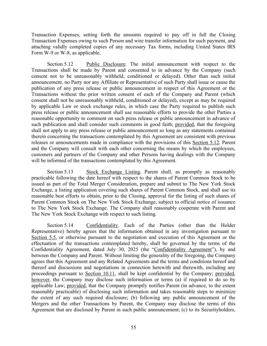 55 Transaction Expenses, setting forth the amounts required to pay off in full the Closing Transaction Expenses owing to such Person and wire transfer information for such payment, and attaching validly completed copies of any necessary Tax forms, including United States IRS Form W-9 or W-8, as applicable. Section 5.12 Public Disclosure. The initial announcement with respect to the Transactions shall be made by Parent and consented to in advance by the Company (such consent not to be unreasonably withheld, conditioned or delayed). Other than such initial announcement, no Party nor any Affiliate or Representative of such Party shall issue or cause the publication of any press release or public announcement in respect of this Agreement or the Transactions without the prior written consent of each of the Company and Parent (which consent shall not be unreasonably withheld, conditioned or delayed), except as may be required by applicable Law or stock exchange rules, in which case the Party required to publish such press release or public announcement shall use reasonable efforts to provide the other Parties a reasonable opportunity to comment on such press release or public announcement in advance of such publication and shall consider such comments in good faith; provided, that the foregoing shall not apply to any press release or public announcement so long as any statements contained therein concerning the transactions contemplated by this Agreement are consistent with previous releases or announcements made in compliance with the provisions of this Section 5.12. Parent and the Company will consult with each other concerning the means by which the employees, customers and partners of the Company and other Persons having dealings with the Company will be informed of the transactions contemplated by this Agreement. Section 5.13 Stock Exchange Listing. Parent shall, as promptly as reasonably practicable following the date hereof with respect to the shares of Parent Common Stock to be issued as part of the Total Merger Consideration, prepare and submit to The New York Stock Exchange, a listing application covering such shares of Parent Common Stock, and shall use its reasonable best efforts to obtain, prior to the Closing, approval for the listing of such shares of Parent Common Stock on The New York Stock Exchange, subject to official notice of issuance to The New York Stock Exchange. The Company shall reasonably cooperate with Parent and The New York Stock Exchange with respect to such listing. Section 5.14 Confidentiality. Each of the Parties (other than the Holder Representative) hereby agrees that the information obtained in any investigation pursuant to Section 5.5, or otherwise pursuant to the negotiation and execution of this Agreement or the effectuation of the transactions contemplated hereby, shall be governed by the terms of the Confidentiality Agreement, dated July 30, 2025 (the “Confidentiality Agreement”), by and between the Company and Parent. Without limiting the generality of the foregoing, the Company agrees that this Agreement and any Related Agreements and the terms and conditions hereof and thereof and discussions and negotiations in connection herewith and therewith, including any proceedings pursuant to Section 10.11, shall be kept confidential by the Company; provided, however, the Company may disclose such information or terms (a) if required to do so by applicable Law; provided, that the Company promptly notifies Parent (in advance, to the extent reasonably practicable) of disclosing such information and takes reasonable steps to minimize the extent of any such required disclosure; (b) following any public announcement of the Mergers and the other Transactions by Parent, the Company may disclose the terms of this Agreement that are disclosed by Parent in such public announcement; (c) to its Securityholders,