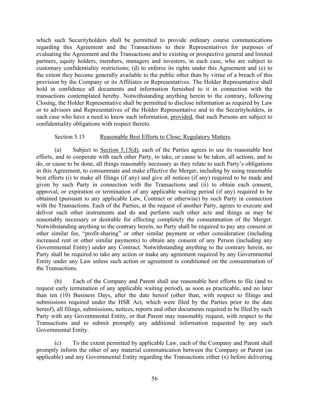 56 which such Securityholders shall be permitted to provide ordinary course communications regarding this Agreement and the Transactions to their Representatives for purposes of evaluating the Agreement and the Transactions and to existing or prospective general and limited partners, equity holders, members, managers and investors, in each case, who are subject to customary confidentiality restrictions; (d) to enforce its rights under this Agreement and (e) to the extent they become generally available to the public other than by virtue of a breach of this provision by the Company or its Affiliates or Representatives. The Holder Representative shall hold in confidence all documents and information furnished to it in connection with the transactions contemplated hereby. Notwithstanding anything herein to the contrary, following Closing, the Holder Representative shall be permitted to disclose information as required by Law or to advisors and Representatives of the Holder Representative and to the Securityholders, in each case who have a need to know such information, provided, that such Persons are subject to confidentiality obligations with respect thereto. Section 5.15 Reasonable Best Efforts to Close; Regulatory Matters. (a) Subject to Section 5.15(d), each of the Parties agrees to use its reasonable best efforts, and to cooperate with each other Party, to take, or cause to be taken, all actions, and to do, or cause to be done, all things reasonably necessary as they relate to such Party’s obligations in this Agreement, to consummate and make effective the Merger, including by using reasonable best efforts (i) to make all filings (if any) and give all notices (if any) required to be made and given by such Party in connection with the Transactions and (ii) to obtain each consent, approval, or expiration or termination of any applicable waiting period (if any) required to be obtained (pursuant to any applicable Law, Contract or otherwise) by such Party in connection with the Transactions. Each of the Parties, at the request of another Party, agrees to execute and deliver such other instruments and do and perform such other acts and things as may be reasonably necessary or desirable for effecting completely the consummation of the Merger. Notwithstanding anything to the contrary herein, no Party shall be required to pay any consent or other similar fee, “profit-sharing” or other similar payment or other consideration (including increased rent or other similar payments) to obtain any consent of any Person (including any Governmental Entity) under any Contract. Notwithstanding anything to the contrary herein, no Party shall be required to take any action or make any agreement required by any Governmental Entity under any Law unless such action or agreement is conditioned on the consummation of the Transactions. (b) Each of the Company and Parent shall use reasonable best efforts to file (and to request early termination of any applicable waiting period), as soon as practicable, and no later than ten (10) Business Days, after the date hereof (other than, with respect to filings and submissions required under the HSR Act, which were filed by the Parties prior to the date hereof), all filings, submissions, notices, reports and other documents required to be filed by such Party with any Governmental Entity, or that Parent may reasonably request, with respect to the Transactions and to submit promptly any additional information requested by any such Governmental Entity. (c) To the extent permitted by applicable Law, each of the Company and Parent shall promptly inform the other of any material communication between the Company or Parent (as applicable) and any Governmental Entity regarding the Transactions either (x) before delivering