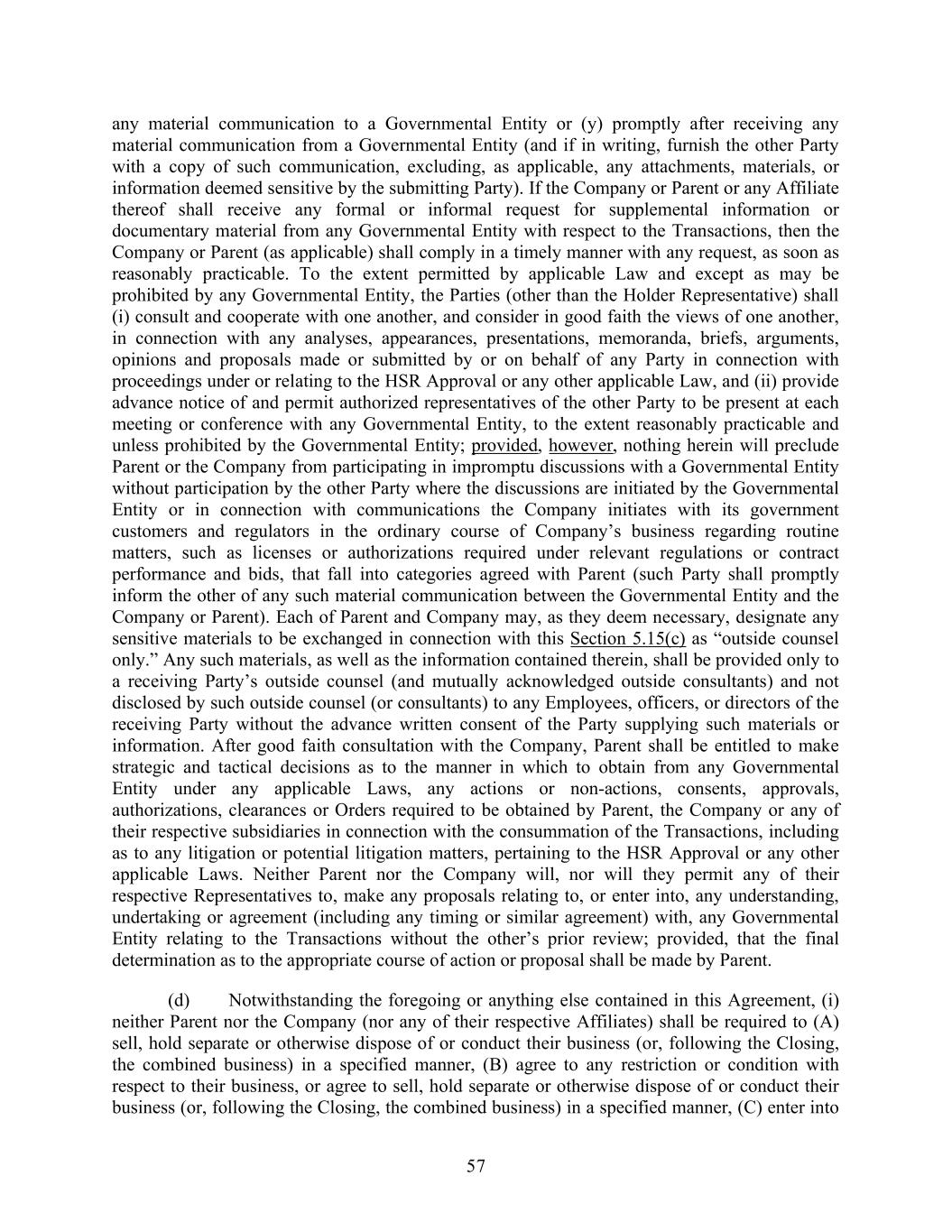 57 any material communication to a Governmental Entity or (y) promptly after receiving any material communication from a Governmental Entity (and if in writing, furnish the other Party with a copy of such communication, excluding, as applicable, any attachments, materials, or information deemed sensitive by the submitting Party). If the Company or Parent or any Affiliate thereof shall receive any formal or informal request for supplemental information or documentary material from any Governmental Entity with respect to the Transactions, then the Company or Parent (as applicable) shall comply in a timely manner with any request, as soon as reasonably practicable. To the extent permitted by applicable Law and except as may be prohibited by any Governmental Entity, the Parties (other than the Holder Representative) shall (i) consult and cooperate with one another, and consider in good faith the views of one another, in connection with any analyses, appearances, presentations, memoranda, briefs, arguments, opinions and proposals made or submitted by or on behalf of any Party in connection with proceedings under or relating to the HSR Approval or any other applicable Law, and (ii) provide advance notice of and permit authorized representatives of the other Party to be present at each meeting or conference with any Governmental Entity, to the extent reasonably practicable and unless prohibited by the Governmental Entity; provided, however, nothing herein will preclude Parent or the Company from participating in impromptu discussions with a Governmental Entity without participation by the other Party where the discussions are initiated by the Governmental Entity or in connection with communications the Company initiates with its government customers and regulators in the ordinary course of Company’s business regarding routine matters, such as licenses or authorizations required under relevant regulations or contract performance and bids, that fall into categories agreed with Parent (such Party shall promptly inform the other of any such material communication between the Governmental Entity and the Company or Parent). Each of Parent and Company may, as they deem necessary, designate any sensitive materials to be exchanged in connection with this Section 5.15(c) as “outside counsel only.” Any such materials, as well as the information contained therein, shall be provided only to a receiving Party’s outside counsel (and mutually acknowledged outside consultants) and not disclosed by such outside counsel (or consultants) to any Employees, officers, or directors of the receiving Party without the advance written consent of the Party supplying such materials or information. After good faith consultation with the Company, Parent shall be entitled to make strategic and tactical decisions as to the manner in which to obtain from any Governmental Entity under any applicable Laws, any actions or non-actions, consents, approvals, authorizations, clearances or Orders required to be obtained by Parent, the Company or any of their respective subsidiaries in connection with the consummation of the Transactions, including as to any litigation or potential litigation matters, pertaining to the HSR Approval or any other applicable Laws. Neither Parent nor the Company will, nor will they permit any of their respective Representatives to, make any proposals relating to, or enter into, any understanding, undertaking or agreement (including any timing or similar agreement) with, any Governmental Entity relating to the Transactions without the other’s prior review; provided, that the final determination as to the appropriate course of action or proposal shall be made by Parent. (d) Notwithstanding the foregoing or anything else contained in this Agreement, (i) neither Parent nor the Company (nor any of their respective Affiliates) shall be required to (A) sell, hold separate or otherwise dispose of or conduct their business (or, following the Closing, the combined business) in a specified manner, (B) agree to any restriction or condition with respect to their business, or agree to sell, hold separate or otherwise dispose of or conduct their business (or, following the Closing, the combined business) in a specified manner, (C) enter into