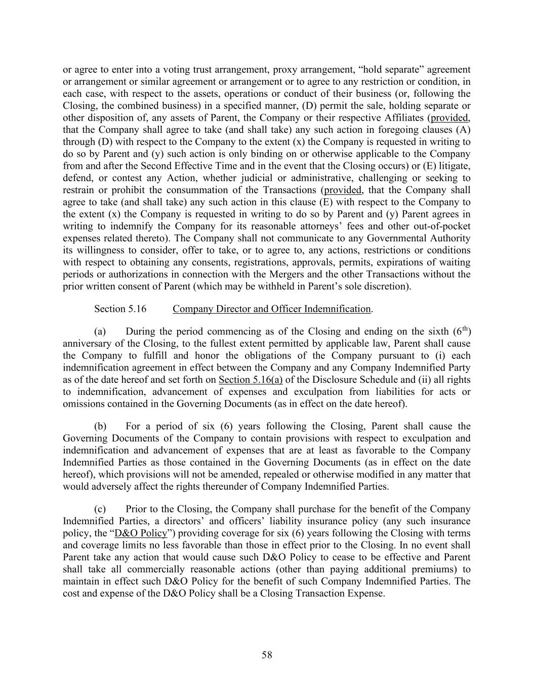 58 or agree to enter into a voting trust arrangement, proxy arrangement, “hold separate” agreement or arrangement or similar agreement or arrangement or to agree to any restriction or condition, in each case, with respect to the assets, operations or conduct of their business (or, following the Closing, the combined business) in a specified manner, (D) permit the sale, holding separate or other disposition of, any assets of Parent, the Company or their respective Affiliates (provided, that the Company shall agree to take (and shall take) any such action in foregoing clauses (A) through (D) with respect to the Company to the extent (x) the Company is requested in writing to do so by Parent and (y) such action is only binding on or otherwise applicable to the Company from and after the Second Effective Time and in the event that the Closing occurs) or (E) litigate, defend, or contest any Action, whether judicial or administrative, challenging or seeking to restrain or prohibit the consummation of the Transactions (provided, that the Company shall agree to take (and shall take) any such action in this clause (E) with respect to the Company to the extent (x) the Company is requested in writing to do so by Parent and (y) Parent agrees in writing to indemnify the Company for its reasonable attorneys’ fees and other out-of-pocket expenses related thereto). The Company shall not communicate to any Governmental Authority its willingness to consider, offer to take, or to agree to, any actions, restrictions or conditions with respect to obtaining any consents, registrations, approvals, permits, expirations of waiting periods or authorizations in connection with the Mergers and the other Transactions without the prior written consent of Parent (which may be withheld in Parent’s sole discretion). Section 5.16 Company Director and Officer Indemnification. (a) During the period commencing as of the Closing and ending on the sixth (6th) anniversary of the Closing, to the fullest extent permitted by applicable law, Parent shall cause the Company to fulfill and honor the obligations of the Company pursuant to (i) each indemnification agreement in effect between the Company and any Company Indemnified Party as of the date hereof and set forth on Section 5.16(a) of the Disclosure Schedule and (ii) all rights to indemnification, advancement of expenses and exculpation from liabilities for acts or omissions contained in the Governing Documents (as in effect on the date hereof). (b) For a period of six (6) years following the Closing, Parent shall cause the Governing Documents of the Company to contain provisions with respect to exculpation and indemnification and advancement of expenses that are at least as favorable to the Company Indemnified Parties as those contained in the Governing Documents (as in effect on the date hereof), which provisions will not be amended, repealed or otherwise modified in any matter that would adversely affect the rights thereunder of Company Indemnified Parties. (c) Prior to the Closing, the Company shall purchase for the benefit of the Company Indemnified Parties, a directors’ and officers’ liability insurance policy (any such insurance policy, the “D&O Policy”) providing coverage for six (6) years following the Closing with terms and coverage limits no less favorable than those in effect prior to the Closing. In no event shall Parent take any action that would cause such D&O Policy to cease to be effective and Parent shall take all commercially reasonable actions (other than paying additional premiums) to maintain in effect such D&O Policy for the benefit of such Company Indemnified Parties. The cost and expense of the D&O Policy shall be a Closing Transaction Expense.