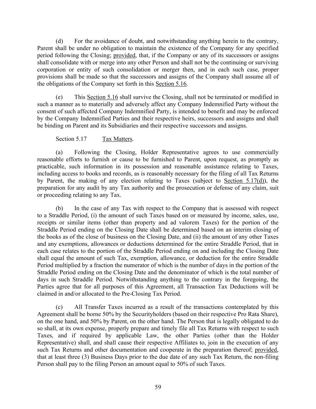 59 (d) For the avoidance of doubt, and notwithstanding anything herein to the contrary, Parent shall be under no obligation to maintain the existence of the Company for any specified period following the Closing; provided, that, if the Company or any of its successors or assigns shall consolidate with or merge into any other Person and shall not be the continuing or surviving corporation or entity of such consolidation or merger then, and in each such case, proper provisions shall be made so that the successors and assigns of the Company shall assume all of the obligations of the Company set forth in this Section 5.16. (e) This Section 5.16 shall survive the Closing, shall not be terminated or modified in such a manner as to materially and adversely affect any Company Indemnified Party without the consent of such affected Company Indemnified Party, is intended to benefit and may be enforced by the Company Indemnified Parties and their respective heirs, successors and assigns and shall be binding on Parent and its Subsidiaries and their respective successors and assigns. Section 5.17 Tax Matters. (a) Following the Closing, Holder Representative agrees to use commercially reasonable efforts to furnish or cause to be furnished to Parent, upon request, as promptly as practicable, such information in its possession and reasonable assistance relating to Taxes, including access to books and records, as is reasonably necessary for the filing of all Tax Returns by Parent, the making of any election relating to Taxes (subject to Section 5.17(d)), the preparation for any audit by any Tax authority and the prosecution or defense of any claim, suit or proceeding relating to any Tax. (b) In the case of any Tax with respect to the Company that is assessed with respect to a Straddle Period, (i) the amount of such Taxes based on or measured by income, sales, use, receipts or similar items (other than property and ad valorem Taxes) for the portion of the Straddle Period ending on the Closing Date shall be determined based on an interim closing of the books as of the close of business on the Closing Date, and (ii) the amount of any other Taxes and any exemptions, allowances or deductions determined for the entire Straddle Period, that in each case relates to the portion of the Straddle Period ending on and including the Closing Date shall equal the amount of such Tax, exemption, allowance, or deduction for the entire Straddle Period multiplied by a fraction the numerator of which is the number of days in the portion of the Straddle Period ending on the Closing Date and the denominator of which is the total number of days in such Straddle Period. Notwithstanding anything to the contrary in the foregoing, the Parties agree that for all purposes of this Agreement, all Transaction Tax Deductions will be claimed in and/or allocated to the Pre-Closing Tax Period. (c) All Transfer Taxes incurred as a result of the transactions contemplated by this Agreement shall be borne 50% by the Securityholders (based on their respective Pro Rata Share), on the one hand, and 50% by Parent, on the other hand. The Person that is legally obligated to do so shall, at its own expense, properly prepare and timely file all Tax Returns with respect to such Taxes, and if required by applicable Law, the other Parties (other than the Holder Representative) shall, and shall cause their respective Affiliates to, join in the execution of any such Tax Returns and other documentation and cooperate in the preparation thereof; provided, that at least three (3) Business Days prior to the due date of any such Tax Return, the non-filing Person shall pay to the filing Person an amount equal to 50% of such Taxes.