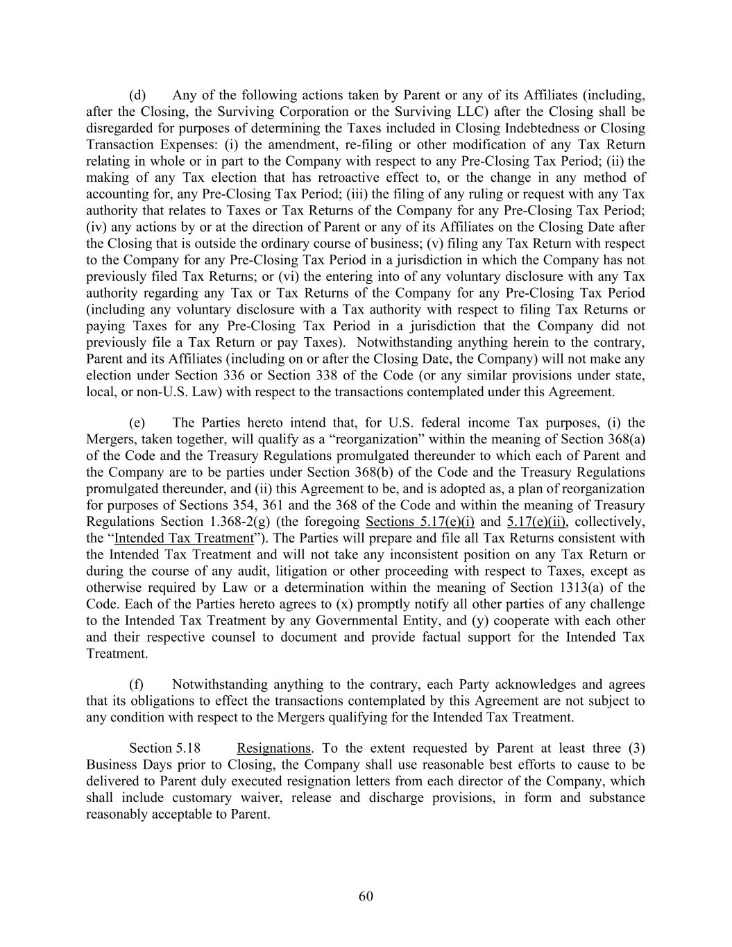 60 (d) Any of the following actions taken by Parent or any of its Affiliates (including, after the Closing, the Surviving Corporation or the Surviving LLC) after the Closing shall be disregarded for purposes of determining the Taxes included in Closing Indebtedness or Closing Transaction Expenses: (i) the amendment, re-filing or other modification of any Tax Return relating in whole or in part to the Company with respect to any Pre-Closing Tax Period; (ii) the making of any Tax election that has retroactive effect to, or the change in any method of accounting for, any Pre-Closing Tax Period; (iii) the filing of any ruling or request with any Tax authority that relates to Taxes or Tax Returns of the Company for any Pre-Closing Tax Period; (iv) any actions by or at the direction of Parent or any of its Affiliates on the Closing Date after the Closing that is outside the ordinary course of business; (v) filing any Tax Return with respect to the Company for any Pre-Closing Tax Period in a jurisdiction in which the Company has not previously filed Tax Returns; or (vi) the entering into of any voluntary disclosure with any Tax authority regarding any Tax or Tax Returns of the Company for any Pre-Closing Tax Period (including any voluntary disclosure with a Tax authority with respect to filing Tax Returns or paying Taxes for any Pre-Closing Tax Period in a jurisdiction that the Company did not previously file a Tax Return or pay Taxes). Notwithstanding anything herein to the contrary, Parent and its Affiliates (including on or after the Closing Date, the Company) will not make any election under Section 336 or Section 338 of the Code (or any similar provisions under state, local, or non-U.S. Law) with respect to the transactions contemplated under this Agreement. (e) The Parties hereto intend that, for U.S. federal income Tax purposes, (i) the Mergers, taken together, will qualify as a “reorganization” within the meaning of Section 368(a) of the Code and the Treasury Regulations promulgated thereunder to which each of Parent and the Company are to be parties under Section 368(b) of the Code and the Treasury Regulations promulgated thereunder, and (ii) this Agreement to be, and is adopted as, a plan of reorganization for purposes of Sections 354, 361 and the 368 of the Code and within the meaning of Treasury Regulations Section 1.368-2(g) (the foregoing Sections 5.17(e)(i) and 5.17(e)(ii), collectively, the “Intended Tax Treatment”). The Parties will prepare and file all Tax Returns consistent with the Intended Tax Treatment and will not take any inconsistent position on any Tax Return or during the course of any audit, litigation or other proceeding with respect to Taxes, except as otherwise required by Law or a determination within the meaning of Section 1313(a) of the Code. Each of the Parties hereto agrees to (x) promptly notify all other parties of any challenge to the Intended Tax Treatment by any Governmental Entity, and (y) cooperate with each other and their respective counsel to document and provide factual support for the Intended Tax Treatment. (f) Notwithstanding anything to the contrary, each Party acknowledges and agrees that its obligations to effect the transactions contemplated by this Agreement are not subject to any condition with respect to the Mergers qualifying for the Intended Tax Treatment. Section 5.18 Resignations. To the extent requested by Parent at least three (3) Business Days prior to Closing, the Company shall use reasonable best efforts to cause to be delivered to Parent duly executed resignation letters from each director of the Company, which shall include customary waiver, release and discharge provisions, in form and substance reasonably acceptable to Parent.