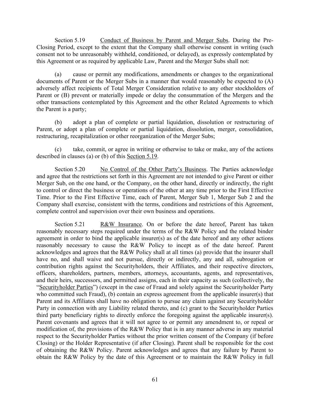 61 Section 5.19 Conduct of Business by Parent and Merger Subs. During the Pre- Closing Period, except to the extent that the Company shall otherwise consent in writing (such consent not to be unreasonably withheld, conditioned, or delayed), as expressly contemplated by this Agreement or as required by applicable Law, Parent and the Merger Subs shall not: (a) cause or permit any modifications, amendments or changes to the organizational documents of Parent or the Merger Subs in a manner that would reasonably be expected to (A) adversely affect recipients of Total Merger Consideration relative to any other stockholders of Parent or (B) prevent or materially impede or delay the consummation of the Mergers and the other transactions contemplated by this Agreement and the other Related Agreements to which the Parent is a party; (b) adopt a plan of complete or partial liquidation, dissolution or restructuring of Parent, or adopt a plan of complete or partial liquidation, dissolution, merger, consolidation, restructuring, recapitalization or other reorganization of the Merger Subs; (c) take, commit, or agree in writing or otherwise to take or make, any of the actions described in clauses (a) or (b) of this Section 5.19. Section 5.20 No Control of the Other Party’s Business. The Parties acknowledge and agree that the restrictions set forth in this Agreement are not intended to give Parent or either Merger Sub, on the one hand, or the Company, on the other hand, directly or indirectly, the right to control or direct the business or operations of the other at any time prior to the First Effective Time. Prior to the First Effective Time, each of Parent, Merger Sub 1, Merger Sub 2 and the Company shall exercise, consistent with the terms, conditions and restrictions of this Agreement, complete control and supervision over their own business and operations. Section 5.21 R&W Insurance. On or before the date hereof, Parent has taken reasonably necessary steps required under the terms of the R&W Policy and the related binder agreement in order to bind the applicable insurer(s) as of the date hereof and any other actions reasonably necessary to cause the R&W Policy to incept as of the date hereof. Parent acknowledges and agrees that the R&W Policy shall at all times (a) provide that the insurer shall have no, and shall waive and not pursue, directly or indirectly, any and all, subrogation or contribution rights against the Securityholders, their Affiliates, and their respective directors, officers, shareholders, partners, members, attorneys, accountants, agents, and representatives, and their heirs, successors, and permitted assigns, each in their capacity as such (collectively, the “Securityholder Parties”) (except in the case of Fraud and solely against the Securityholder Party who committed such Fraud), (b) contain an express agreement from the applicable insurer(s) that Parent and its Affiliates shall have no obligation to pursue any claim against any Securityholder Party in connection with any Liability related thereto, and (c) grant to the Securityholder Parties third party beneficiary rights to directly enforce the foregoing against the applicable insurer(s). Parent covenants and agrees that it will not agree to or permit any amendment to, or repeal or modification of, the provisions of the R&W Policy that is in any manner adverse in any material respect to the Securityholder Parties without the prior written consent of the Company (if before Closing) or the Holder Representative (if after Closing). Parent shall be responsible for the cost of obtaining the R&W Policy. Parent acknowledges and agrees that any failure by Parent to obtain the R&W Policy by the date of this Agreement or to maintain the R&W Policy in full